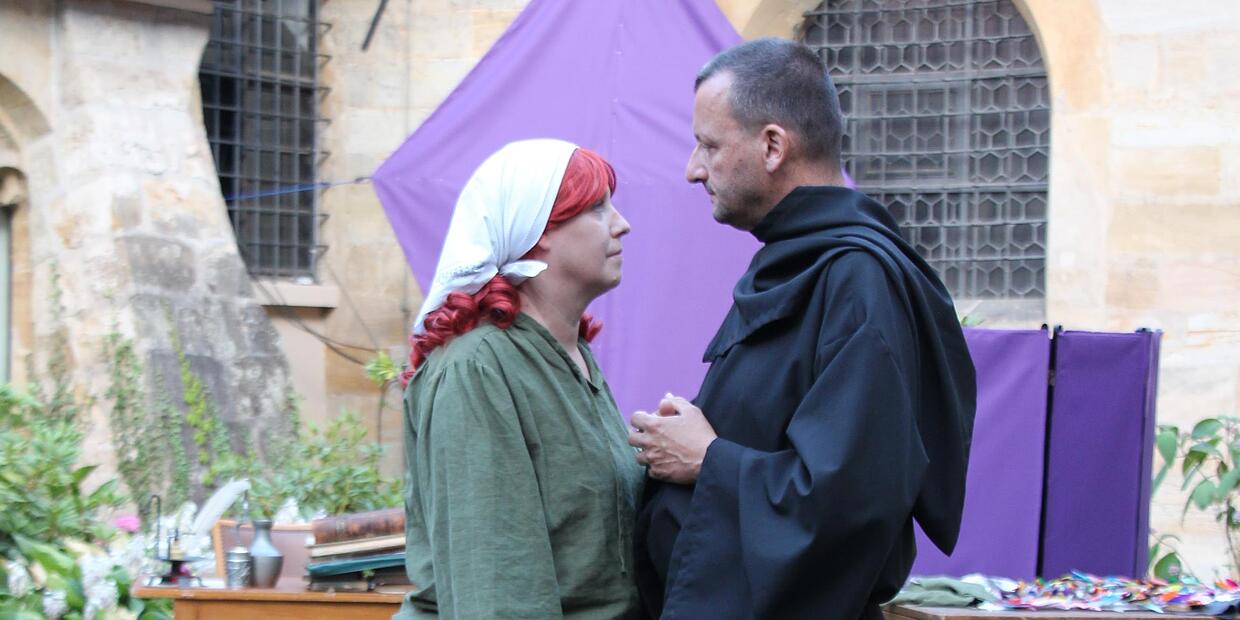 – Im Kreuzgang von St. Gangolf wird Simon X. Rosts „Fliegender Mönch“ inszeniert. Eine Hauptfigur: Ein Geistlicher, der plötzlich mit dem Zölibat hadert.