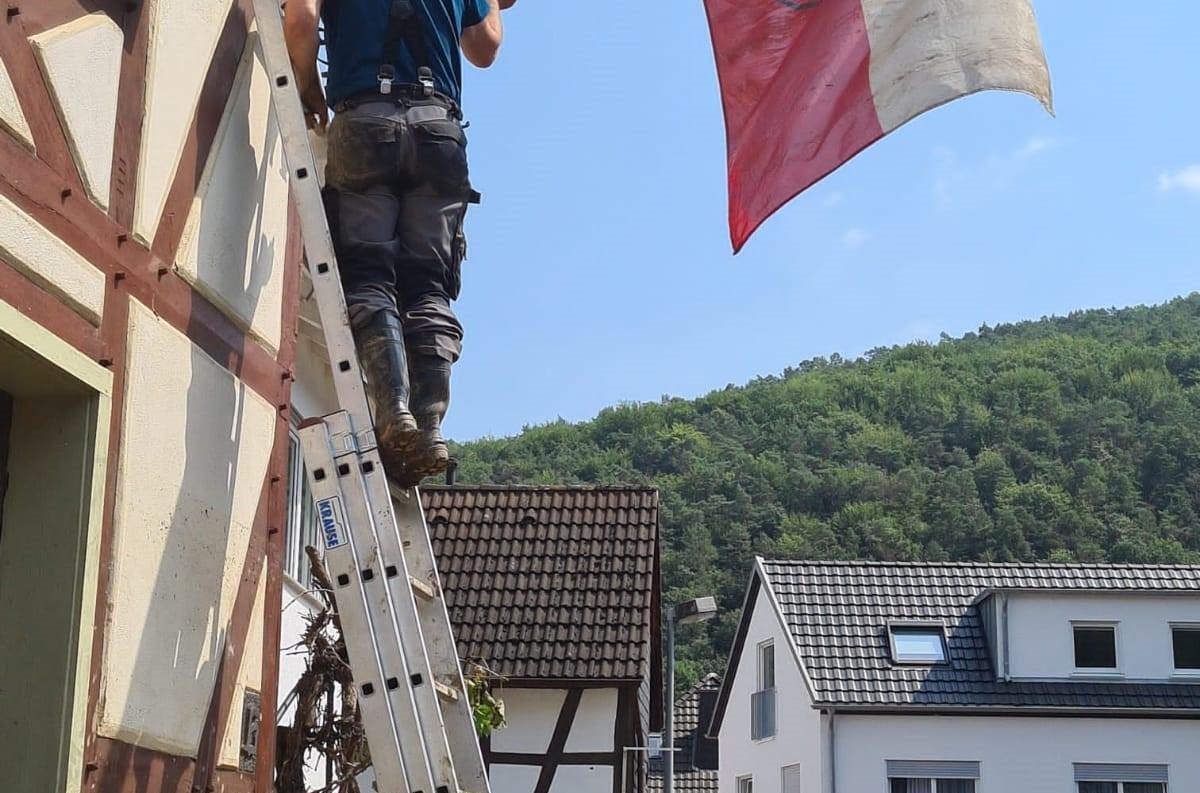 „Ein Zeichen, dass wir nicht aufgeben“: Uwe Jakobs hisst die Ahrweiler Flagge. // Jakobs