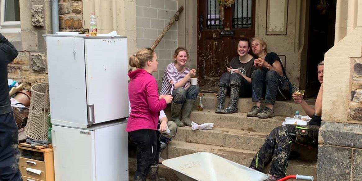 Bloß nicht auch noch das Lachen verlieren: Dieses Foto von Sylvia Jakobs (oben rechts) und anderen Helfern entstand bei einer Pause während der Aufräumarbeiten. // Dominik
