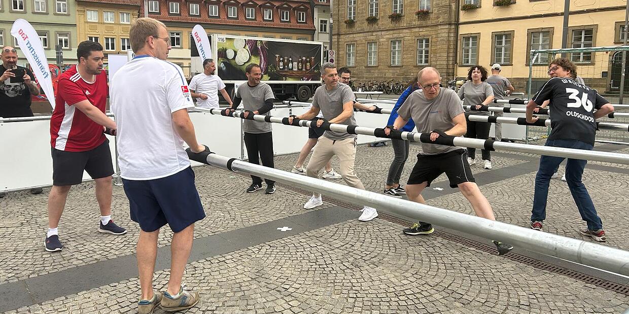 – Während der EM 2024 steht eine Team-Attraktion im Herzen Bambergs. Beim ersten Testspiel bolzen die Sportreporter die Lokalredakteure mit 7:3 auf den Boden der Tatsachen. Alle eint: Spaß und Schweiß.