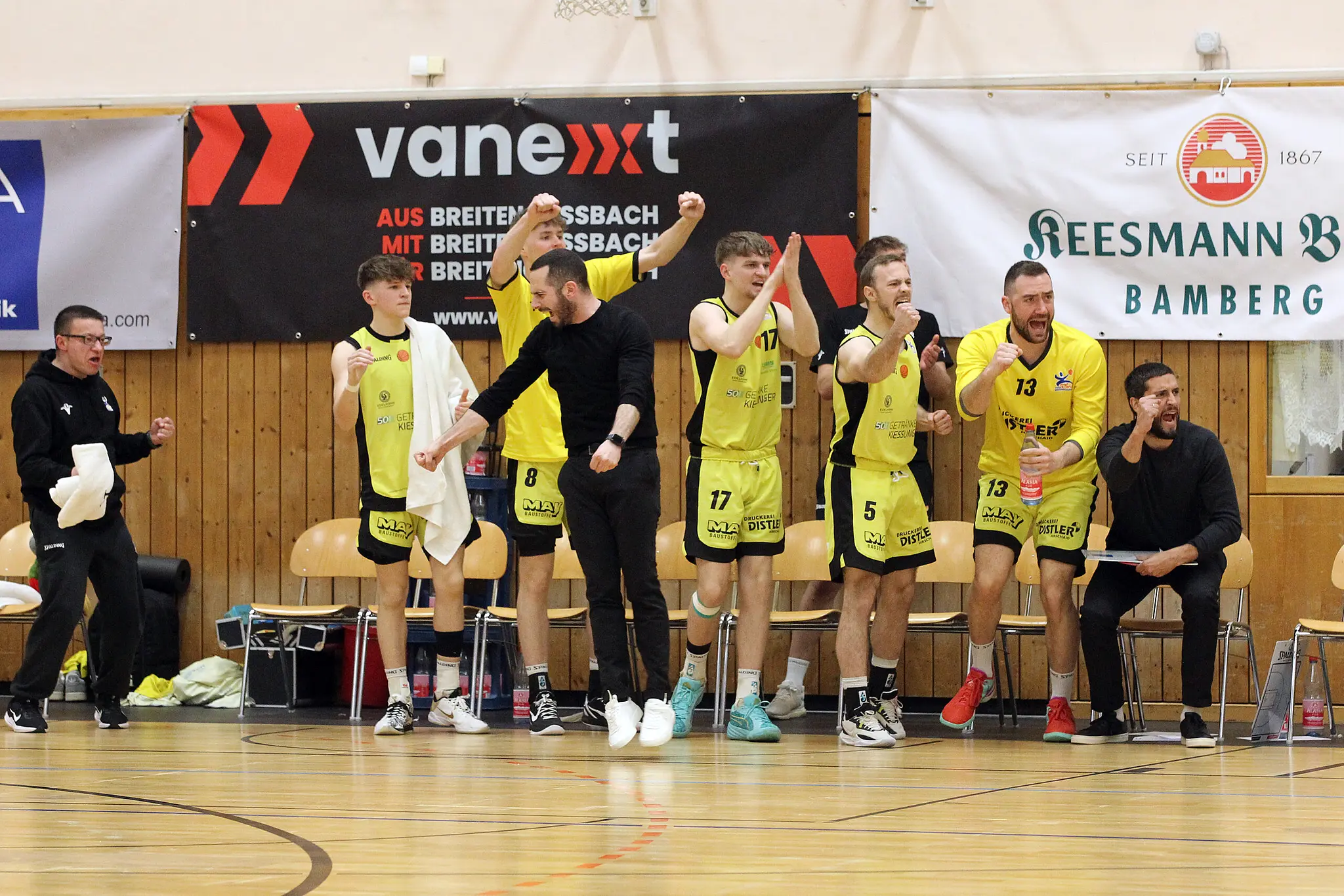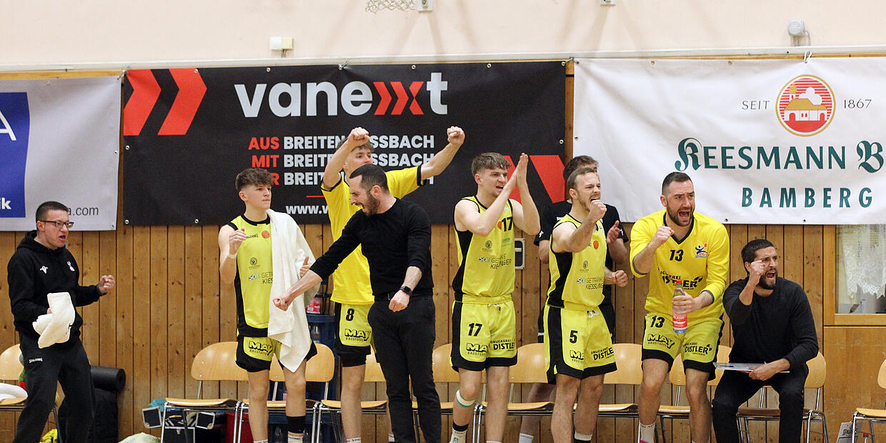 Neuer Regionalliga-Meister Breitengüßbach begießt Titel in der Weinberghalle Hier jubelten die Güßbacher über den Sieg gegen Veitshöchheim vor zwei Wochen. Am Freitag wurde feuchtfröhlich in Ansbach gefeiert. // sportpress von Maximilian Glas TEILEN  13.04.2025 Bamberg – Der TSV Breitengüßbach hat die Überraschung geschafft: Die Mannschaft von Coach Mark Völkl gewinnt auch Spiel 2 in Ansbach und krönt sich nach 2023 erneut zum Regionalliga-Meister. Die Defensive machte den Unterschied. Artikel anhören Sie können uns nicht hören? Diese Funktion können Sie exklusiv mit PLUS nutzen. Erhalten Sie uneingeschränkten Zugriff auf alle Audioinhalte, Artikel und vieles mehr. Vorlesefunktion freischalten Bereits -Zugriff? Jetzt Anmelden Sie haben es wieder getan: Zwei Jahre nach dem Finalerfolg gegen die Ansbach Piranhas entschieden die Breitengüßbacher Regionalliga-Basketballer die Serie gegen die Mittelfranken erneut für sich. Das Team von Trainer Mark Völkl gewann das zweite Finalspiel am Freitagabend in Ansbach mit 77:68 (40:29) und gewann damit die „Best-of-three“-Serie gegen den Favoriten mit 2:0. Die Güßbacher feierten ausgelassen in der Weinberghalle – Bierdusche für den abermaligen Meistermacher Völkl inklusive. Defensive macht den Unterschied Der Spruch „Offense wins games, Defense championships“ traf einmal mehr zu. Der TSV Tröster ließ Ansbach in beiden Finalpartien nicht zur Entfaltung kommen. Im ersten Viertel erzielten die Gastgeber am Freitagabend gerade einmal zehn Zähler. Mit der 21:10-Führung nach zehn Minuten hatten die Breitengüßbacher den Piranhas den Zahn früh gezogen. Bis zum Ende behaupteten die Oberfranken ihren Vorsprung und sicherten sich somit etwas überraschend den Meistertitel – und das Aufstiegsrecht in die ProB. Ob die Güßbacher dieses auch wahrnehmen, wird in Kürze entschieden. Showdown gegen Ansbach Güßbach vor Finale: "Ein Aufstieg wäre schon ambitioniert" Déjà-vu für den TSV Breitengüßbach im Play-off-Finale der Regionalliga: Wie vor zwei Jahren kommt es zum Duell mit den Ansbach Piranhas. Diesmal sind die Kräfteverhältnisse allerdings andere. Doch würde der Verein das Aufstiegsrecht zur ProB überhaupt wahrnehmen?