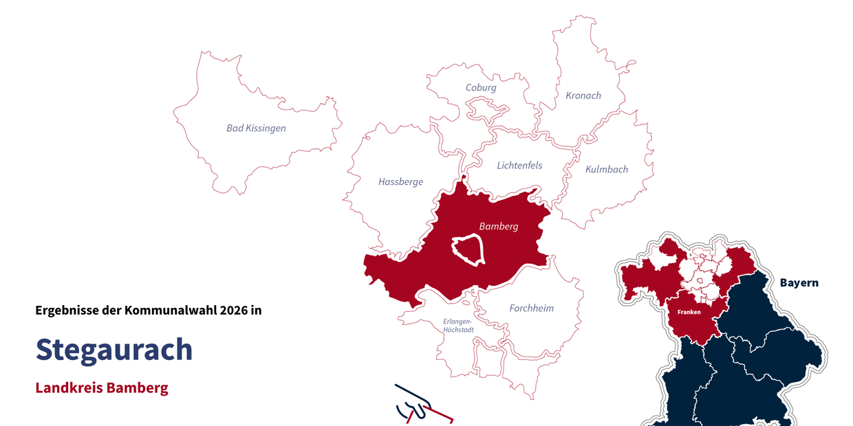 In der Gemeinde Stegaurach sind die Bürgerinnen und Bürger am 8. März 2026 zur Kommunalwahl in Bayern aufgerufen. Mit rund 6900 Einwohnern gehört Stegaurach zur Verwaltungsgemeinschaft Stegaurach und gliedert sich in zwölf Gemeindeteile: Debring, Dellerhof, Dellern, Hartlanden, Höfen, Knottenhof, Kreuzschuh, Mühlendorf, Seehöflein, Stegaurach, Unteraurach und Waizendorf. Auf dieser Seite finden Sie die aktuellen Zwischenergebnisse der Auszählung zur Gemeinderatswahl und zur Bürgermeisterwahl 2026 in Stegaurach.