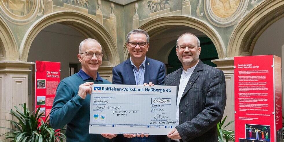 Don Bosco Mission Sandkerwa-Erlös kommt ukrainischen Kindern zugute Matthias Dietz und Reinhold Nastvogel haben eine Spende von 10.000 Euro an Pater Staufer (Direktor der Salesianer Don Boscos) übergeben. // Lions Club Bamberg von Verena Stephan TEILEN  26.02.2024 Bamberg – Der Lions Club Bamberg hat einen Scheck über 10.000 Euro an die Don Bosco Mission für Jugendhilfe in Lemberg in der Ukraine übergeben. Eine stattliche Summe, die die Don Bosco Mission da aus Bamberg erhalten hat: „Damit werden vor allem Waisenkinder und Kinder mit Behinderungen unterstützt, die unter der aktuellen Kriegslage in der Ukraine besonders leiden“, erklärt Pater Staufer, der die Lions-Spende stellvertretend für die Don Boscos entgegennahm. Die Salesianer Don Boscos bringen ukrainische Kinder auch aus näheren Kriegsgebieten raus und in weniger gefährliche Regionen. Der Lions Club Bamberg betreibt während der Sandkerwa ehrenamtlich einen Bier- und Weinstand. Die Erlöse gehen vollständig an karitative oder kulturelle Projekte. Der Großteil der über 10.000 Euro aus der Sandkerwa 2023 geht an die Don Bosco Mission. Lesen Sie auch: Antisemitismus-Mann angezeigt Sein Anwalt: Ex-Stasifrau hat Vorwürfe frei erfunden Der Staatsschutz ermittelt nicht mehr gegen Bambergs Antisemitismusbeauftragten Patrick Nitzsche. Dem Historiker war von der ehemaligen Pressefrau der IKG Jaffa L. Verleumdung und Datenmissbrauch vorgeworfen worden. Klare Worte vom Bischof Tränen fließen bei Demo für die Ukraine in Bamberg Momente, die zu Tränen rühren: Bei der Demonstration für die Ukraine auf dem Bamberger Maxplatz wird es für die Teilnehmer bewegend. Klare Worte findet der designierte Bamberger Erzbischof.