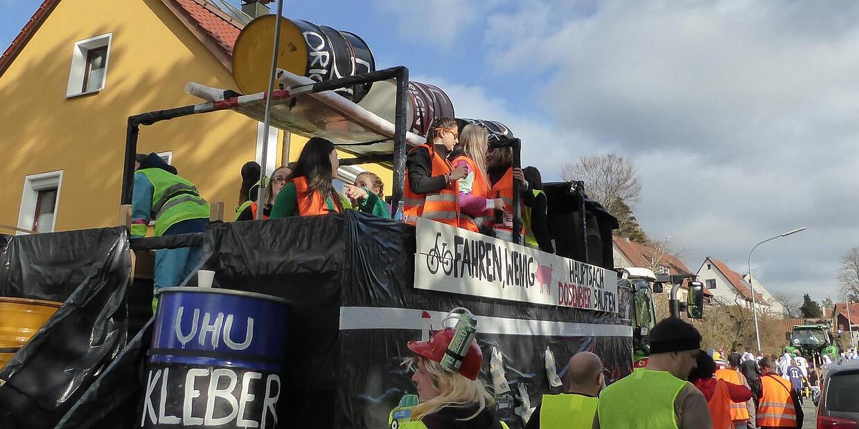 Das war unter anderem die „Letzte Generation“, die durch ihre „klebenden“ Klimaproteste auffiel. Um diese Aktivisten kümmerten sich die Hiltpoltsteiner Kirchweihburschen mit einem extra großen Klebefass am Wagen.