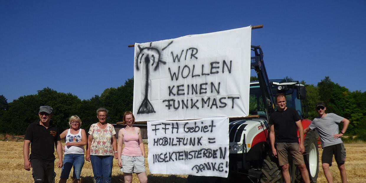 Den Ortstermin der Mitglieder des Bau- und Umweltausschusses des Marktgemeinderats nutzten einige Anlieger, um mit Transparenten gegen den geplanten Funkmastbau zu protestieren. „Wir wollen keinen Funkmast. FFH-Gebiet – Mobilfunk ist Insektensterben – Danke!“ steht mit schwarzer Farbe auf Bettlaken gesprüht, die an einem Traktor hängen.
