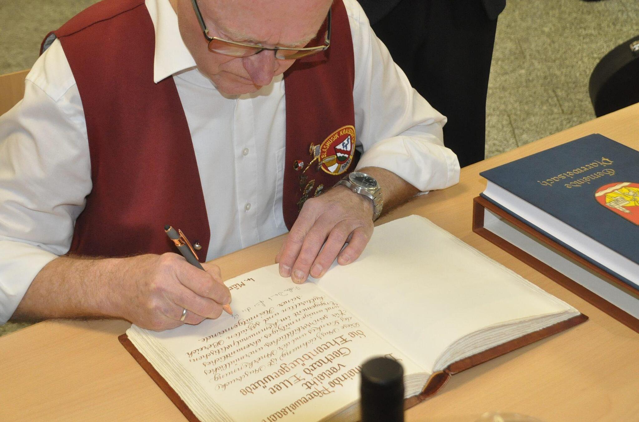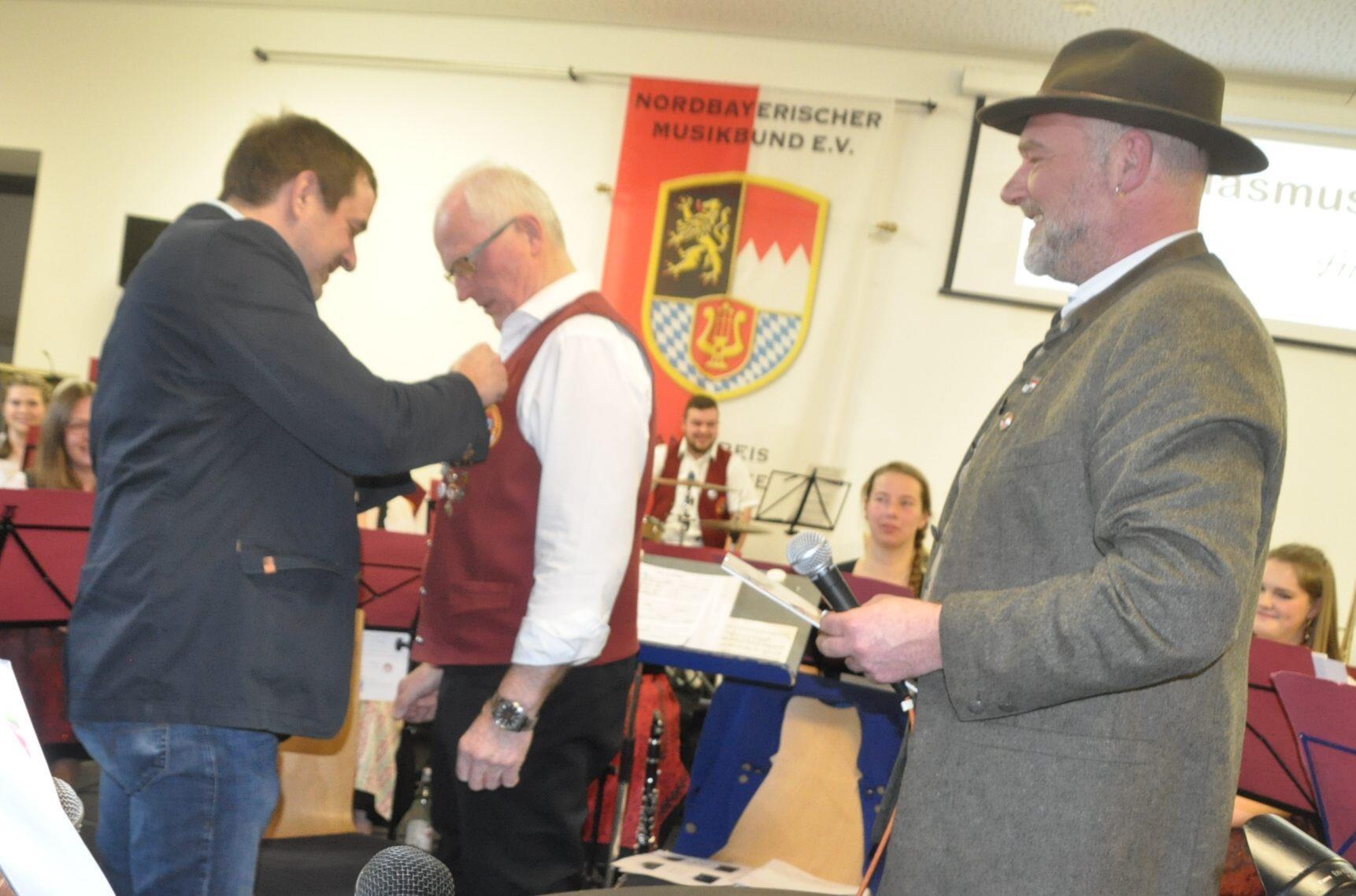Leistung gewürdigt Gerhard Eller ist Ehrenbürger von Pfarrweisach Gerhard Eller (rechts) ist neuer Ehrenbürger der Gemeinde Pfarrweisach. Bürgermeister Markus Oppelt überreichte ihm die Ernennungsurkunde am Samstagabend im Rahmen des Frühlingskonzerts der Blasmusik Kraisdorf in der Frauengrundhalle in Ebern. // Simon Albrecht von Simon Albrecht TEILEN  07.03.2023 Pfarrweisach – Während seine Kraisdorfer Blasmusikkapelle einen großen Auftritt hatte, wurde der Dirigent Gerhard Eller zum Ehrenbürger der Gemeinde Pfarrweisach ernannt. Gerhard Eller, Dirigent der Blamusik Kraisdorf, ist neuer Ehrenbürger der Gemeinde Pfarrweisach. Bürgermeister Markus Oppelt (CSU) hat ihm die Ehrenbürger-Würde am Samstagabend in der Frauengrundhalle in Ebern im Rahmen des Frühlingskonzerts der Blasmusik Kraisdorf unter großem Applaus der 350 Gäste zugesprochen. Eine große Überraschung für Gerhard Eller Zwar sei Eller, wie Oppelt gegenüber dem Fränkischen Tag sagte, in „eine kleine Ehrung eingeweiht“ worden. Eller sagte, dass es die Ehrenbürger-Würde sein würde, habe ihn dann doch überrumpelt. Der neue Ehrenbürger beim Eintrag in das Goldene Buch der Gemeinde Pfarrweisach. // Simon Albrecht Auf der Bühne der Frauengrundhalle und vor „seinen“ Musikanten hat Oppelt die von Melina Müller gestaltete Ehrenurkunde an Eller überreicht. Der neue Ehrenbürger durfte sich ins Goldene Buch der Gemeinde Pfarrweisach eintragen. Mit dieser Ernennung sei der 71-jährige Eller der einzig lebende Ehrenbürger der Gemeinde, sagte Oppelt. Der letzte von bisher sieben Ehrenbürgern - Dr. Wolfram Berninger – sei 2010 verstorben. Der Gemeinderat Pfarrweisach habe in nichtöffentlicher Sitzung am 7. Februar dieses Jahres einstimmig beschlossen, Eller zum Ehrenbürger zu ernennen. Um die Gemeinde Pfarrweisach besonders verdient gemacht Nach den Vorschriften der Gemeindeordnung könne „das Ehrenbürgerrecht nur an Persönlichkeiten verliehen werden, die sich um die Gemeinde besonders verdient gemacht haben“, zitierte Oppelt, und an den Geehrten gerichtet sagte er: „Deshalb sind wir alle der Meinung, dass gerade Du, lieber Gerhard, alle Voraussetzungen erfüllst, die nach dem Willen des Gesetzgebers eine solch hohe Auszeichnung rechtfertigen.“ „Dank deiner Gemeinde für die uneigennützige und beispielhafte Förderung des örtlichen Gemeinwesens“ Zwar würden durch die Verleihung der Ehrenbürgerwürde keine besonderen Rechte und Pflichten begründet, es seien auch keine finanziellen oder politischen Vorteile damit verbunden („… schad drum“, raunte Eller süffisant); denn „der wahre Wert und der tiefere Sinn dieser Auszeichnung sind begründet in der Verehrung und dem Dank deiner Gemeinde für die uneigennützige und beispielhafte Förderung des örtlichen Gemeinwesens“, fasste Oppelt zusammen. Eller war Kreisrat, Gemeinderat, Geschäftsführer des BBV Auf Ellers Vita eingehend hob der Bürgermeister die Tätigkeit als Kreisrat des Landkreises Haßberge von 1978 bis 2014 (36 Jahre) hervor; eine Amtsperiode, von 1978 bis 1984, war Eller Gemeinderat in Pfarrweisach und habe als Geschäftsführer des Bauernverbandes Hofheim während seiner Berufstätigkeit den Bauern zur Seite gestanden. Ferner war der Geehrte Vorsitzender des Vereins 1200 Jahre Kraisdorf, mit dem das Dorfjubiläum vor 23 Jahren gefeiert wurde, engagierte sich beim Umbau der Alten Dorfstraße in Kraisdorf und war Bauleiter beim Sanieren des heutigen Bürgerzentrums. „Aber sein Lebenswerk und seine Herzensangelegenheit ist und bleibt seine Blasmusik Kraisdorf“, konstatierte Oppelt. Die Goldene Ehrennadel des Nordbayerischen Musikbundes erhielt Eller für seine 50 Jahre Tätigkeit als Dirigent der Blasmusik Kraisdorf. Kreisvorsitzender Matthias Sperber heftet dem Jubilar die Nadel an, rechts der Vizepräsident des Nordbayerischen Musikbundes und Bezirksvorsitzender von Unterfranken, Max Mages. // Simon Albrecht Und der Ehrenbürger-Würde nicht genug, erhielt Eller vom Nordbayerischen Musikbund (NBMB) eine Auszeichnung für 50 Jahre Tätigkeit als Dirigent der Blasmusik Kraisdorf. Der Vizepräsident des NBMB und Bezirksvorsitzender von Unterfranken, Max Mages (Bad Neustadt/Saale), und Kreisvorsitzender Matthias Sperber (Rentweinsdorf) überreichten Eller die Goldene Ehrennadel für 50 Jahre Dirigieren. Mages lobte besonders Ellers Eigenschaft, Jung und Alt zusammenzuführen. Die Musikanten der Blasmusik Kraisdorf haben auch ein Geschenk für Eller Aller guten Dinge sind drei: Die Musikanten der Blasmusik Kraisdorf spendierten ihrem Dirigenten eine Weinbergwanderung, „Termin und Ort darfst du dir aussuchen“, sagte Vorsitzender Herbert Schönmann. Dazu gab’s ein Wein-Set, das Josef Lurz überreichte mit dem Hinweis, dass es eine Seltenheit sei, eine Kapelle 50 Jahre lang zu leiten. Unterschied zwischen Eller und einem Club-Trainer Ganz anders sei das beim „Club“, dem 1. FC Nürnberg: „Die haben in 40 Jahren 30 Trainer verschlissen.“ Gerhard Eller nahm es sichtlich gerührt – er, der selbst nie viel Aufhebens um seine Person macht. Er dankte vor allem seiner Frau Gerda und seiner Familie, die ihn immer unterstützt hätten. An die Kapelle gewandt, sagte Eller: „Letztlich ist die Auszeichnung als Dirigent in erster Linie eine Auszeichnung für euch.“ Lesen Sie weitere Nachrichten aus Pfarrweisach und Kraisdorf: Freizeit Trotz Teuerung: Bad Kraisdorf öffnet heuer Das Kraisdorfer Freibad soll geöffnet werden, sobald es die Temperaturen zulassen. Die Kosten hat man im Griff. Ein größeres Problem ist das Personal. Konzert Böhmischer Abend begeistert Vier Zugaben nach drei Stunden, Gäste, die begeistert aufstehen und mitklatschen. Was will man mehr? Beschlussärger Ist Pfarrweisach dabei, Geld zu vernichten? Finanziellen Schaden richtet ein Gemeinderatsentscheid in Pfarrweisach an, befürchtet Bürgermeister Markus Oppelt: Hier wurden gerade „1,1 Millionen Euro verschenkt“.