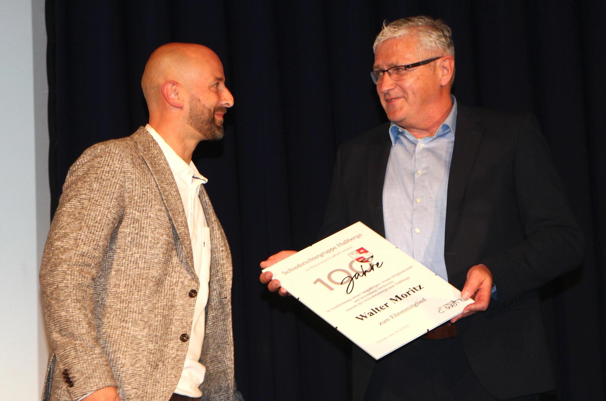 Rückschau und Dank 100. Schiedsrichter-Jubiläum in Eltmann Die ausgezeichneten Schiedsrichter mit (vorne von links) Moritz Meisel, Gert Koch, Hans Bühl, Michael Peter, Robert Schnös, Heinrich Rambacher, Rudolf Wagner sowie Obmann Christian Wetz (rechts) und Schirmherr Alexander Bergmann (links); dahinter die Ehrengäste. // Günther Geiling von Günther Geiling TEILEN  02.11.2023 Eltmann – Anpfiff zum nächsten Jahrhundert: Die Schiedsrichtergruppe Haßberge hatte einen Festabend in der Stadthalle Eltmann und zeigte Herz für einen kranken Buben. Seit einem Jahrhundert sorgen sie dafür, dass Woche für Woche auf den Fußballplätzen Jugendliche und Senioren dem runden Leder nachsausen können. Dies wäre ohne sie als Schiedsrichter und wichtigstem Mann nicht möglich. 100 Jahre feierte die „Schiedsrichtergruppe Haßberge“ mit einem Festabend in der Stadthalle Eltmann. Dabei erinnerte man an die „Gründungsväter“, hob aktuelle Spitzenschiedsrichter hervor und zeigte Herz für einen Buben, der mit einem schweren Schicksalsschlag durchs Leben gehen muss. Klaus Karl-Kraus frotzelt gegen den FC Bayern Den schwungvollen Auftakt gab das Showteam der „DDC-Factory“ Schweinfurt mit Breakdance, Hip-Hop-Style und Luftakrobatik; Kabarettist Klaus Karl-Kraus bewährte sich als kompetenter Moderator, voller Liebe zum 1. FC Nürnberg und der Spielvereinigung Greuther Fürth und humorvollen Seitenhieben auf FC-Bayern-Fans. Schirmherr Alexander Bergmann erinnerte an das Krisenjahr der Weimarer Republik 1923 und die Gründer, „große Idealisten“. Ludwig Hofmann, Edmund Kessler und Theo Sponsel riefen die SR-Gruppe Haßfurt ins Leben und lösten sich damit von der damaligen SR-Vereinigung Schweinfurt. „Im Nachhinein eine echte Erfolgsgeschichte! Anschließend sorgten elf Obleute für die stetige Weiterentwicklung, verloren Tradition und Kameradschaft aber nie aus den Augen.“ Schiedsrichter und Funktionäre sind Persönlichkeiten Aus der Fülle der vielen, fleißigen Schiedsrichter und Funktionäre hob Bergmann Persönlichkeiten hervor: Richard Schlegelmilch (von 1980 bis 1985 Obmann, viele Jahre Verbandsbeobachter); Josef Raab (fast 30 Jahre Vorsitzender); Walter Moritz (Lehrwart, Schiedsrichter bis zur Bayernliga und sogar Verbandsschiedsrichterobmann und damit „Eichel-Ober“ der bayerischen Schiedsrichter). Bergmann sprach auch die SR-Gruppe Hofheim als Teil der Geschichte an; sie feierte 2009 ihr 60. Jubiläum. Ihr letzter Obmann Walter Krug verstarb ausgerechnet am Rande eines Fußballspiels als Zuschauer viel zu früh. 2010 wurde aus den damaligen Gruppen Haßfurt und Hofheim die neue SR-Gruppe Haßberge. „Aus Konkurrenten sind Freunde geworden“ bei der Gründung der Gruppe Haßberge „Was damals in Hinterzimmern entschieden wurde, ist heute längst Geschichte, und aus Konkurrenten sind Freunde geworden. Die Vereinigung ist gelungen“, betonte Bergmann. Er erinnerte an starke Spitzenschiedsrichter: Allen voran nannte er den früheren Bundesliga-Schiedsrichter Peter Drescher sowie die Aushängeschilder Walter Moritz in der Bayernliga und aktuell Marcel Geus. Bei der Überreichung der Urkunde zum „Ehrenmitglied der Schiedsrichtergruppe Haßberge“ erhielt Walter Moritz (rechts) aus der Hand von SRO Christian Wetz // Günther Geiling „Mein Dank gilt aber auch Obmann Christian Wetz für sein Herzblut, das er einbringt mit seinem ganzen Team und den 119 aktiven Schiedsrichtern.“ Nach seinen zahlreichen Ehrungen bis hin zur Ehrenmitgliedschaft des bayerischen Fußballverbandes wurde Walter Moritz nun zum Ehrenmitglied der Schiedsrichtergruppe Haßberge ernannt. Den „Schiedsrichter des Jahres 2023“ Christian Kessler präsentieren hier Alexander Bergmann (links) und SRO Christian Wetz (rechts). // Günther Geiling Mit der „Goldenen Pfeife“ ausgezeichnet und zum „Schiedsrichter des Jahres 2023“ ernannt wurde Christian Kessler. Er leitete schon als 15-Jähriger das Spiel TSV Prappach – FC Sand II, wurde durch Corona etwas gestoppt, stieg aber mit 17 Jahren in die Bezirksliga und mit 18 in die Landesliga auf – „ein absoluter Wahnsinn und nun im Verband im Nachwuchsleistungszentrum“. Es wurden Schiedsrichter für ihre langjährige Tätigkeit ausgezeichnet. Für 40 Jahre erhielten die Medaille in Silber: Heinrich Rambacher, Rudolf Wagner; für 25 Jahre die Bezirksehrung: Robert Schnös; für 20 Jahre Silber: Hans Bühl und Michael Peter; für zehn Jahre (SR-Gruppe): Moritz Meisel und Gert Koch. Bei der Übergabe der Spendenaktion für Marlon Schramm (von links) Moritz Meisel, SRO Christian Wetz, Dominik und Manuela Schramm mit ihren Kindern Mia und Marlon, Schirmherr Alexander Bergmann und BFV-Vizepräsident Jürgen Pfau. // Günther Geiling Eine Spende von 515 Euro überreichten Ludwig Bühl und Rudi Hluchnik namens geehrter Referees und ebenso aus der Schiedsrichtergruppe Haßberge 2850 Euro an den jungen Marlon Schramm, der seit seiner Geburt ständige Hilfe benötigt. Außerdem übergab BFV-Vizepräsident Jürgen Pfau 5000 Euro aus der Sozialstiftung des Bayerischen Fußballverbandes an die Eltern Dominik und Manuela Schramm. In der „Talkrunde“ (von links) MdL Steffen Vogel, Moderator Klaus Karl-Kraus, Bundesligaschiedsrichterin Davina Lutz sowie Verbandsschiedsrichterobmann Sven Laumer. // Günther Geiling Mit zwei Talkrunden erhielten die vielen Gäste einen Einblick in das Leben der Schiedsrichtergruppe und den Sport. Dabei war die 28-jährige Davina Lutz vom TSV Poppenhausen, die künftig Spiele in der Ersten Frauen-Bundesliga leiten darf und auch international schon pfiff. Sie erzählte von frühem Beginn im Fußball, Unzufriedenheit mit Schiedsrichtern und ihrem Perspektivwechsel: „Die Tätigkeit als Schiedsrichter bringt so viel Positives mit, obwohl er manchmal zum Buhmann wird. Viel mehr sollte man positive Signale setzen und Leute für dieses Amt begeistern.“ Klaus Karl-Kraus: Mir ist es wurst, gegen wen Bayern verliert Humorvoll