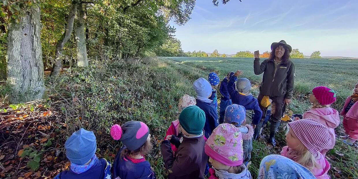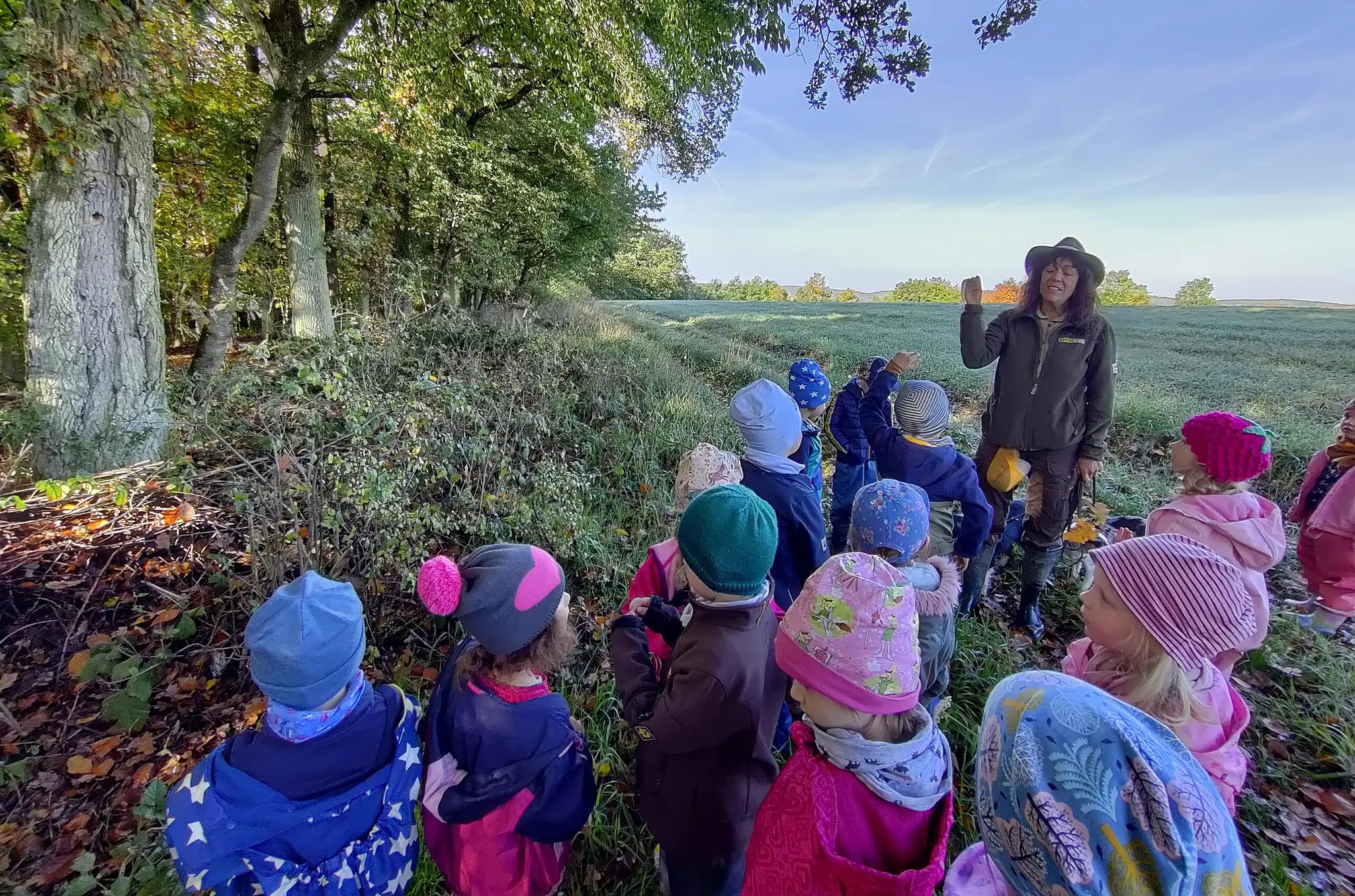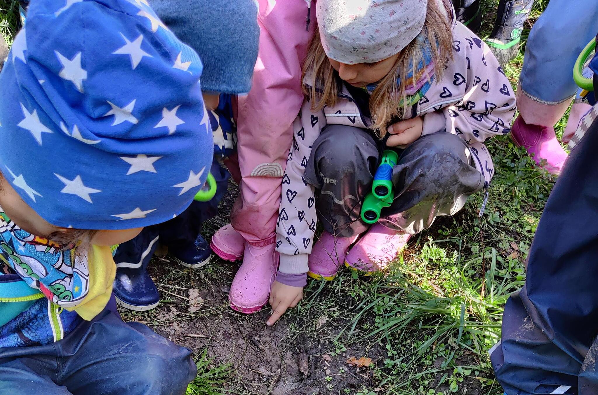 Auf Spurensuche Ein Abenteuer hinter der Haustür Die Rangerinnen Alexandra und Liliane erklären den Kindern, worauf sie im Wald achten müssen. // Naturparkkita Kirchaich von Redaktion TEILEN  19.10.2022 Kirchaich – Die Kitakinder in Kirchaich durften mit zwei Rangerinnen auf Erkundungstour im Steigerwald gehen. Dabei sollen sie auch lernen, die Natur zu schützen. Die Kinder der Naturparkkita Kirchaich waren schon seit Tagen ganz aufgeregt – die Rangerinnen Alexandra und Liliane hatten sich für einen Ausflug angekündigt. Für die Abenteurer ging es auf Spurensuche in die Wildnis hinter der Haustür. Nach einem kurzen Fußmarsch in die Kirchaicher Fluren erreichen allesamt ein kleines Waldstück. Auf Entdeckungstour Kurz wurden die Waldregeln wiederholt und dann gleich die erste Spur entdeckt. An einem Baum wurde ein Loch entdeckt. Für die Kinder ein klarer Fall - ein Specht baut eine Höhle. Eifrig gehen die Kinder auf Spurensuche. // Naturparkkita Kirchaich Die Rangerin Alexandra erklärt den Kinder, dass sie „genau hinschauen müssen“, um die nächsten Spuren zu finden. Dafür bekamen die Kinder Lupen und Ferngläser. Kinder entdecken Spuren von vielen Tieren So entdeckten die kleinen Teilnehmer im Laufe der Exkursion allerhand Interessantes: Spuren von einem Wildschwein, das an einem Baumstumpf gewühlt hat; einen jungen Baum, der durch „verfegen“ seine Rinde verloren hat; frische Spuren von einem Reh im Matsch und von einem grünen Frosch, der durch den Wald gesprungen ist. Insgesamt wat die Spurensuche der Kinder somit sehr erfolgreich. Spuren von Rehen, Fröschen und Wildschweinen gibt es im Matsch zu entdecken. // Naturparkkita Kirchaich Die Rangerinnen und die Kita-Leitung Julian Bayer sind sich einig, dass, wer Abenteuer erleben will, auch schon kurz hinter der Haustür fündig wird. Damit auch kommende Generationen diesen Zauber erleben können, ist es essenziell von klein auf die Kinder für den Steigerwald zu begeistern. Nur wer die Schätze zwischen Feld und Flur kennt, kann diese auch schützen. Lesen Sie auch: Naturschutz Hohe Auszeichnung für den Hüter des Steigerwalds Der Bundesminister für Landwirtschaft würdigt die Verdienste des Forstmannes Goerg Sperber um die Nachhaltigkeit. Erfolgsgeschichte Paare bekommen ein Baby – und einen Baum So klappt das mit dem eigenen Obst: Der Landkreis Haßberge hat jungen Eltern schon 700 Bäumchen geschenkt. Warum die Idee Anfang 2020 entstand. Auf dem Bauernhof Ganz nah dran am Landleben Zehn Kinder erlebten hautnah, was Arbeit auf einem Bauernhof bedeutet. Sie durften Tiere füttern, lernten aber auch vieles über das Landleben.
