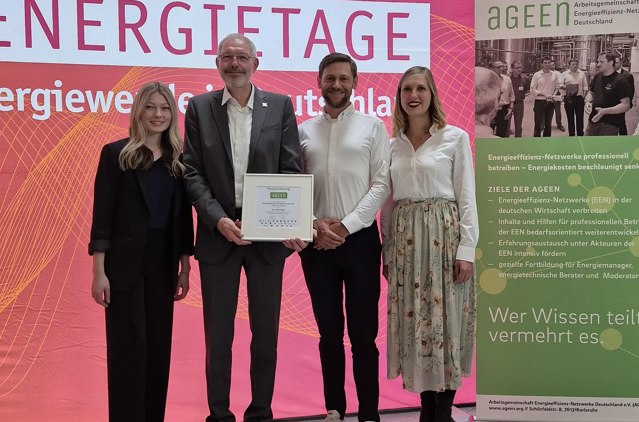 Klimaschutz-Netzwerk Klimaschutz: Gütesiegel für die Überlandzentrale Auszeichnung für das Team Klimanetzwerke der ÜZ Mainfranken (von links): Sina Nolte, Jürgen Kriegbaum, Benjamin Gesslein, Christina Düll. // ÜZ Mainfranken von Redaktion TEILEN  08.06.2025 LKR Haßberge – Die Überlandzentrale (ÜZ) Mainfranken freut sich über eine besondere Auszeichnung: Ihr Einsatz für den Klimaschutz wird gewürdigt. Artikel anhören Sie können uns nicht hören? Diese Funktion können Sie exklusiv mit PLUS nutzen. Erhalten Sie uneingeschränkten Zugriff auf alle Audioinhalte, Artikel und vieles mehr. Vorlesefunktion freischalten Bereits -Zugriff? Jetzt Anmelden Die Überlandzentrale (ÜZ) Mainfranken freut sich über eine besondere Auszeichnung: Das von ihr und dem Institut für Energietechnik IfE initiierte Klimaschutz-Netzwerk Nord/West wird im Rahmen der Berliner Energietage von der Arbeitsgemeinschaft Energieeffizienz-Netzwerke sowie dem Informations- und Expertennetzwerk für Energieeffizienz- und Klimaschutz-Netzwerke für sein Engagement ausgezeichnet.Das Netzwerk ist eines von lediglich zwei deutschlandweit ausgewählten Netzwerken, die in diesem Jahr das „Gütesiegel kommunal“ erhalten. Die ÜZ Mainfranken und das Institut für Energietechnik haben mit den 2023 gegründeten Klimaschutz-Netzwerken konkrete Projekte zur Reduzierung von Treibhausgasemissionen, zur Effizienzsteigerung und zum Ausbau Erneuerbarer Energien angestoßen. Seit Jahren VorreiterDie ÜZ Mainfranken ist bereits seit Jahren Vorreiter im Bereich der Netzwerkarbeit: Schon 2019 gründete die ÜZ Energieeffizienz-Netzwerke und arbeitete seitdem Hand in Hand mit den Kommunen, um unsere Heimat ökologisch nachhaltig zu gestalten. Mit Gründung der Klimaschutz-Netzwerke Nord/West und Süd/Ost beteiligen sich insgesamt 47 Kommunen und der Landkreis Schweinfurt. Auf diese Weise wurde dieses Engagement auf eine noch breitere kommunale Basis gestellt.„Die Auszeichnung ist ein starkes Signal für die Region – und eine große Anerkennung für die intensive, zielgerichtete und ehrliche Zusammenarbeit mit unseren kommunalen Partnern“, betont Jürgen Kriegbaum, Geschäftsführer der ÜZ Mainfranken mit Sitz in Lülsfeld im Landkreis Schweinfurt. „Gemeinsam zeigen wir, dass kommunaler Klimaschutz greifbar, wirkungsvoll und zukunftsweisend sein kann.“125.000 Kunden in der regionDie ÜZ Mainfranken versorgt mit 200 Mitarbeitern über 125.000 Menschen in den Landkreisen Schweinfurt, Haßberge, Kitzingen, Würzburg, Main-Spessart und Bamberg auf einer Fläche von rund 1000 Quadratkilometern. Die ÜZ Mainfranken ist damit die größte Energieversorgungsgenossenschaft in ganz Bayern. Sie versorgt über 125.000 Menschen in Unterfranken mit grüner Energie und schnellem Internet. Seit mehr als 30 Jahren setzt die ÜZ Mainfranken nach eigener Darstellung konsequent auf Nachhaltigkeit und regionale Wertschöpfung. Neben Strom aus erneuerbaren Quellen engagiert sich die ÜZ für Glasfaserausbau, klimaneutrale Wärmelösungen und Elektromobilität. Die Klimaschutzziele der Bundesregierung für das Jahr 2045 erreichte die ÜZ bereits 2016. Für ihren Einsatz wurde sie mehrfach ausgezeichnet – unter anderem mit dem Bayerischen Energiepreis.