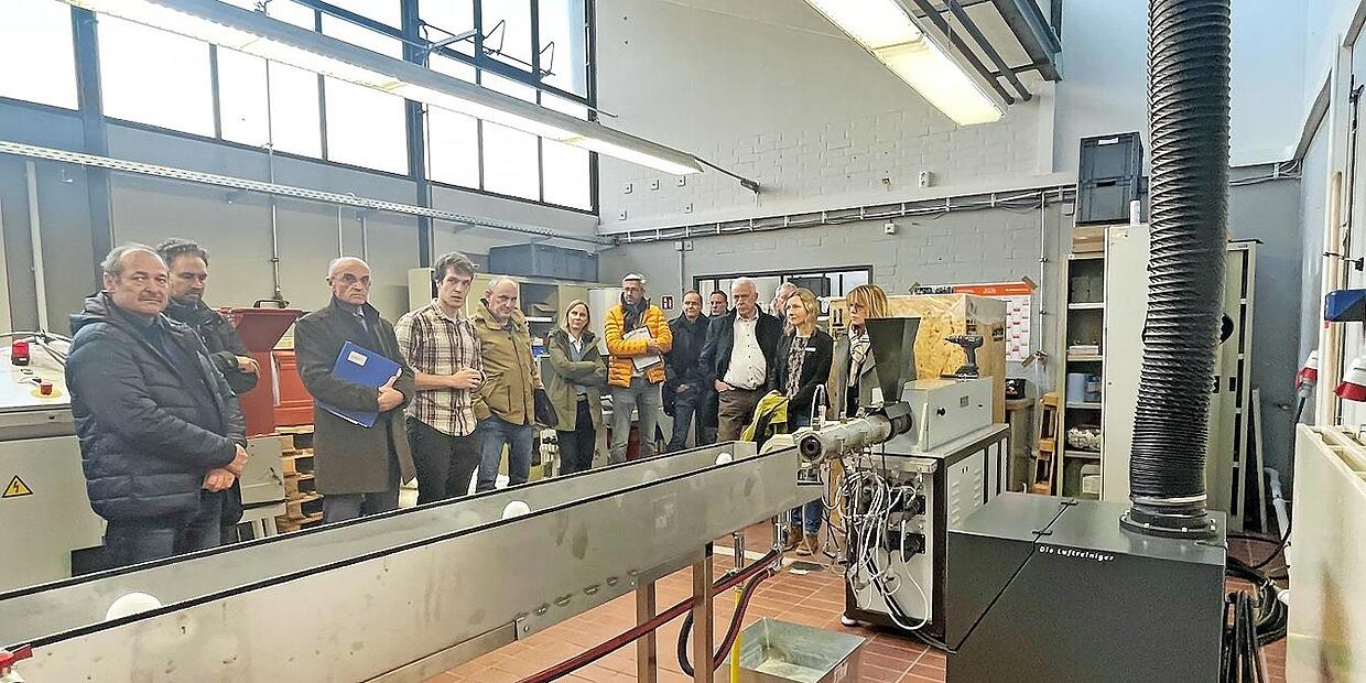 Das TTZ besteht derzeit aus Büro, Technikhalle mit Verfahrensprozessen und dem Labor, das sich hauptsächlich mit der Materialentwicklung auseinandersetzt. Tim Schülein, wissenschaftlicher Mitarbeiter und Doktorand, führte im Auftrag von Professor Krückel seine Gäste durch die Räume und verwies auf den Verbund mit der Fakultät der Technischen Hochschule Würzburg-Schweinfurt und den Partnern aus Wissenschaft und Industrie. So habe man aus Würzburg Bestandsgeräte erhalten, schaffe aber auch neue Geräte an, mit denen man Impulse setze.
