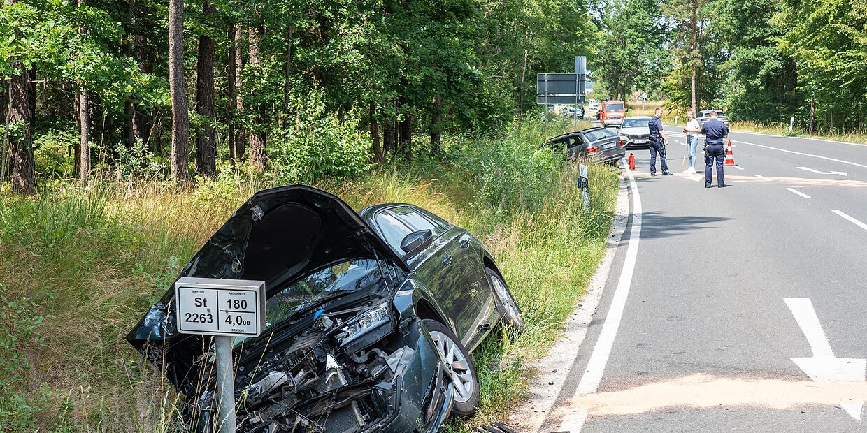 Pommersfelden 28-jährige Skoda-Fahrerin wird schwer verletzt Beide Fahrzeuge schleuderten nach der Kollision von der Fahrbahn und blieben hintereinander in einem Wassergraben liegen. // News5/Merzbach von Redaktion TEILEN  05.07.2023 Pommersfelden – Teils schwere Verletzungen haben zwei Personen am Dienstagmittag bei einem Verkehrsunfall bei Pommersfelden erlitten. Es entstand ein Schaden von circa 50.000 Euro. Eine 28-jährige Skoda-Fahrerin wollte nach Polizeiangaben gegen 12.15 Uhr von der Staatsstraße 2263 zwischen Pommerfelden und Etzelskirchen nach links in die Staatsstraße 2285 abbiegen. Dabei übersah sie im Einmündungsbereich den entgegenkommenden BMW einer 51-Jährigen und prallte nahezu frontal mit dem Fahrzeug zusammen. Beide Frauen wurden verletzt Durch die Wucht des Aufpralls wurden beide Autos in einen angrenzenden Wassergraben geschleudert. Mit schweren Verletzungen musste die 28-Jährige durch den Rettungsdienst ins Krankenhaus gebracht werden. Leichte Verletzungen erlitt die BMW-Fahrerin. Auch sie musste ins Krankenhaus gebracht werden. Während der Unfallaufnahme musste die Fahrbahn einseitig beziehungsweise zeitweise komplett gesperrt werden. Zur Absicherung, Verkehrsregelung und Unterstützung waren die Feuerwehren aus Pommersfelden und Steppach mit 20 Einsatzkräften sowie die Straßenmeisterei vor Ort. Die Unfallfahrzeuge wurden durch ein Abschleppunternehmen geborgen und abtransportiert. Lesen Sie auch: Bei Burghaslach Motorradfahrer wird lebensgefährlich verletzt Beim Zusammenstoß eines Autos mit einem Zweirad erlitt ein junger Mann lebensgefährliche Kopfverletzungen. Ehrenamt Feuerwehr Heßdorf probt den Notfall Während des Tags der offenen Tür zeigen Heßdorfs Feuerwehrleute Rettungseinsätze. Sie setzten modernes Gerät ein. Schließlich zaubern sie viele bunte Farben in den Sommerhimmel. Straßenverkehr Unfall in Herzo: Überschlag und zwei Verletzte Am Samstagnachmittag gegen 15.40 Uhr missachtete eine 56-jährige Autofahrerin aus dem Landkreis Fürth das Rotlicht an der Kreuzung des Hans-Ort-Rings mit der Nürnberger Straße.