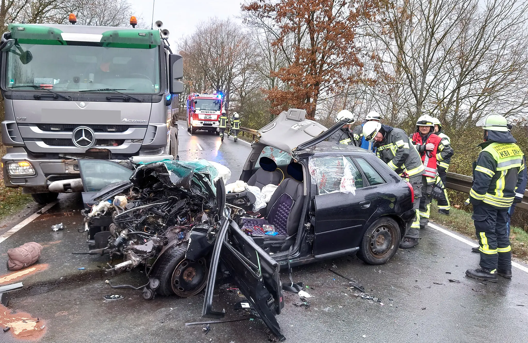 B 470 bei Höchstadt Frontal gegen Lastwagen: Fahrer stirbt bei Unfall Der Fahrer des Audi wurde bei dem Unfall auf der B470 zwischen Gremsdorf und Höchstadt tödlich verletzt. // Andreas Dorsch von Andreas Dorsch TEILEN  27.11.2023 Höchstadt a. d. Aisch – Auf der B 470 bei Höchstadt ereignete sich ein tödlicher Unfall, ein 67-jähriger Mann aus dem westlichen Landkreis stirbt noch an der Unfallstelle. Er prallt frontal gegen ein anderes Auto. Unklar ist, warum der Fahrer mit dem anderen Fahrzeug kollidiert ist. Ein tödlicher Verkehrsunfall ereignete sich am Montagnachmittag auf der B 470 zwischen Höchstadt und Gremsdorf. Ein 67-Jähriger aus dem westlichen Landkreis Erlangen-Höchstadt starb. Fahrer Richtung Höchstadt unterwegs Der Mann war mit seinem Audi A3 Richtung Höchstadt unterwegs. Wie die Polizei vor Ort ermittelte, geriet er zwischen den beiden Ortsschildern aus ungeklärter Ursache auf die Gegenfahrbahn und krachte frontal in einen Lastwagen. Durch die Vollsperrung der Bundesstraße B 470 kam es im Stadtgebiet von Höchstadt – wie hier am Karpfenkreisel – zu größeren Staus. Die Freiwillige Feuerwehr Höchstadt leitete den Verkehr um. // Andreas Dorsch Einsatzkräfte der Höchstadter Feuerwehr befreiten den schwer verletzten Audi-Fahrer aus seinem völlig demolierten Wagen. Seine Verletzungen waren allerdings so schwer, dass er noch an der Unfallstelle verstarb. Der 26-jährige Fahrer des Lastwagens, der keine Chance hatte den Unfall zu verhindern, wurde mit einem Schock ins Krankenhaus gebracht. Auch der Lkw ist nicht mehr fahrbereit An dem Audi entstand durch den Unfall ein Totalschaden. Die Polizei ließ das Fahrzeug abschleppen. Der Lkw ist nach dem Unfall ebenfalls nicht mehr fahrbereit und muss geborgen werden. Die Höhe des bei dem Unfall entstandenen Sachschadens wird auf rund 20.000 Euro geschätzt. Sperrung voraussichtlich bis zum Abend Bis zum Abschluss der Bergungs- und Reinigungsarbeiten muss die B470 im Bereich der Unfallörtlichkeit voraussichtlich noch bis in die frühen Abendstunden gesperrt bleiben. Die Feuerwehr leitet den Verkehr weiträumig um. Lesen Sie auch: Brand Feuer in Erlanger Hochhaus schnell gelöscht Großalarm für die Einsatzkräfte: Aus dem 20. Stock drang Qualm. Der Brand konnte von der Feuerwehr schnell unter Kontrolle gebracht werden. Autofahrer selbst schuld Mühlhausen lässt Verkehr an Gefahrenstelle überwachen Die Politiker haben eine Gefahrenstelle ausgemacht. Dort könnte bald die erlaubte Geschwindigkeit reduziert werden. Nun möchte man vorerst zusammen mit der Polizei den Verkehr überwachen. Erlangen Acht Jahre und sechs Monate Haft für Koch wegen Drogenhandel Polizei und Justiz decken die ausgeklügelten Drogenhandelswege eines Kochs aus Erlangen auf. Ein Polizeieinsatz in einem Hotel bereitet seinem Treiben ein Ende. Nun erwartet ihn eine lange Haftstrafe.