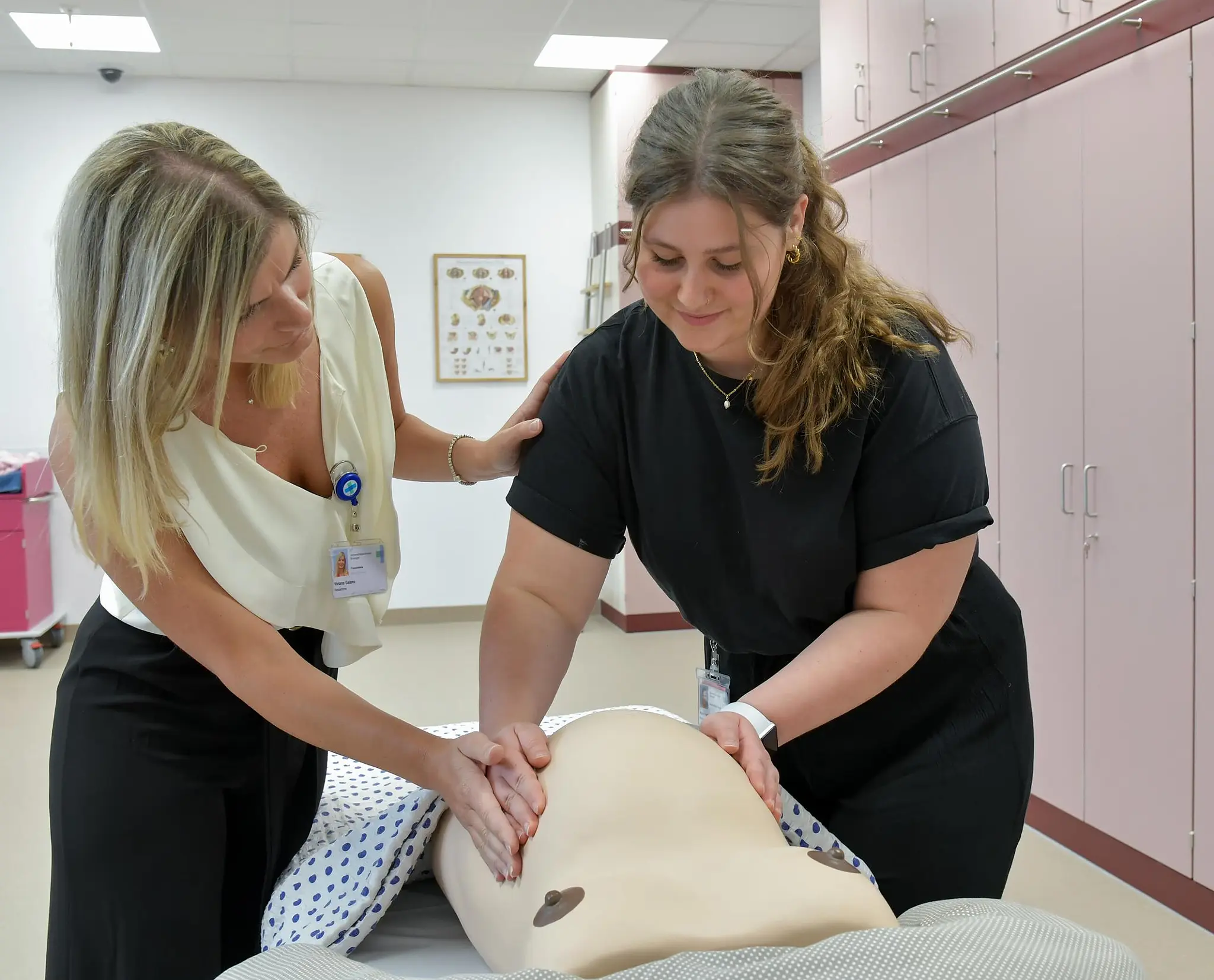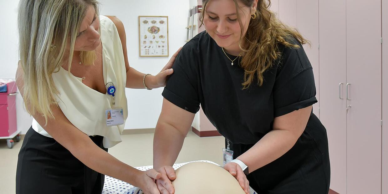Uniklinik Neuer Übungsbereich für Hebammen eröffnet Am Schwangerensimulator in Erlangen können angehende Hebammen einen Modellbauch erfühlen. // Michael Rabenstein/Uniklinikum Erlangen von Redaktion TEILEN  03.07.2023 Erlangen – Wie liegt ein Kind im Mutterleib? Das lernen angehende Hebammen nun in einem neuen Simulationslabor – unter anderem. Mütter und Kinder profitieren. Eine gut ausgebildete Hebamme an der Seite zu haben, die in jeder Situation weiß, was zu tun ist, ist für Schwangere sehr wichtig. Damit angehende Hebammen klinisch-praktische Fähigkeiten und Fertigkeiten erlernen, hat die Frauenklinik des Universitätsklinikums Erlangen ein neues sogenanntes Skills- und Simulationslabor, Skills-Lab genannt, eingerichtet. Am Donnerstag ist es nun im Beisein von Spitzenpolitikern eröffnet worden. Im Rahmen der Veranstaltung bekamen Anwesende Einblick in die praxisnahe Ausbildung angehender Hebammen des Studiengangs „Hebammenwissenschaft“ am Uniklinikum Erlangen und an der Friedrich-Alexander-Universität Erlangen-Nürnberg (FAU). Das rund 170 Quadratmeter große Skills-Lab besteht aus einem Simulationskreißsaal, in dem Vorsorgeuntersuchungen, Geburts- und Wochenbettbetreuungen trainiert werden können, einem Simulations-Operationssaal sowie einem Seminarraum – unter anderem. Die Räume sind mit dem Video-Analyse-System SIMStation ausgestattet. Stillberatung und Wochenbettbetreuung Damit lassen sich Szenen im Simulationsraum aufnehmen und in ein Nebenzimmer übertragen, wo Studierende oder Lehrkräfte das Geschehen beobachten. Von dort aus können den Simulationspuppen, an denen Behandlungen trainiert werden, Stimmen gegeben werden. Die Übung wird dann realistischer. Zusätzlich zu Geburtsmodellen werden reale Personen eingesetzt, die als Simulationspatienten ausgebildet sind. Mit ihnen üben angehenden Hebammen etwa Stillberatungen und Wochenbettbetreuung. Studiengangsvertreter und Direktor der Frauenklinik Doktor Matthias Beckmann erklärte die Bedeutung der neuen Lernräume: „Das heute eröffnete Skills- und Simulationslabor für unsere Hebammenstudierenden in Erlangen spiegelt die technische und apparative Ausstattung der realen Berufssituation im klinischen wie auch im außerklinischen Setting wider.“ „Das Skills- und Simulationslabor baut so eine Brücke zwischen der erlernten Theorie aus den Vorlesungen und der beruflichen Praxis in der Klinik.“ Somit werde eine berufsnahe und authentische Trainingsumgebung in der Ausbildung ermöglicht. Studierende der Hebammenwissenschaft zeigen Handgriffe Ziel des simulationsbasierten Lernens sei es, Hebammenstudierende darin zu unterstützen, zum einen fachliche, methodische, soziale sowie persönliche Kompetenzen systematisch aufzubauen, und zum anderen auf Basis eines möglichst großen Handlungsrepertoires das Verständnis dafür zu entwickeln, dass die Sicherheit von Patientinnen und Patienten in realen beruflichen Situationen höchste Priorität hat, fügte er an. Liselotte Braun, wissenschaftliche Mitarbeiterin des Studiengangs Hebammenwissenschaft, verwies auf die steigenden Anforderungen im Gesundheitswesen: „Gerade vor diesem Hintergrund ist es wichtig, dass neue Lehr- und Lernorte sowie zusätzliche Lehrmethoden für den Theorie-Praxis-Transfer geschaffen werden.“ Das Skills-Lab sei eine geschützte Umgebung, in der ohne Zeit- und Leistungsdruck geübt werden darf. Fehler seien dort erwünscht. Außerdem sei es wichtig, dass bestimmte Handgriffe zunächst an Modellen geübt werden, um unnötige Untersuchungen an Frauen zu vermeiden und später in jeder noch so selten vorkommenden Situation richtig handeln zu können, sagte sie. Während der Eröffnungsveranstaltung veranschaulichten verschiedene Stationen im Simulationskreißsaal Situationen des Alltags einer Hebamme. Studierende der Hebammenwissenschaft demonstrierten anhand von Modellen die Untersuchung einer Schwangeren, den Umgang mit einem Neugeborenen sowie die wichtigsten Handgriffe der Betreuung einer Wöchnerin. Innenminister Joachim Herrmann lobt Skills-Lab Mittels einer Augmented-Reality-Brille, die virtuelle Inhalte im Sichtfeld des Nutzers und in der realen Welt einblendet, hatten die Anwesenden außerdem die Möglichkeit, in den Körper einer Gebärenden zu sehen und so die Position und Bewegung des Kindes in der Gebärmutter und im Becken während des gesamten Geburtsverlaufs zu verfolgen. Bayerns Innenminister Joachim Herrmann (CSU), er wohnte der Eröffnung bei, meinte: „Das Skills-Lab ist ein wichtiger Meilenstein für die bestmögliche Begleitung von Müttern und ihren Kindern.“ Durch die optimale Verzahnung von akademischer Lehre mit praktischer Ausbildung werde sichergestellt, dass angehenden Hebammen für ihre Tätigkeit gut vorbereitet sind, sagte er. Bernhard Seidenath, CSU-Landtagsmitglied aus Erlangen, sagte: „Hebammen leisten vor, während und nach der Geburt Großartiges.“ Der Simulationskreißsaal, zu dem der Freistaat eine halbe Million Euro beigesteuert hat, ermögliche Studierenden, Geburtssituationen zu trainieren, die richtige Reaktion in kritischen Lagen – ohne Gefährdung von Mutter und Kind – einzuüben und damit eine hochprofessionelle Ausbildung der künftigen Hebammen, ergänzte er. Seit dem vergangenen Wintersemester ist es möglich, an der FAU Hebammenwissenschaft zu studieren. Das Studium umfasst Hebammentätigkeit, die akademische Lehre an der FAU und die praktische Ausbildung an der Frauenklinik. Im neuen Skills-Lab können auch Studierende der Humanmedizin und Schülerinnen und Schüler der Akademie für Gesundheits- und Pflegeberufe des Uniklinikums trainieren. Lesen Sie auch: Depression nach Geburt Kindstötung in Eckental: Hätte sie sich verhindern lassen? Frauen müssen lange auf Hilfe warten, wenn sie nach der Geburt depressiv werden. Was kann man tun gegen die Krankheit, die 10 bis 15 Prozent aller jungen Mütter trifft? UPDATE Höchstadter Straße Der neue Arzt für Adelsdorf ist da 
