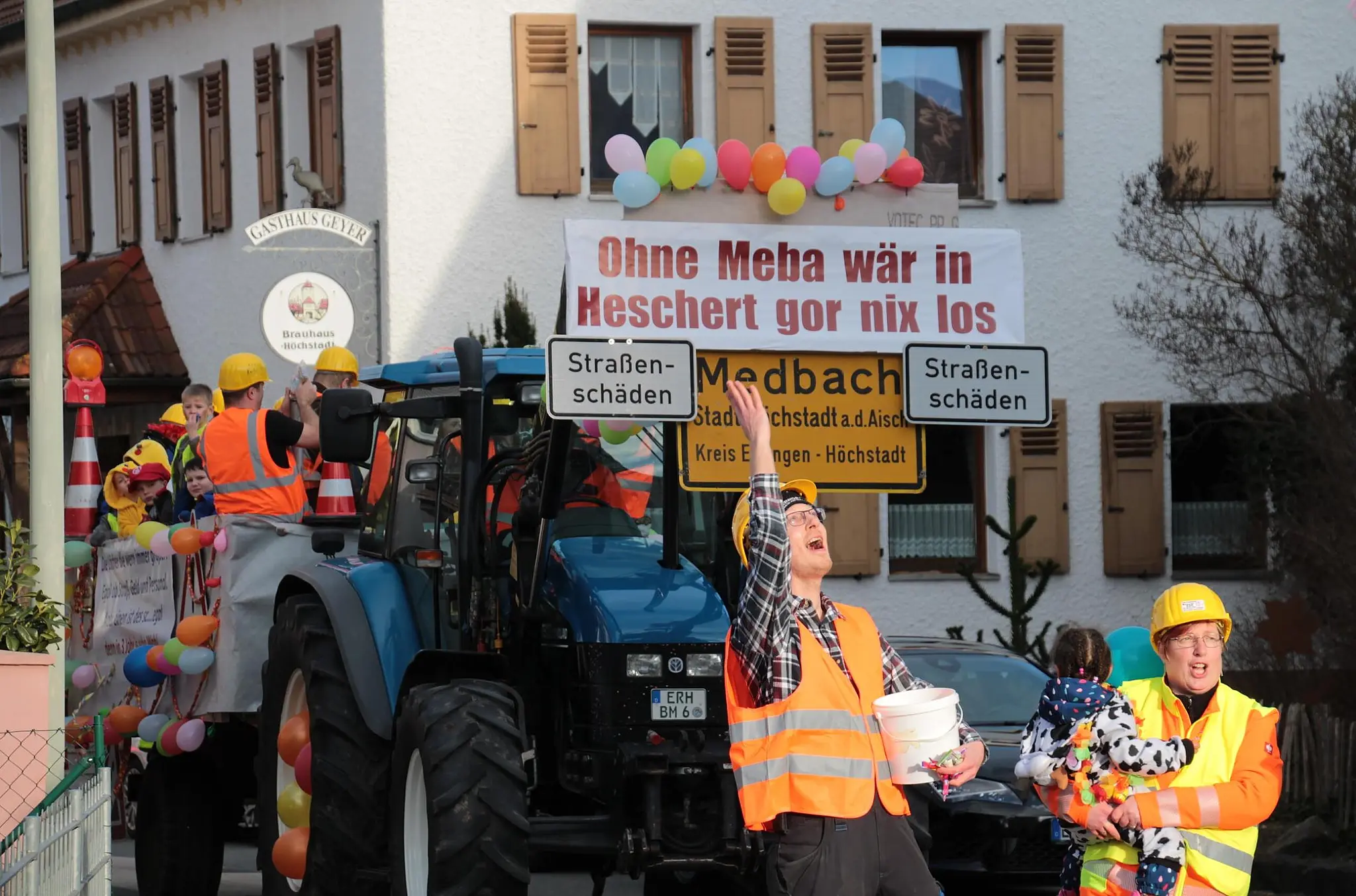 Kehraus Medbacher zeigen Höchstadt, wie’s geht Die Medbacher zeigten, wie es geht. Immerhin gab’s einen Faschingszug im Miniformat. // Andreas Dorsch von Andreas Dorsch TEILEN  21.02.2023 Höchstadt a. d. Aisch – Während in Höchstadt die Leute nur auf dem Marktplatz standen, startete der kleine Ortsteil seinen eigenen Umzug. Und der hatte es in sich. „Der Beppo hat kein Geld für neue Straßen, aber für Sandstrand und Kneipp-Oasen.“ Die Absage des Höchstadter Faschingszuges in diesem Jahr wollten die Narren der Feuerwehr Medbach-Kieferndorf nicht so einfach hinnehmen und organisierten kurzerhand ihren eigenen Festzug. Sehen Sie die Bilder zum Faschingsdienstag in Höchstadt: Kehraus auf dem Marktplatz Die schönsten Bilder vom Fasching in Höchstadt Alle Bilder zum Faschingsdienstag in Höchstadt: zum bunten Treiben auf dem Marktplatz und auch zum kleinen Umzug der Medbacher. Zwei prächtige Wagen Mit zwei prächtigen Wagen ging es am Faschingsdienstag durch Medbach. Die Wagen nahmen die Stadt Höchstadt und ihren Bürgermeister gehörig aufs Korn. Mit einem überdimensionalen Sarg, Pfarrern, Nonnen, Mönchen und einem Trauermarsch-Trompeter wurde einmal der Höchstadter Faschingszug zu Grabe getragen. Ein zweiter Wagen, gespickt mit Bauarbeitern, machte sich über die immer größer werdenden Löcher in Höchstadts Straßen lustig und diagnostizierte beim Bürgermeister schon eine gewisse Amtsmüdigkeit. Radiosender vertreten Auf dem Höchstadter Marktplatz hatte unübersehbar der Radiosender Antenne Bayern zum Faschingstreiben geladen. Das Echo war groß, der Platz gut gefüllt, aber so mancher mehr oder weniger maskierte Besucher fragte sich, ob das schon alles war, nachdem die Stadtkapelle und der Spielmannszug der Feuerwehr mit Livemusik wenigstens ein wenig für Stimmung gesorgt hatten. Lesen Sie auch: Narretei in Lonnerstadt Loschedder Fasching von null auf hundert Die „Loschedder Faschingsgaudi“ findet ein begeistertes Publikum in drei ausverkauften Vorstellungen. Vom Männerballett bis zu den TSV-Kids zünden die Akteure ein Feuerwerk. Statt Umzug Faschingsdienstag: Bunte Party in Höchstadt Der Umzug ist zwar abgesagt, aber die Stadt lädt kurzfristig zur Party mit Vereinen – und mit prominenter Unterstützung. Fasching in Bruck 70.000 Narren jubeln an den Straßen Der Brucker Faschingszug entwickelt sich einmal mehr zum Publikumsmagnet. Das zweitgrößte Erlanger Event nach der Bergkirchweih zieht die Menschen in Scharen an.