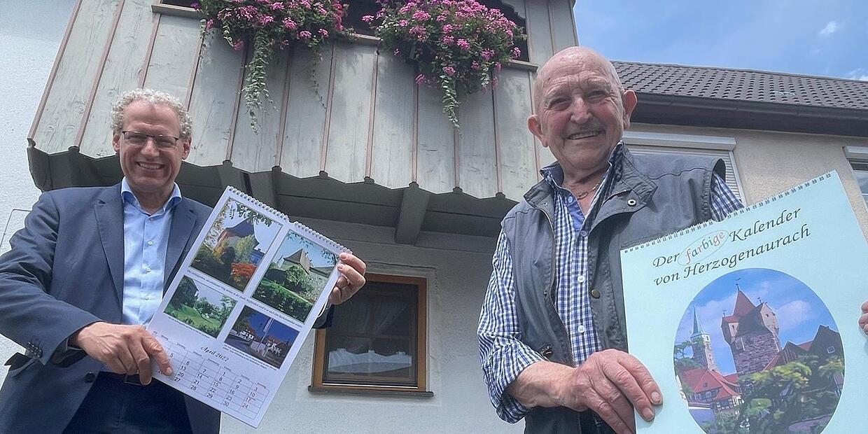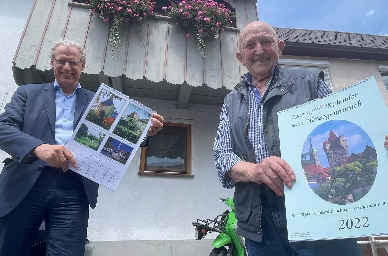 Besonderer Kalender Heimat in 75 Bildern Hans Gaschbauer (rechts) und Bürgermeister German Hacker zeigen den Kalender. // Michael Busch von Michael Busch TEILEN  15.07.2021 Herzogenaurach – Der Herzogenauracher Hans Gaschbauer hat einen Kalender zusammengestellt, wie es ihn zuvor noch nicht gab. Der 92-Jährige ist zu Recht stolz. „Der Erlös geht komplett ab für eine gute Sache.“ Aus Hans Gaschbauer sprudeln die Worte nur so heraus. Ein Herzensprojekt habe er sich erfüllt, eines mit einem guten Zweck. „Ich will an dem Kalender nichts verdienen.“ Und so übergibt der 92-Jährige auch sofort ein Exemplar an den Bürgermeister German Hacker. Weitere Exemplare gehen an die Reporter vor Ort.Fünf Euro für den guten ZweckMan kennt den „Gaschi“ in Herzogenaurach. „Ein älterer, stadtbekannter Herr und ehemaliger Bergsteiger“, wie es in der Beschreibung zur Kalenderübergabe heißt. Einer, der durch die Welt reiste und die Berge bestieg. Einer, der unglaublich viele Fotos machte und immer noch macht. „Auf 75 Bildern gibt es über die zwölf Monate verteilt einen 50-jährigen Rückblick“, erzählt er. Bilder, die vor allem Herzogenaurach von 1958 bis 2014 zeigen. Mit besonderen Aufnahmen. „Hier habe ich lange nach einer Stelle gesucht, um alle Türme der Stadt auf ein Bild zu bannen“, sagt er mit Blick auf den Monat Oktober. Bei einem Freund in der Würzburger Straße hatte er das Motiv vom Dachfenster aus dann endlich gefunden. Und auch zum aktuellen Hochwasser gibt es einen Bezug. Das Wasser stand Anfang des Millenniums so hoch, dass ein damals an der Steinernen Brücke befestigtes Gerüst weggeschwemmt wurde.German Hacker erklärt: „Zu Spendenzwecken möchte er einen Heimatkalender auflegen mit Bildern aus seinem Fundus über Herzogenaurach. Die Einnahmen gehen komplett zugunsten der Spendenaktion Sternstunden.“ Fünf Euro möchte er für den Kalender haben, der ab dem 1. August beim Schreibwaren-Ellwanger, Ringfoto Müller und Teleprofi Scholian zu erwerben ist. Geheimnisvoll tut er, wenn es um den Finanzier des Kalenders geht. „Das ist ein großzügiger Spender, der nicht genannt werden will.“ In seinem Freundeskreis wird allerdings gemunkelt, dass dieser „Sponsor“ der Gaschi selber sei. Das würde auch zu ihm passen. Genauso wie die Akribie, mit der er, gepaart mit Freude und Engagement, in seinem Bildarchiv gewühlt und die Bildauswahl getroffen hat. Jahreszeitlich zugeordnet, hat er die Bilder mit eigenen Anmerkungen versehen. Dass Titelbild und die letzte Seite mit Bildern der Dolomiten, des Himalaya und des Nanga Parbat sowie dem aus Gaschbauers Sicht schönstem Berg, dem 6856 Meter hohen Amadablam versehen sind, überrascht nicht. Es ist im Grunde die Unterschrift des kreativen Senioren. Die darin verpackte Heimatverbundenheit ist ein ungewöhnlicher Kalender, da waren sich Bürgermeister und der Weltreisende einig.