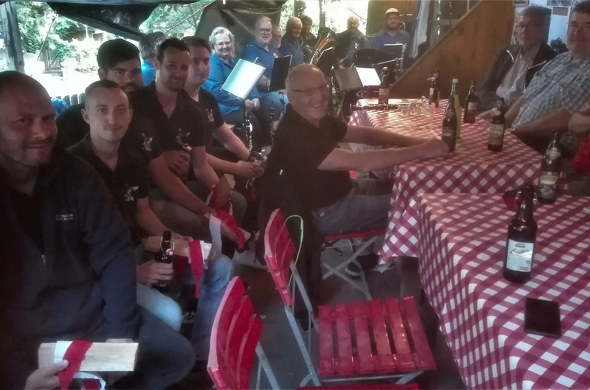 Brauchtum Kerwasbaum kam als Brennholz Die Stimmung war gut am Freitag im Boläsdä-Häusla am Höchstadter Kellerberg. // privat von Redaktion TEILEN  08.08.2021 Nackendorf – Ein sonderbares Zusammentreffen gab es am Freitag auf dem Höchstadter Kellerberg. Gefeiert wurde dort die Eröffnung der Nackendorfer Kerwa. Die Kirchweih der 1742 erbauten Nackendorfer Kapelle St. Laurentius wurde am Freitag auf dem Höchstadter Kellerberg eröffnet. Die Vorsitzenden des Nackendorfer Kapellenvereins stießen mit Vertretern Höchstadter Kellerbrüder und Warmersdorfer Kerwäsburschen mit hygienischen Bügelflaschen auf diese „Kerwa“ an. Diese Kirchweih wurde bis zur Eröffnung von zwei Gaststätten 1951/52 in Nackendorf immer in einem Wirtshaus auf dem Höchstadter Kellerberg, der in alten Flurbezeichnungen allerdings „Nackendorfer Knock“ hieß, gefeiert. Nun gibt es in Nackendorf und auf dem Kellerberg überhaupt keine Wirtshäuser mehr.Kellerbruder hatte Kirchweihbaum gekauftDieses sonderbare Zusammentreffen mit den Warmersdorfer Kerwäsburschen, den „Stangenloher Hasen“, entstand dem Umstand, dass im letzten Oktober 2020 am Warmersdorfer Kirchweih-Montag ein Höchstadter Kellerbruder den Warmersdorfer Kirchweihbaum aufgekauft hat. Freilich, der Kellerbruder hatte einige Seidla oberfränkisches Bier in der Warmersdorfer Gaststätte genossen, und er hatte Mitleid mit den Warmersdorfern – da die den seiner Meinung nach „scheußlichsten Baum des südlichen Steigerwaldes“ hatten. In Bügelflaschen stoßen Vertreter des Nackendorfer Kapellenvereins, der Höchstadter Kellerbrüder und der Warmersdorfer Kerwäsburschen auf die Nackendorfer Kirchweih an. // privat Die Übergabe des Warmersdorfer Kerwasbaums erfolgte nun in Form von Brennholz – fast ein Ster kam zusammen. Corona-bedingt hatte sich die Auslieferung bis zum Freitag verzögert – immerhin noch rechtzeitig zur nächsten Heizperiode.Mit viel MusikWie es aber der Zufall will, hat sich auch noch die 1956 gegründete Blaskapelle aus Mönchherrnsdorf (Oberfranken) zu einem Probe-Abend im „Boläsdä-Häusla“ mit ihren Höchstadter Dirigenten verabredet. Da aber urlaubsbedingt ein Trompeter ausfiel, hat ein stellvertretender Landrat des Landkreises Erlangen-Höchstadt den Trompetenersatz und die Schirmherrschaft für diese Heimat-Abend übernommen. Der ausgediente Kerwasbaum aus Warmersdorf kam in Form von Scheitholz nach Höchstadt. // privat Ein gelungene Brauchtumspflege war dieses Zusammentreffen in einer kulturellen armseligen Zeit allemal.