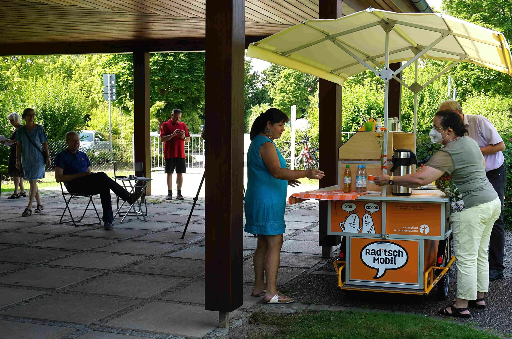 Gemeinschaft Rad’tsch-Mobil ermöglicht Begegnungen Das Rad´tsch-Mobil rollt los: Das Radcafé war schon am ersten Tag erfolgreich. // Richard Sänger von Richard Sänger TEILEN  17.08.2021 Herzogenaurach – Die evangelische Kirchengemeinde Herzogenaurach hat ein Radcafé gebaut und will die Menschen zueinander bringen – auch am Friedhof. Auf einem Friedhof Kaffee trinken und dabei den Blick über die Anlage schweifen lassen: Auf dem neuen Friedhof ist das jetzt möglich. Ähnliche Projekte gibt es bereits in anderen Städten: In München steht ein Friedhofscafé sowie in Erlangen und Fürth mobile Cafés. Am Sonntag wurde auf dem neuen Friedhof in Herzogenaurach das mobile Radcafé, das die evangelische Kirchengemeinde das Rad’tsch- Mobil getauft hat, mit einer kleinen Feier offiziell übergeben. Mit dem Kaffeestand möchten die Initiatoren einen Ort schaffen, an dem Menschen miteinander ins Gespräch kommen. Damit wolle man auch der Einsamkeit vieler älterer Menschen entgegenwirken und manchem dabei helfen, Trauer zu bewältigen, erklärt Pfarrerin Karola Schürrle. Denn Friedhöfe verstehen sich auch als Begegnungsstätten und als Oasen der Ruhe. Denn es gibt Ideen, die sind so naheliegend, dass man sich wundert, dass sie nicht längst realisiert wurden. Die von Fürth übernommene Idee ist so ein Gedanke. Immer wenn das Wetter passt und sich drei bis vier Mitarbeitende finden, werden bis Ende Oktober die Friedhofsbesucherinnen und -besucher jeden Sonntag von 14 bis 16 Uhr zu einer Tasse Kaffee, Kuchen und einem Gespräch eingeladen. „Halt zum Ratschn“, betont Pfarrerin Schürrle. „Die Idee ist nicht von uns, wir haben uns das in Fürth abgeschaut, denn die Idee in Fürth wurde zu einem Erfolg, und wir haben diese übernommen“, erklärt Pfarrer Oliver Schürrle. Mit dem Lied „Ausgang und Eingang, Anfang und Ende liegen bei dir, Herr, füll du uns die Hände“ wählte Pfarrer Schürrle das passende Lied, das meist zum Abschied einer Feier gesungen. Er betonte damit, dass jeder Abschied die Menschen einer neuen Aufgabe entgegenführt und jedes Ende auch als Anfang gesehen werden kann.Das Angebot wird gratis unterbreitet, Spenden sind jedoch willkommen. Während die Friedhofcafés, die es in Berlin und andernorts schon gibt, in der Regel kommerziell betrieben werden, setzt Herzogenaurach auf ehrenamtliches Engagement. So hat Karola Schürrle Helfer aus der Kirchengemeinde gefunden, die Spaß daran haben, zu backen und die Resultate auf dem Gottesacker anzubieten. Trauernde und Menschen, die das Grab pflegen, gehören ebenso zur Zielgruppe wie Spaziergänger und Passanten. Zum Auftakt am Sonntag schaute Bürgermeister German Hacker vorbei. Er dankte dem Ehepaar Schürrle für die schöne Idee und insbesondere dem ehrenamtlichen Team für seinen Einsatz. Dass die Idee ankommt, war den überraschten Besuchern anzumerken, die am Eingang von Pfarrerin Karola Schürrle empfangen und gleich zum Rad’tsch-Mobil eingeladen wurden.Auf einem LastenfahrradMit der kleinen Feier, bei der Pfarrer Oliver Schürrle und Pater Moison Michael um den Segen baten, wurde das Rad´tsch-Mobil in Betrieb genommen. Ein Team Ehrenamtlicher hat den mobilen Radanhänger zu einem mobilen Café umgebaut. Mit diesem neuen Projekt will die evangelische Kirchengemeinde Lebensfreude an unterschiedliche Orte in der Stadt bringen.Unter der Federführung von Bernd Laska wurde das Radcafé entwickelt und im Eigenbau wurde ein Fahrradanhänger zur mobilen Theke und Verkaufsstand – ein Café inklusive kleiner mitgebrachter Tische und Stühle. Dahinter verbirgt sich technisch ein mobiles Lastenfahrrad, dessen Anhänger elektrifiziert wurde, damit man kein Radprofi sein muss, um die Fuhre zu bewegen. Immerhin wiegt der Aufbau einiges, denn die Zutaten umfassen nicht nur Stauraum für Tische, Stühle, Geschirr und Besteck, sondern unter anderem auch einen kleinen Kühlschrank und eine Mini-Spüle. Im Team sind mit Wilfried Büttner, Peter Kelm, Ute Manz, Wolfgang Niewelt, Günter Sachs, Reinhard Schulz und Anna Vogt Personen aus Herzogenaurach, die wissen, wie man anpackt. In diesem Zusammenhang bedankte sich Pfarrer Oliver Schürrle nicht nur beim Team, sondern auch bei der evangelischen Landeskirche für den 80-prozentigen Zuschuss und bei der Stadt Herzogenaurach für die Erlaubnis zum Betrieb des Radcafés.