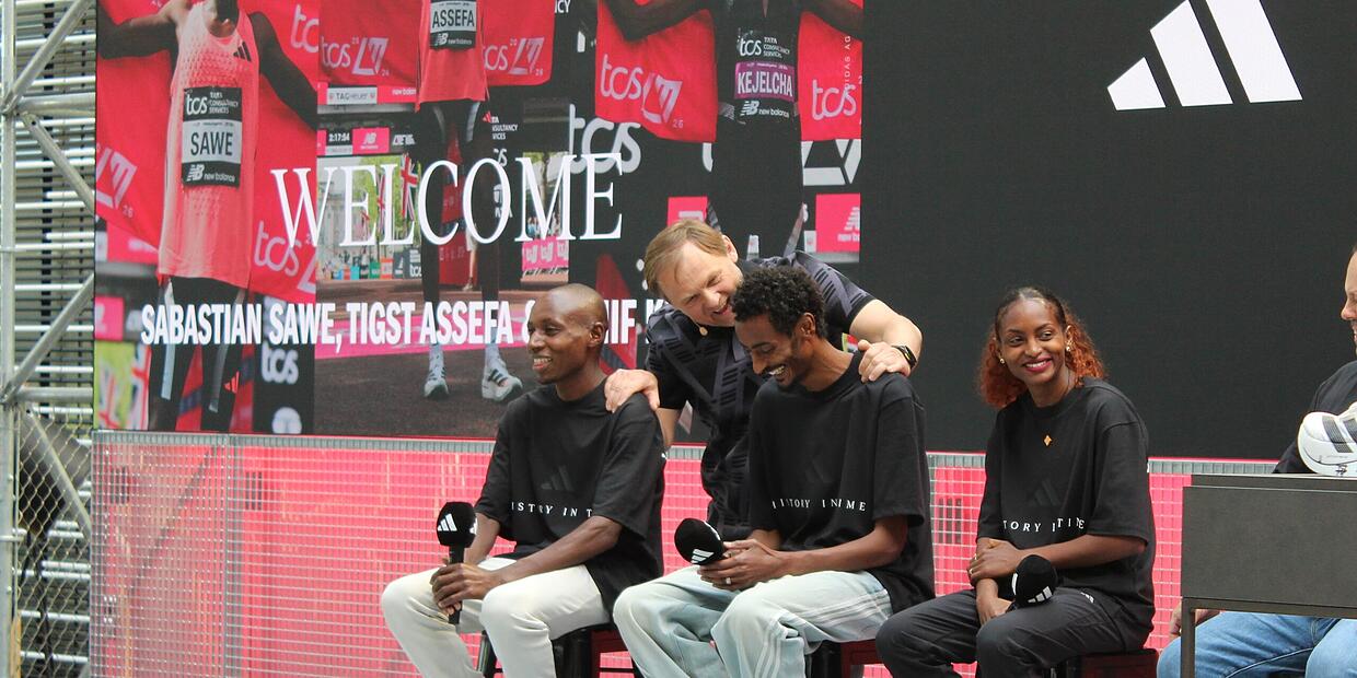– Weltrekordgeschichte geschrieben! Bei Adidas herrscht Feierstimmung, nachdem zwei Marathon-Barrieren gefallen sind. So war der Besuch von Sabastian Sawe, Yomif Kejelcha und Tigist Assefa.