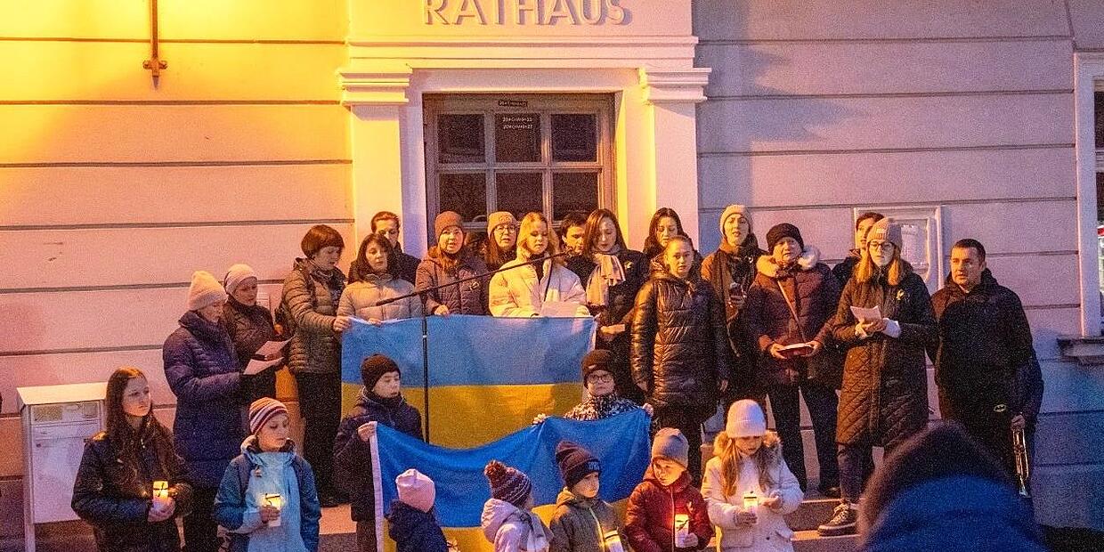 Kinder spannten dazu die ukrainische Fahne und standen mit Kerzen davor. Bürgermeister Gerald Brehm (Freie Wähler) wies in seiner kurzen Ansprache eindringlich darauf hin, dass die Unterstützung der Ukraine ein Akt der Selbstverständlichkeit und der christlichen Nächstenliebe sei. Er ist der Meinung, dass auch die Lieferung von Waffen zur Selbstverteidigung der Ukrainer zwingend notwendig sei.