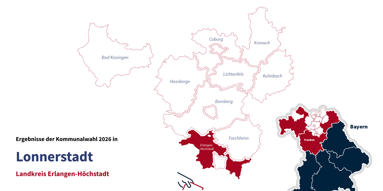 Die Bürgerinnen und Bürger des Marktes Lonnerstadt sind am 8. März 2026 zur Kommunalwahl in Bayern aufgerufen. Der Markt mit rund 2.066 Einwohnern gehört zur Verwaltungsgemeinschaft Höchstadt an der Aisch. Auf dieser Seite finden Sie die aktuellen Zwischenergebnisse der laufenden Auszählung.