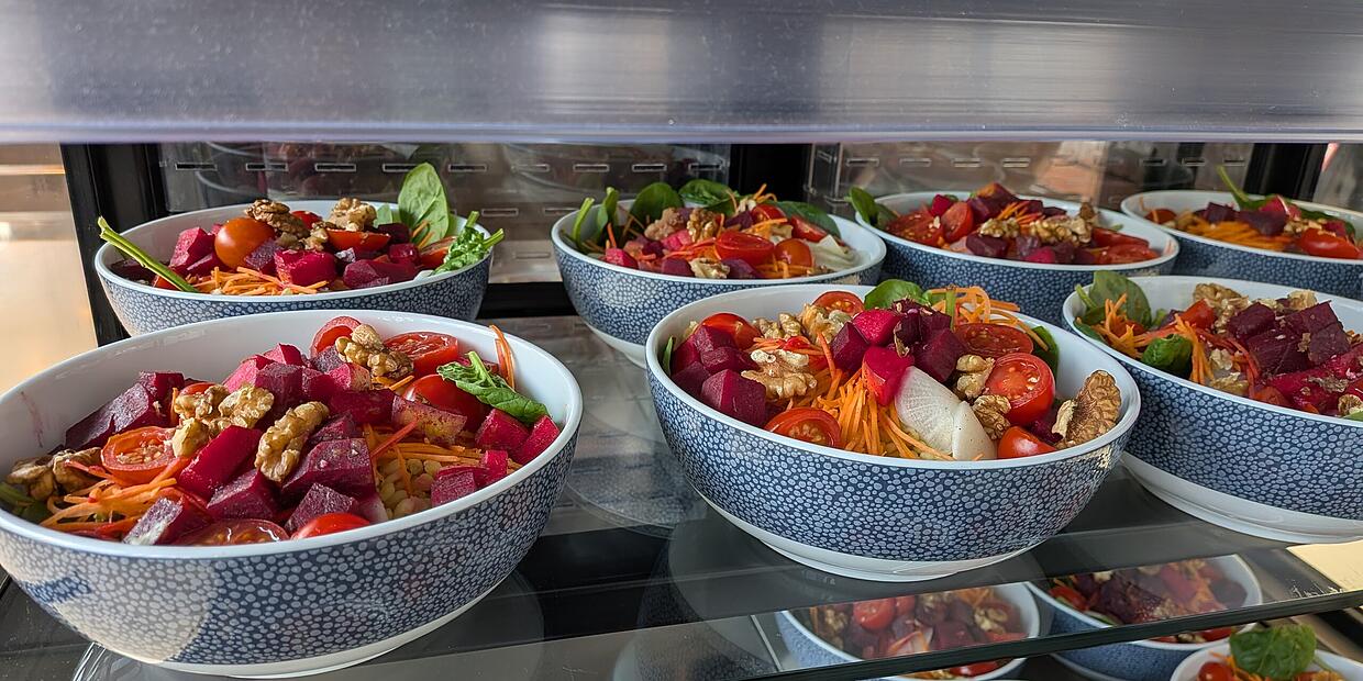 Alles sportlich, auch beim Essen auf dem Adidas Campus in Herzogenaurach? Das Angebot reicht von Hausmannskost bis zur Salatbar und bunten Gemüsebowls. In den beiden Kantinen, „Stripes“ und „Halftime“ können die Mitarbeitenden täglich aus bis zu 15 Gerichten wählen. Wer auf seine Gesundheit achten möchte, kann über die passende App die Nährwerte für die Mahlzeiten direkt einsehen.