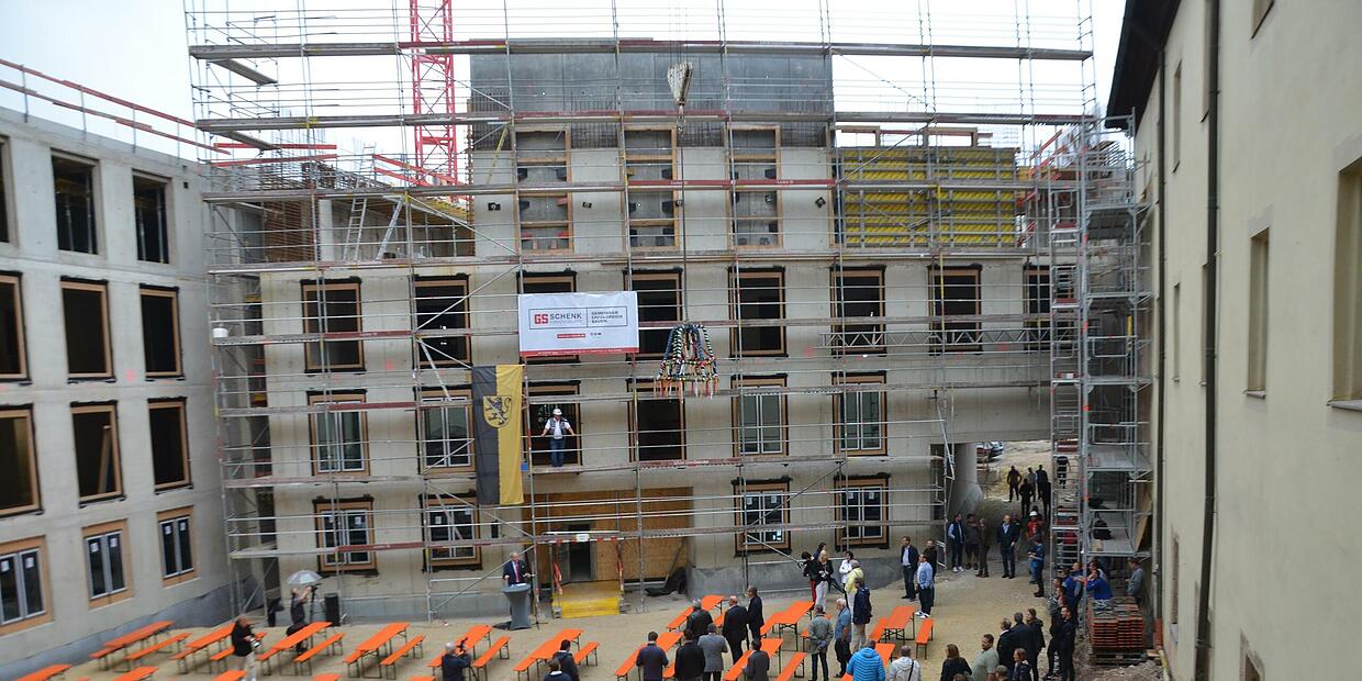 Herzogenaurach – Am Rathausneubau wurde Richtfest gefeiert. Der Rohbau ist fast fertig gestellt. Zeitgleich wird das Schloss saniert.