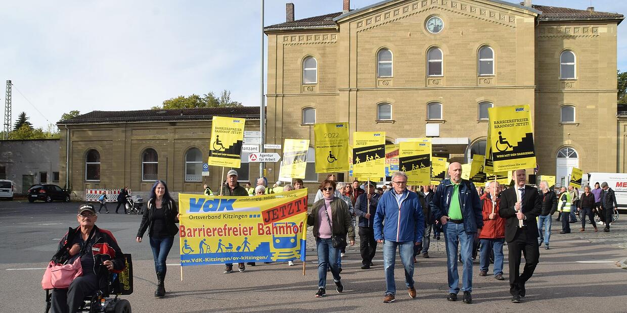 Kitzingen Eine "Zumutung" für Reisende: Grüne fordern Einsatz barrierefreier Züge am Kitzinger Bahnhof Für den "barrierefreien Bahnhof – jetzt" demonstrierten erst Anfang Oktober die Menschen in Kitzingen. // Gerhard Krämer von Bearbeitet von Eike Lenz TEILEN  21.10.2022 Kitzingen – In der Diskussion über einen barrierefreien Ausbau des Kitzinger Bahnhofs setzt sich der Kreisverband von Bündnis 90/Die Grünen jetzt für "kurzfristig praktikable Lösungen" ein. Da der barrierefreie Ausbau des Bahnhofs nach derzeitigem Stand in frühestens zehn Jahren zu erwarten sei, sollten zwischen Kitzingen und Würzburg sogenannte Zwischentaktzüge verkehren, heißt es in einer Pressemitteilung. "Für Rollstuhlfahrer oder Reisende mit Kinderwagen wäre zumindest Richtung Würzburg die Nutzung der Regionalbahnzüge eine praktikable Alternative", wird Kreisverbandssprecherin Eva Trapp zitiert. "Diese sollten barrierefrei vom seitlichen Bahnsteig 9 aus abfahren. Doch leider verkehren diese eigentlich im Fahrplan vorgesehenen Züge bereits seit Jahresanfang nicht und werden derzeit durch Busse ersetzt. Dadurch sind die verbliebenen stündlichen Regionalexpresszüge oft überbesetzt, was es für mobilitätseingeschränkte Reisende zusätzlich schwierig macht." Die Grünen fordern zum Fahrplanwechsel eine VerbesserungDie Grünen haben sich nach eigenen Angaben bereits an DB Regio Bayern sowie die Bayerische Eisenbahn-Gesellschaft (BEG) gewandt, die in Bayern für den Zugverkehr verantwortlich ist. Als Grund wurden dort Fahrzeugmangel und Schwierigkeiten bei der Ersatzteilbeschaffung angegeben. Nach Auffassung des Grünen-Kreisverbands ist der andauernde Zugausfall eine Zumutung für die Fahrgäste, die spätestens mit dem Fahrplanwechsel im Dezember behoben werden sollte. Co-Sprecher Julian Glienke erklärt: "Innerhalb eines Jahres sollte es möglich sein, fahrbereite Züge für diese Linie aufzutreiben. So wären zumindest die Regionalbahnen in Richtung Würzburg ohne Benutzung von Treppen erreichbar." Für Glienke ist die Kitzinger Situation den "politischen Entscheidungen der bayerischen Staatsregierung" geschuldet. "Der barrierefreie Ausbau des Kitzinger Bahnhofs ist mehr als überfällig. Leider reichen die Mittel in Bayern gerade mal für eine Handvoll Bahnhöfe pro Jahr. Dies ist auf die Verkehrspolitik der letzten Jahre auf Landes- und Bundesebene zurückzuführen. Da war kein Straßenbauprojekt zu teuer, für die Modernisierung von Bahnhöfen aber fehlt das Geld."