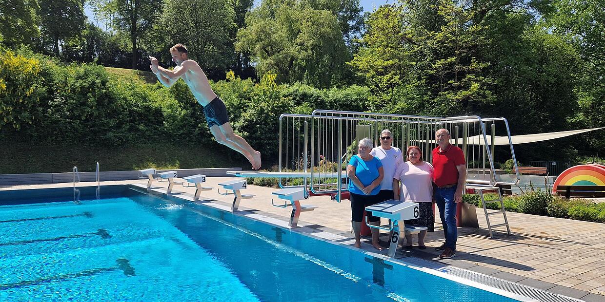 – Mit einem Hechtsprung hüpfte Bürgermeister-Sohn Thomas Volkamer zur symbolischen Saisoneröffnung ins Markt Einersheimer Terrassenbad. Mit dabei waren Kiosk-Betreiberin Christine Spiller, Burkhard Buchfelner von der Badeaufsicht und Bürgermeister Herbert Volkamer.