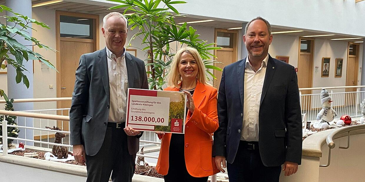 – Ein Spendenscheck über 138.000 Euro symbolisiert die Aufstockung der Sparkassenstiftung für die Stadt und den Landkreis Kitzingen.