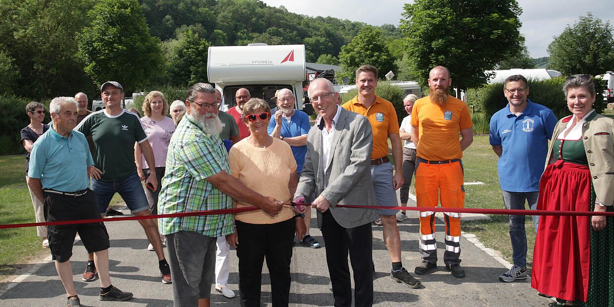 – Die Erweiterung des Wohnmobilstellplatzes in Marktbreit ist offiziell eröffnet. Am Mittwochvormittag durchschnitt Bürgermeister Harald Kopp zusammen mit zwei Gästen aus Neustadt an der Weinstraße das rote Band zur Zufahrt.