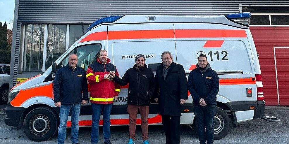 Die Schlüssel des Fahrzeugs wurden von Inhaber Benedikt Pocker an den ASB Kronach übergeben. Geschäftsführer Ingo Holzmann sowie der Erste Vorsitzende, Hans Pietz, und Fuhrparkmanager Benjamin Gehring nahmen das Fahrzeug in Empfang.