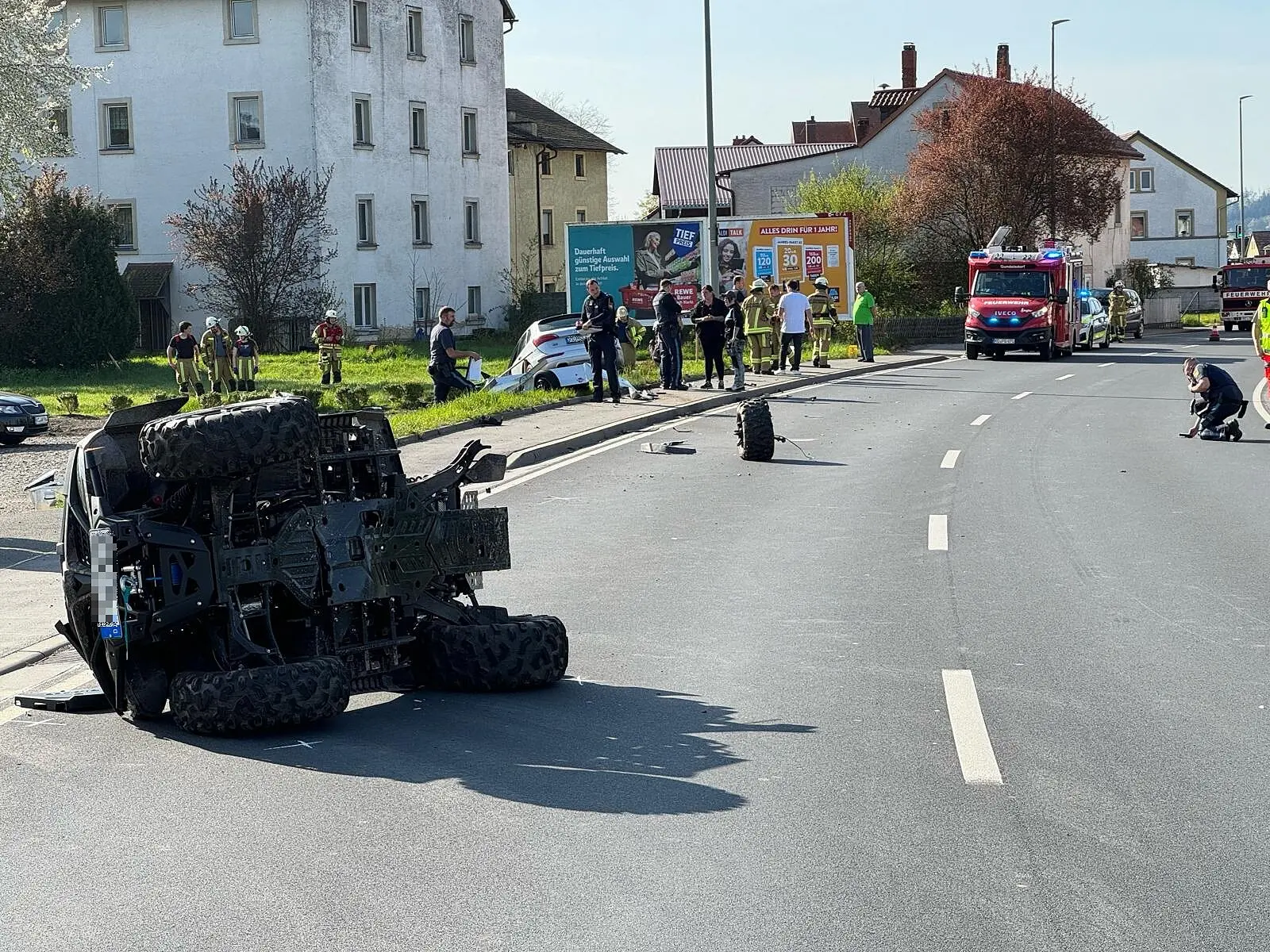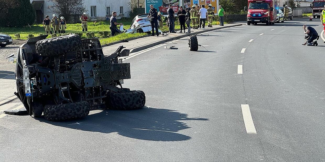 Unfall in Gundelsdorf Quad-Fahrer und Sozius bei Zusammenstoß mit Auto verletzt Bei einem Unfall in der Ortsdurchfahrt Gundelsdorf wurden ein Quad-Fahrer und sein Sozius verletzt. // Feuerwehr von Redakion TEILEN  13.04.2024 Kronach – Auf der B85, Ortsdurchfahrt Gundelsdorf, sind am Samstagvormittag ein Quad und ein Auto zusammengestoßen. Dabei wurden drei Menschen verletzt. Ein 60-jähriger Audifahrer war auf der B85 von Stockheim Richtung Kronach unterwegs und kam aus noch nicht geklärter Ursache auf die linke Fahrbahnseite. Dort kam ihm ein 56-jähriger Quad-Fahrer mit seinem 7-jährigen Enkel als Sozius entgegen. Bei einem Unfall in der Ortsdurchfahrt Gundelsdorf wurden ein Quad-Fahrer und sein Sozius verletzt. // Feuerwehr Der Audi prallte in die linke hinter Fahrzeugseite des Quad sowie gegen den am Quad mitgeführten Anhänger. Im Anschluss kam der Pkw nach rechts von der Fahrbahn ab, durchbrach ein Treppengeländer und blieb schließlich in einem Bachlauf stehen. Mit Rippenbrüchen ins Klinikum Kronach eingeliefert Der Fahrer des Quad wurde mit mehreren Rippenbrüchen ins Klinikum Kronach eingeliefert. Der 7-jährige Sozius kam mit leichten Verletzungen in die Kinderklinik nach Coburg. Das teilte die Polizei am Samstagmittag in einer Pressemeldung mit. Der Rettungsdienst brachte den Unfallverursacher ins Klinikum Sonneberg. B85 bei Gundelsdorf für knapp zwei Stunden gesperrt Da bei dem Audi unter anderem auch die Ölwanne aufgerissen wurde, lief Öl in den Bachlauf. Die verständigte Feuerwehr errichtete deshalb Ölsperren. Beide Fahrzeuge wurden abgeschleppt. Den Gesamtsachschaden schätzt die Polizei auf rund 26.000 Euro. Die B85 war während der Unfallaufnahme für knapp 2 Stunden komplett gesperrt. Die örtlichen Feuerwehren leiteten den Verkehr um. Lesen Sie auch: UPDATE Ursache Fettbrand Feuer in der Hindenburgstraße unter Kontrolle In der Hindenburgstraße in Coburg brannte am Samstag, 13. April 2024, ein Mehrfamilienhaus. Das Gebäude wurde evakuiert, zahlreiche Einsatzkräfte waren vor Ort. Gegen 13 Uhr war das Feuer unter Kontrolle. Heftiger Unfall Motorradfahrer bei Sturz nahe Ebersdorf schwer verletzt Ein schwerer Unfall hat sich in der Nacht auf Samstag auf der Kreisstraße CO13 bei Ebersdorf ereignet. Ein 40 Jahre alter Motorradfahrer wurde dabei schwer verletzt. Kreisstraße CO1 Tödlicher Unfall mit Radfahrer Im Itzgrund hat sich ein schwerer Unfall ereignet.