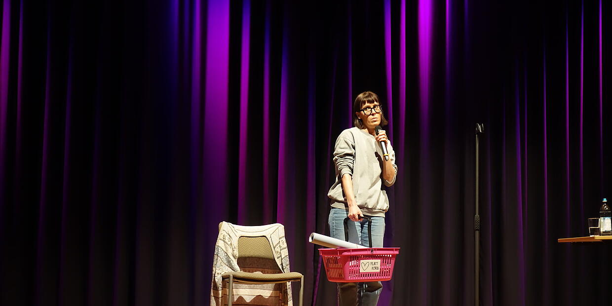 Gleich zu Beginn schlägt sie die Brücke zu den „tapferen Weibern“ von Kronach. Hier sei sie also genau richtig, meint sie, schließlich richte sich ihr Programm vor allem an Frauen ab der Mitte des Lebens, denen der ewige Altweibersommer bevorsteht. Sie selbst sei 42, habe zwei Kinder, eine Scheidung hinter sich und eine Totaloperation, die sie unvermittelt mitten in die Wechseljahre katapultiert habe. Was sie nicht verwundert, denn: „Überall, wo meine Kinder mehr als zwei Wochen waren, herrscht Chaos.“