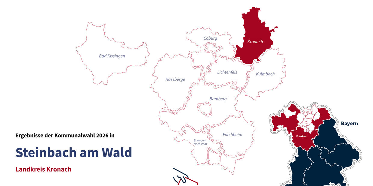 Die Bürgerinnen und Bürger von Steinbach am Wald sind am 8. März 2026 zur Kommunalwahl in Bayern aufgerufen. In der Gemeinde mit rund 3000 Einwohnern wird über die Besetzung des Gemeinderats und des Bürgermeisteramts entschieden. Auf dieser Seite finden Sie die aktuellen Zwischenergebnisse der Auszählung zum Gemeinderat. Die Bürgermeisterwahlen in der Gemeinde finden in einem eigenen Turnus erst wieder im Jahr 2029 statt.