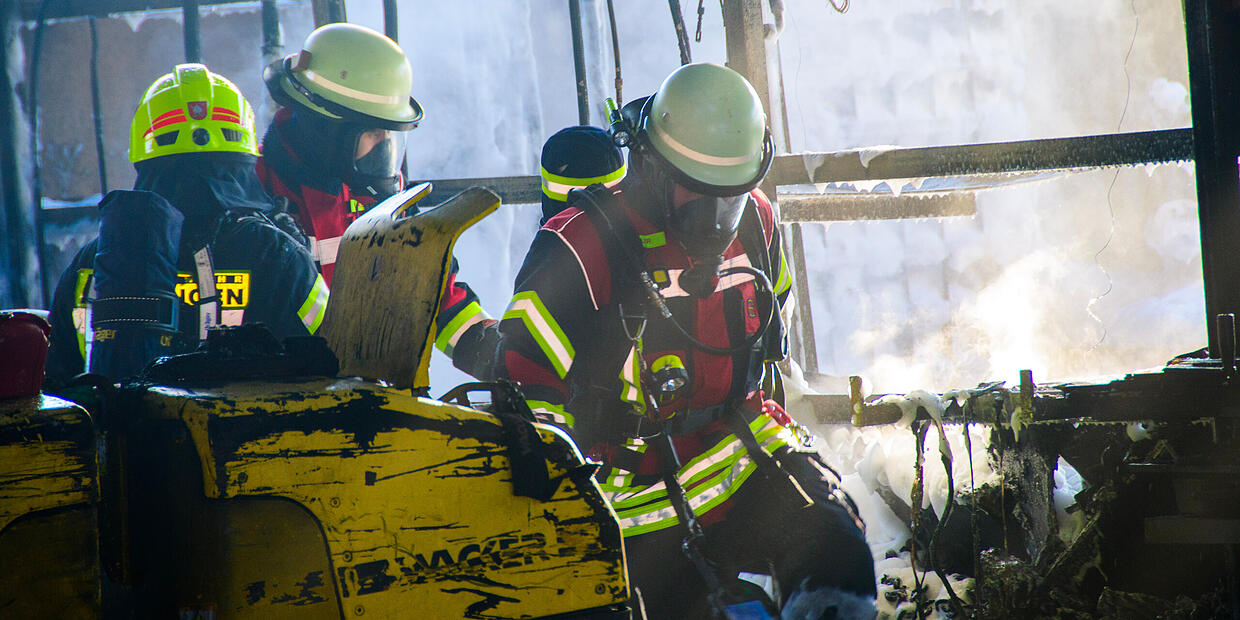 Rund 120 Feuerwehrleute mit 20 Fahrzeugen waren an dem Einsatz beteiligt. Mit schwerem Atemschutzgerät und Schaum löschten Wehrmänner den Brand in der Halle.