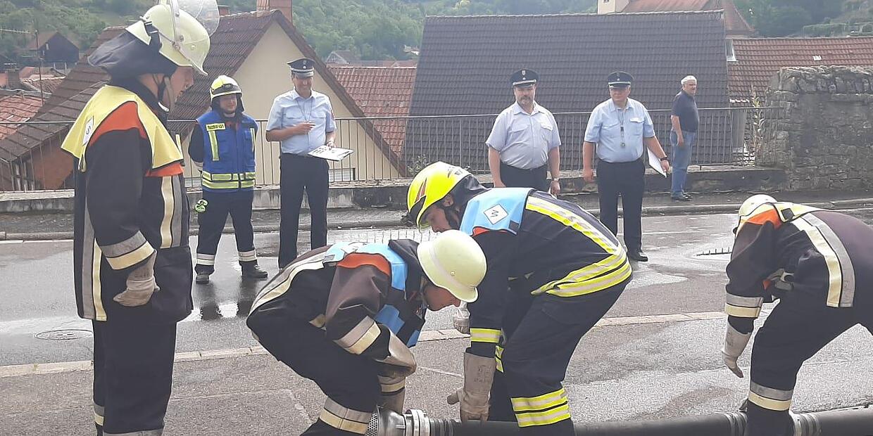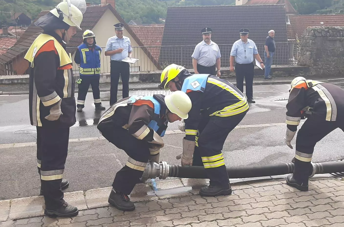 Test Jeder Handgriff sitzt Saugschlauchkuppeln war eine der Aufgaben. // Hilmar Ruppert von Hilmar Ruppert TEILEN  01.08.2025 Sulzthal – Bei einer Leistungsprüfung zeigten 22 Feuerwehrleute aus Sulzthal, Ramsthal, Euerdorf und Wirmsthal ihr eingeübtes Fachwissen. Die Aktiven der Freiwilligen Feuerwehren bilden sich stetig fort und es finden ganzjährig Übungen statt. Ihr Dienst erfolgt in der Freizeit, ist ehrenamtlich und dient der Sicherheit aller. Sehr intensiv – nämlich vier Mal die Woche – haben sich die Feuerwehrmänner in den letzten beiden Wochen auf die Leistungsprüfung vorbereitet.Es galt fit zu sein in Theorie mit Fahrzeugkunde und Erster Hilfe als auch in der Praxis mit der Gruppe im Löschaufbau und dem Aufbau zum Löscheinsatz. An der Leistungsprüfung in den Stufen 1 – 6 beteiligten sich 22 Feuerwehrkameraden in drei Gruppen von den Wehren aus Sulzthal, Ramsthal, Euerdorf und Wirmsthal. Die Prüfung fand am Feuerwehrhaus in Sulzthal statt, als Prüfer fungierten die beiden Kreisbrandmeister Klaus Kippes und Oliver Lukaschewitsch sowie Schiedsrichter Manfred Reich. Alle drei Gruppen haben die benötigte Punktzahl erreicht, die Übung in der festgesetzten Zeit absolviert und damit bestanden. Von der Freiwilligen Feuerwehr Sulzthal waren Ehren-Kreisbrandmeister Klaus Wüscher, Ehren-Kommandant Franz-Josef Vierheilig und Ehrenmitglied Alfred Tremer zugegen. Von der politischen Gemeinde überzeugten sich Bürgermeister August Weingart, 2. Bürgermeister Klaus Keller, Gemeinderätin Corinna Seufert und Gemeinderat Willi Diez vom Leistungsstand der Gruppen. Von der Freiwilligen Feuerwehr Sulzthal nahmen teil: Kommandant Stefan Rechtenbacher, stellvertretender Kommandant Frederik Schießer, Andreas Sauerhöfer, Alexander Büttner, Benjamin Volkmuth, Christian Schießer, Heiko Holzberger, Johannes Halbig, Marcel Paries und Paul Mende. Teilnehmer der Leistungsprüfung in Sulzthal. // Corinna Seufert