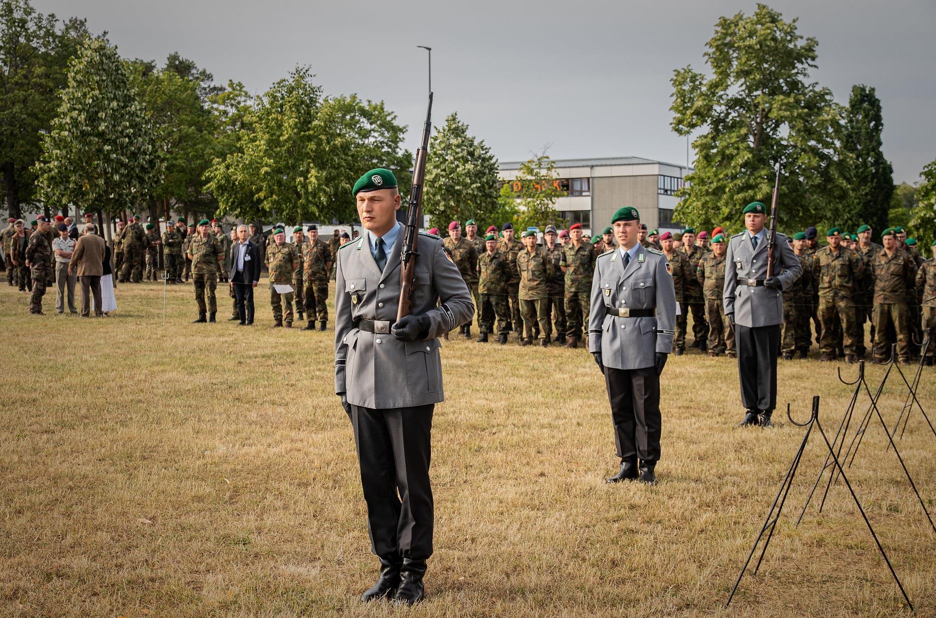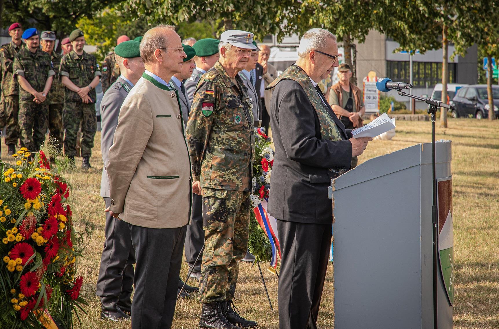 Eröffnung Park der Erinnerung am Lagerberg Hammelburg Stolz eröffnete Brigadegeneral Michael Matz, General der Infanterie und Kommandeur Infanterieschule, den „Garten der Steine“. Auch einige Angehörige der ehemaligen Verbände und Einheiten des Lagerbergs sowie zahlreiche Lokalpolitiker waren hierzu angereist. // Benjamin Bendig von Redaktion TEILEN  20.07.2023 Lager Hammelburg – Am Tag der Infanterie wurden der „Garten der Steine“ eröffnet und Kränze niedergelegt. Gleich zwei Veranstaltungen im Zeichen der Erinnerung gab es am Tag der Infanterie in Hammelburg. Erinnerungskultur ist das bewusste Rekapitulieren der Vergangenheit, um die Gegenwart zu verstehen und die richtigen Schlüsse für die Zukunft zu ziehen. So hat die Infanterieschule unter ihrem Kommandeur und dem General der Infanterie, Brigadegeneral Michael Matz, nun einen Ort der Erinnerung geschaffen und ihn am Tag der Infanterie eröffnet. „Der Mensch ist erst wirklich tot, wenn niemand mehr an ihn denkt“, mit diesem Zitat von Bertolt Brecht begann Brigadegeneral Matz seine Eröffnungsrede. Nicht ohne Grund, denn die Bundeswehr pflegt aus guten Gründen eine Kultur der Erinnerung und des Gedenkens. Nicht nur an Menschen, sondern auch an Verbände und Einheiten. Steine zunächst sich selbst überlassen Bereits im Jahr 2021 entstand die Idee, einen zentralen Ort der Erinnerung und des Gedenkens an der Infanterieschule zu schaffen. Nachdem unterschiedlichste Verbände und Dienststellen des Lagerbergs – zuletzt das Offizieranwärter-Bataillon 2 – aufgelöst wurden, wurden die Erinnerungssteine weitestgehend sich selbst überlassen. 16 Gedenksteine wurden zusammengetragen und sind nun im Garten der Steine vereint. Sie haben nun einen würdevollen Platz auf dem Lagerberg bekommen. // Benjamin Bendig Der „Garten der Steine“ soll dies nun ändern und fasst somit alle Erinnerungsgaben der ehemaligen Verbände und Einheiten des Lagerberges und an die Menschen, die in diesen Einheiten gedient haben, zusammen. Die Erinnerungsräume im sogenannten Fähnrichheim zusammen mit dem Garten der Steine und dem Ehrenhain bilden nun einen gemeinsamen Ort der Erinnerung. Es entstand also ein „Park der Erinnerung auf dem Lagerberg“, wie der General es beschrieb. Er soll die Möglichkeit sowohl des stillen Gedenkens und der Besinnung als auch gemeinsamer Gedenkveranstaltungen und anderer traditionsbildenden Maßnahmen bieten. Der Toten gedenken Der Tag der Infanterie ist eine Großveranstaltung, zu der die militärischen Führer der Infanterie geladen werden, um diese an den aktuellen Entwicklungen der Truppengattungen der Infanterie und infanteristisch eingesetzten Kräften teilhaben zu lassen. Aber nicht nur die Entwicklungen von Fahrzeugen oder Waffen stehen im Fokus auch an die toten Kameraden der Infanterie wird im Rahmen einer Gedenkfeier erinnert. Dazu fanden sich die Gäste am Stein der Infanterie ein. Die Redner anlässlich der Kranzniederlegung waren Generalmajor a.D. Dr. des. Josef Blotz als Präsident Bund Deutscher Infanterie, Brigadegeneral Michael Matz und der evangelische Militärpfarrer Rüdiger Bernhard. // Christoph Orth In würdevollem Rahmen wurde der Verstorbenen gedacht und Kränze des Bund der Deutschen Infanterie, der Infanterieschule sowie die einer französischen und einer finnischen Delegation niedergelegt. Ein würdevoller Rahmen und ein wichtiges Zeremoniell, wie Brigadegeneral Michael Matz sagte: „Wir stehen heute hier, weil dieses Gedenken für uns eine Frage von Haltung, Korpsgeist und Pflichtgefühl ist. Wir stehen hier, weil wir wissen, welcher Einsatz am scharfen Ende des Soldatenberufs gefordert sein kann und wir stehen hier, weil dies auch ein Ausdruck von gelebtem Friedenswillen ist, für den wir immer wieder ringen und für den wir immer wieder einstehen müssen.“ Der Bund Deutscher Infanterie, die Infanterieschule und die finnische und französische Delegation legten Kränze nieder. // Christoph Orth Noch immer persönlich betroffen Generalmajor a.D. Dr. des. Josef Blotz, der Präsident des Bund der Deutschen Infanterie e. V. erläuterte, dass auch ein Mitglied seiner Familie unter den Opfern der Weltkriege ist. Der Großvater des Generalmajors fiel 1914 nur vier Wochen vor der Geburt seines Sohnes. Aber nicht nur die persönliche Betroffenheit solle im Fokus stehen, denn auch der Soldaten der Infanterie und Bundeswehr müsse gedacht werden, genauso wie den Opfern der Verbündeten. Die Hoffnung auf Versöhnung müsse hierbei immer an erster Stelle sein, denn: „Wie wir aktuell vor Augen geführt bekommen – Krieg ist immer möglich, Frieden jedoch auch.“ Eine Sache der Ehre – so kommt zur Kranzniederlegung traditionell eine Abstellung des Wachbataillons, um der Zeremonie eine würdevolle Begleitung zu geben. // Christoph Orth Auch der evangelische Militärpfarrer des Standorts Hammelburg, Rüdiger Bernhard, richtete einige Worte an die Gäste. „Seit Menschengedenken ist der Frieden in Gefahr“, sagte er, doch: „Wir müssen unsere Wohlfühl- und Komfortzone verlassen, um uns dem entgegenzustellen“, lautete sein Appell. Er wünsche sich und den Menschen Kraft, um Krieg und Leid zu verhindern, so Bernhard weiter. Hier finden Sie weitere Berichte über den Tag der Infanterie: Bundeswehr Bildergalerie zum Tag der Infanterie 2023 Vorträge und das Annageln einer neuen Fahne drinnen, Industrieschau draußen: Das war der erste Tag des Tages der Infanterie 2023 in Hammelburg. Bundeswehr Neue Nato-Partner besuchen Tag der Infanterie Seit 4. April ist Finnland offiziell Mitglied der Nato. Die Infanterieschule Hammelburg pflegt schon länger Kontakte zu finnischen Infanteristen. Tag der Infanterie Bundeswehr Hammelburg: Industrie stellt Waffen vor 21 Aussteller geben Einblicke in aktuelle Entwicklungen. Groß ist das Interesse vor allem am aufgerüsteten Radpanzer Boxer und am neuen Luftlandefahrzeug Caracal. Beide werden ab 2025 geliefert. Bundeswehr Alles zum Tag der In