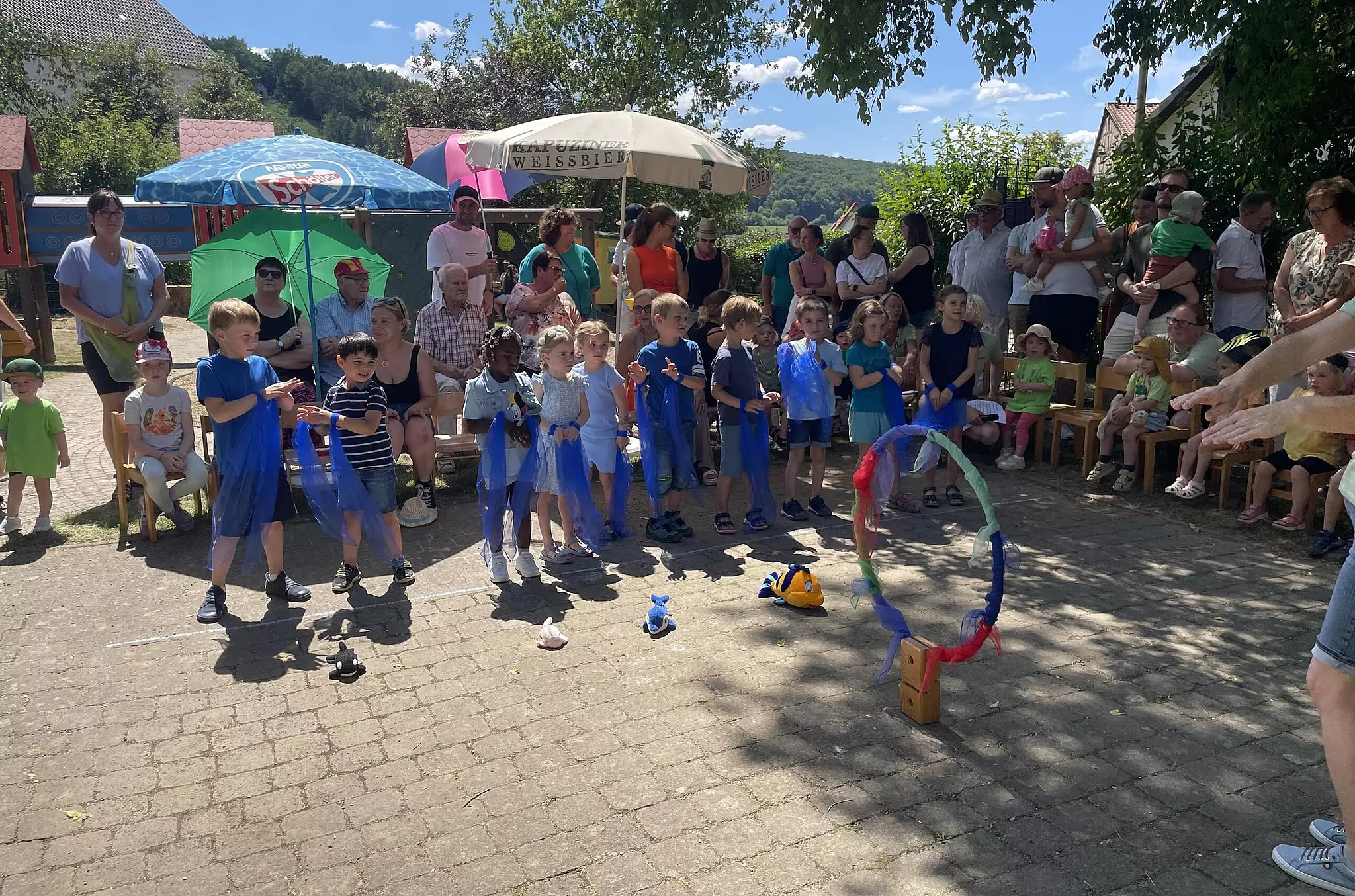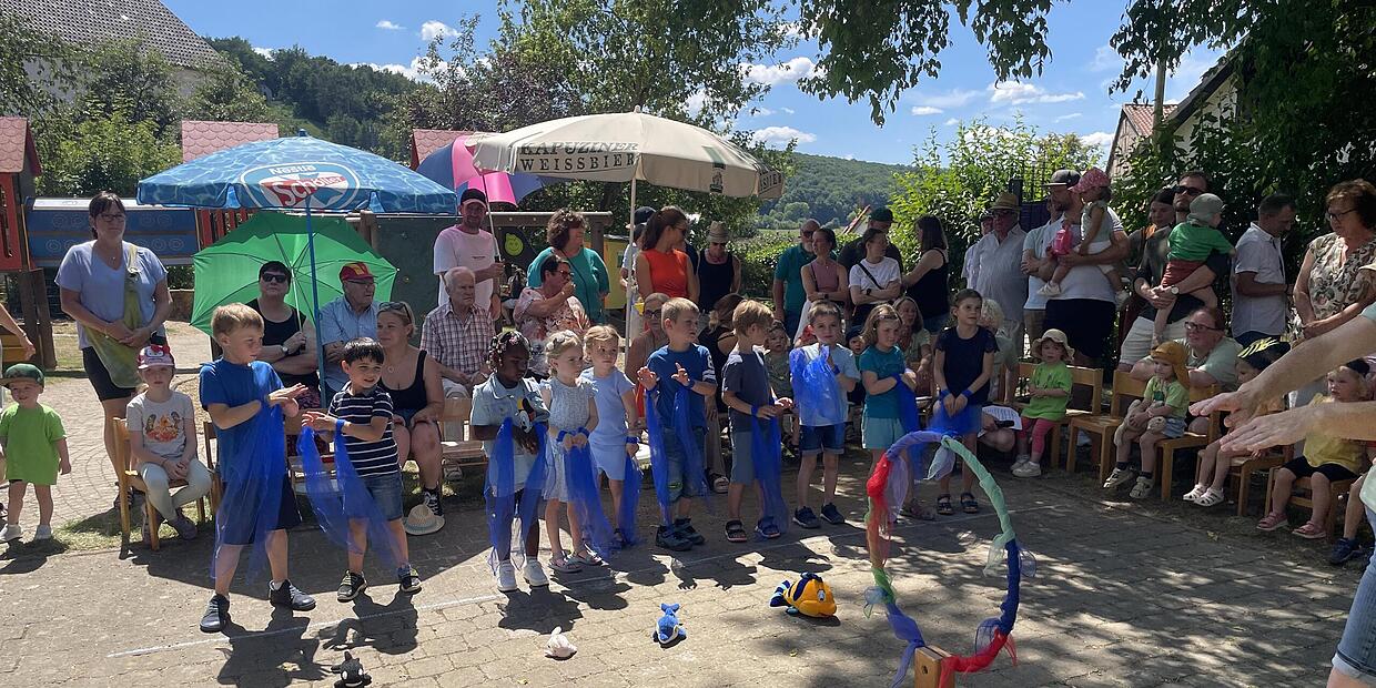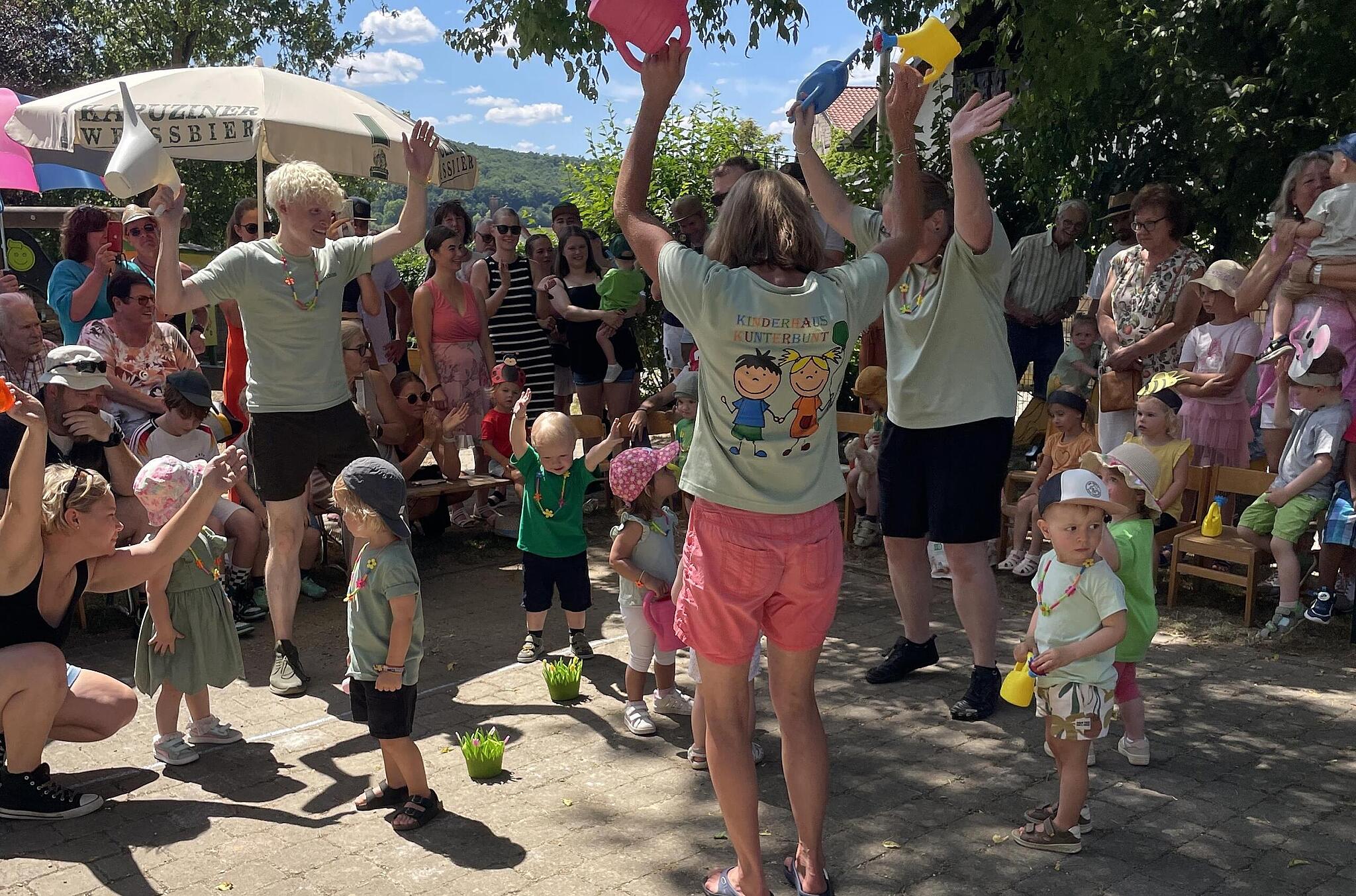 Fest Buntes Fest zum Jubiläum Das Ramsthaler Kinderhaus Kunterbunt feiert das 75. Bestehen beim jährlichen Kindergartenfest. // Andreas Lomb von Andreas Lomb TEILEN  11.07.2025 Ramsthal – Das „Kinderhaus Kunterbunt“ feierte sein 75-jähriges Bestehen. Beim jährlichen Sommerfest wurde so einiges geboten. Das Ramsthaler „Kinderhaus Kunterbunt“ feierte sein 75-jähriges Bestehen im Rahmen des diesjährigen Kindergartenfestes. Zahlreiche Eltern, Großeltern und Verwandte waren gekommen, um sich ein Bild vom heutigen Kindergarten zu machen. Bei einigen Besuchern war zu hören, dass sie das Gebäude seit Jahrzehnten nicht mehr von innen gesehen haben und nun die Gelegenheit nutzten. Was 1950 zu Beginn in erster Linie dafür gedacht war, die Kinder zu beschäftigen, während die Eltern entweder berufstätig oder häufig landwirtschaftlich tätig waren, hat heute einen ganz anderen Anspruch. Der höhere Anteil der berufstätigen Mütter erfordert eine frühzeitigere Betreuung der Kinder und der pädagogische Anspruch ist mit dem früherer Zeiten nicht zu vergleichen. Während früher zwei Frauen die Kinder im Kindergarten betreuten, ist heute ein deutlich größeres und qualifiziertes Team erforderlich, um die Anforderungen der Eltern und der Gesellschaft zu erfüllen.Kindergartenleiterin Claudia Kolb begrüßte die Eltern im Außenbereich des Kindergartens und freute sich über das rege Interesse. Sie kündigte die von allen Besuchern erwartete Aufführung der Kleinen an. Nach Altersgruppen aufgeteilt, stellten die Kinder die Schöpfung dar und waren teilweise schüchtern, teilweise aber auch sehr selbstbewusst auf der Bühne. Die musikalische Betreuung hatte Heike Wolf-Meindl übernommen, die auch die Kinder in der musikalischen Früherziehung des Kindergartens betreut. Eine große Tombola, die dank vieler Sponsoren eine große Anzahl attraktiver Preise bot, fand großes Interesse.Bürgermeister Rainer Morper freute sich auch über den regen Zuspruch zur Veranstaltung und betonte die Bedeutung des Kindergartens als eine der Pflichtaufgaben der Gemeinde. Als dann noch eine Seifenblasenartistin ihre Show zeigte, waren alle Kinder verzaubert und genossen aktiv die Aufführung. Kindergartensommerfest in Ramsthal // Andreas Lomb Kindergartensommerfest in Ramsthal // Andreas Lomb