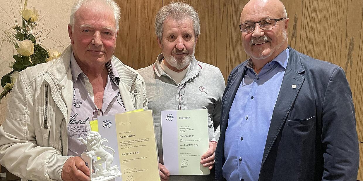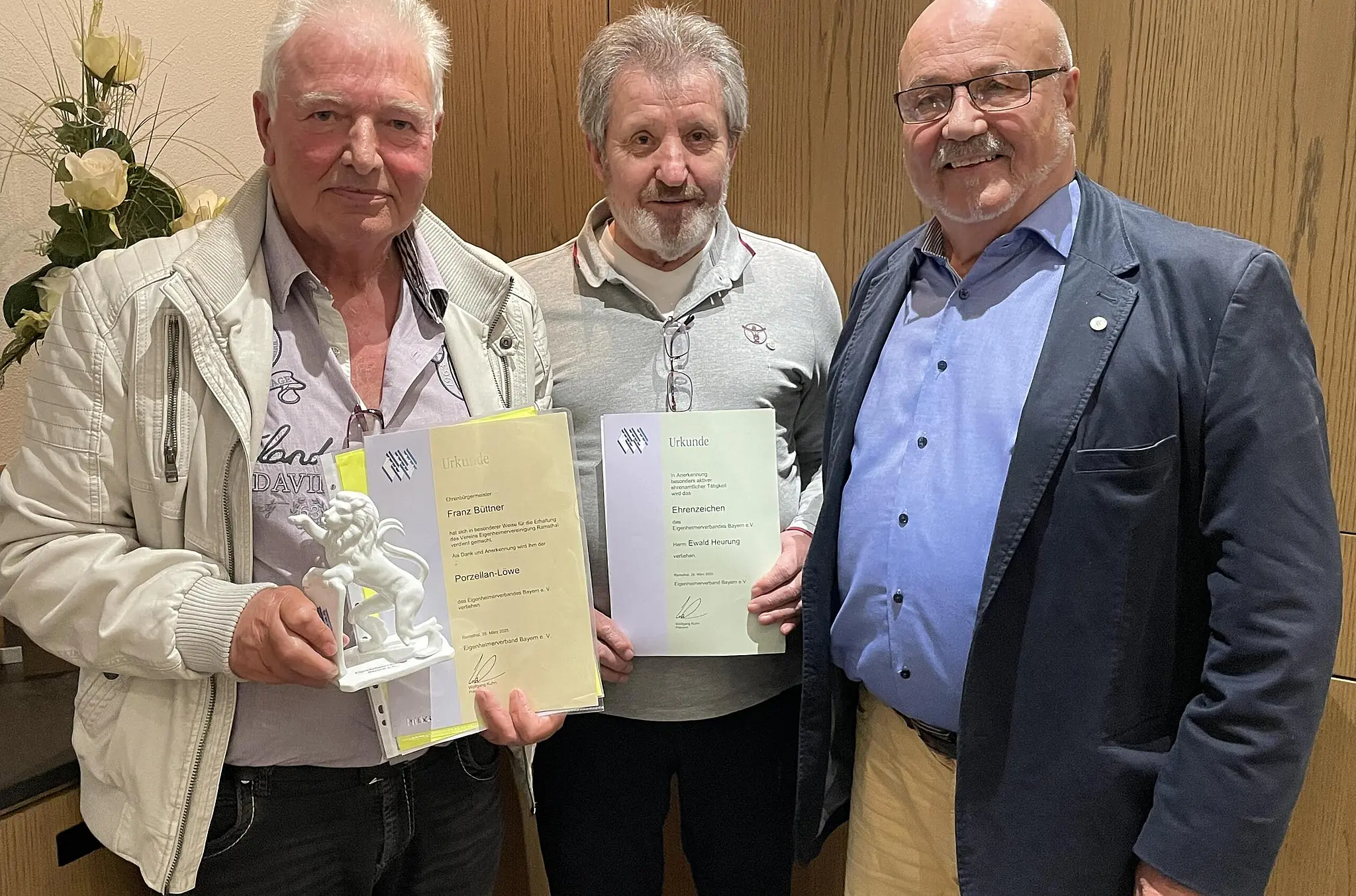 Eigenheimer Porzellan-Löwen verliehen Unser Bild zeigt die Geehrten (von links) Franz Büttner und Ewald Heurung zusammen mit dem Vizepräsident des Eigenheimerverbandes Bayern, Heinz Amling. // Andreas Lomb von Andreas Lomb TEILEN  07.04.2025 Ramsthal – Altbürgermeister Franz Büttner ist mit einer besonderen Auszeichnung bedacht worden. Kassierer Ewald Heurung wurde für seine herausragende Tätigkeit das Ehrenzeichen des Verbandes verliehen. Artikel anhören Sie können uns nicht hören? Diese Funktion können Sie exklusiv mit PLUS nutzen. Erhalten Sie uneingeschränkten Zugriff auf alle Audioinhalte, Artikel und vieles mehr. Vorlesefunktion freischalten Bereits -Zugriff? Jetzt Anmelden Der neue Vorsitzende der Eigenheimervereinigung Ramsthal, Andreas Lomb, freute sich: Denn zur Jahreshauptversammlung war eine stattliche Zahl an Mitgliedern gekommen. Der Bericht des Kassierers Ewald Heurung dokumentierte stabile finanzielle Verhältnisse. Die Beiträge der letzten beiden Jahre waren erst nachträglich im Januar eingezogen worden. Für 2025 soll der Einzug Ende Juni erfolgen und zukünftig wieder im Februar, so die Information. Der Tätigkeitsbericht des Vorsitzenden war überschaubar, da die Neuwahlen erst sechs Monate zurücklagen. Im Wesentlichen habe man sich darum gekümmert, die Mitgliederverwaltung auf aktuellen Stand zu bringen. Die Verbandsbeiträge der beiden vergangen Jahre wurden nachgezahlt. Lomb dankte den Mitgliedern für die Aktualisierung ihrer Daten. Für das kommende Jahr seien verschiedene Vorträge und Kurse geplant. Zur Grundsteuerreform soll es eine Veranstaltungen geben, wie auch zu notariellen Fragen wie Testament, Vorsorgevollmacht und Patientenverfügung. Auch das Thema Energieberatung steht auf dem Plan. Zu Beginn des kommenden Jahres ist ein Baumschnittkurs vorgesehen. In nächster Zeit dürfte durch die Gemeinde eine Informationsveranstaltung zur Abrechnung der Mischwasserbehandlungsanlage mit Regenrückhaltebecken stattfinden. Die Mitglieder der Eigenheimervereinigung wurden aufgefordert, an dieser Veranstaltung teilzunehmen. Das Thema sei bedeutend. Der Vorsitzende informierte die Mitglieder über eine im Jahr 2026 anstehende Beitragserhöhung seitens des Landesverbandes. Die Leistungen der im Beitrag eingeschlossenen Bauherrenhaftpflicht, Haus- und Grundstückshaftpflicht und Rechtschutzversicherung seien verbessert worden. Außerdem erhielten die Mitglieder auch eine kostenlose Rechtsberatung. Die Versammlung beschloss eine Beitragsanpassung ab 2026 auf 35 Euro . Der Vizepräsident des Eigenheimerverbandes Bayern, Heinz Amling, informierte über die aktuelle Verbandsarbeit. Mit Spannung erwartet er die möglichen Veränderungen durch den Regierungswechsel in Berlin. In Deutschland sei der Anteil von Wohneigentum im Vergleich zu anderen Ländern deutlich zu niedrig. Um dies zu ändern, sei massive Unterstützung und Vereinfachung der Genehmigungs- und Verwaltungsverfahren erforderlich. Die Eigenheimervereinigung sehe sich als Lobby für die Haus- Wohnungs- und Grundstücksbesitzer. Für den Ramsthaler Verein freut er sich, dass dieser wieder eine Führung habe, erklärte Heinz Amling. Dies verdanke er im Wesentlichen Altbürgermeister Franz Büttner, der sich im besonderen Maße bei der Neufindung der Führungsmannschaft verdient gemacht habe. Für seinen Einsatz über viele Jahre, auch für den Erhalt der Eigenheimervereinigung Ramsthal, überreichte ihm Amling den Eigenheimer-Porzellan-Löwen. Kassierer Ewald Heurung wurde für seine herausragende aktive Tätigkeit das Ehrenzeichen des Verbandes verliehen. Hinweis der Redaktion: Der Autor Andreas Lomb ist Vorsitzender der Eigenheimervereinigung Ramsthal