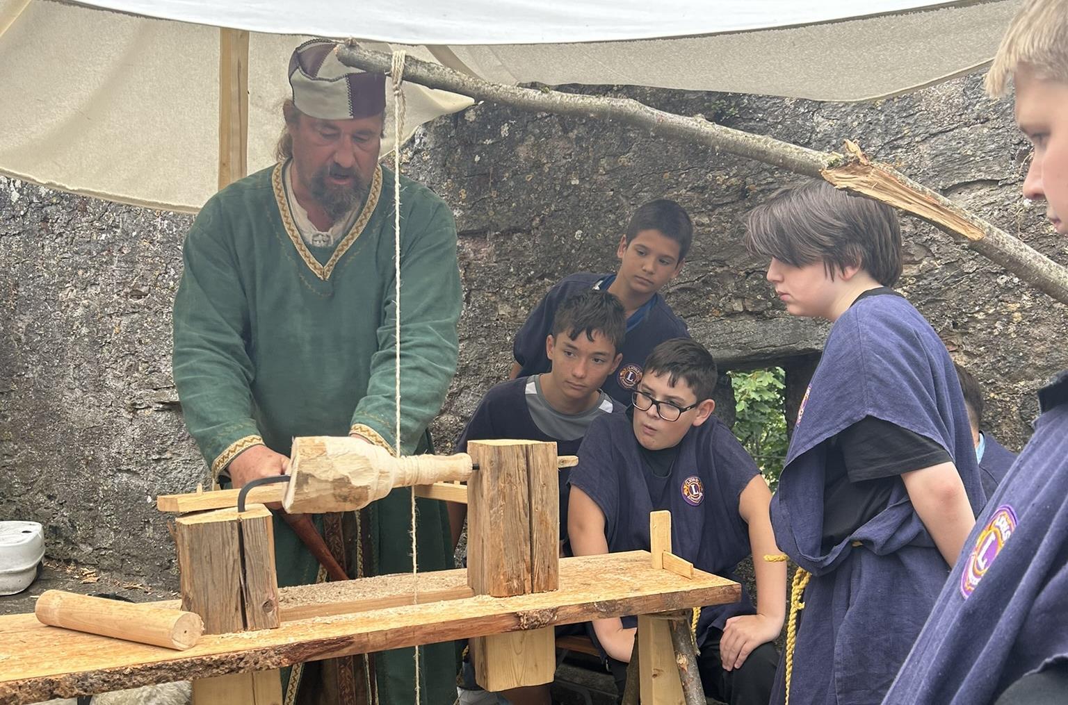 Erlebnis Einblick ins Leben eines Ritters Das Schwertführen will gelernt sein. Unter Aufsicht eines kundigen Ritters übten die Knappenschüler diese historische Kampfart. // Matthias Schiebl von Winfried Ehling TEILEN  30.07.2025 Trimberg – Unterricht einmal ganz anders: Die sechsten Klassen der Bad Kissinger Kliegl-Schule erlebten in der Knappenschule Geschichte zum Anfassen. Erneut lud der Verein der „Freunde der Trimburg“ Schulklassen zu seiner Knappenschule auf die Burg ein, um ihnen das ritterlich-höfische Leben „hautnah“ zu vermitteln. Die Knappenschule, die Vorstandsmitglied Matthias Schiebl initiierte und organisiert, ist bei den Schülerinnen und Schülern als abenteuerlicher Outdoor-Unterricht bekannt und beliebt. Diesmal waren die sechsten Klassen der Bad Kissinger Kliegl-Schule Gäste auf der Ruine. Gewürzkunde und Handwerk Für das Event bieten die Freunde der Trimburg einiges auf, um den Schülern einen authentischen Einblick vom Leben auf einer Ritterburg zu vermitteln, an denen die Geladenen selbst mitwirken durften. Schwertkampf und Gewürzkunde, Handwerk und tägliches Kochen, Bogenschießen und höfisches Leben, dazu die Geschichte der Trimburg vor 500 Jahren, waren die „Lernfächer“ für einen Tag. Verschiedene Aufgaben Aus München war die Gefolgschaft „Sir Galahad“ angereist und aus Tübingen kam „Sgeimh Solais“, eine englische Gefolgschaft um Geoffrey, Lord of Egremont. Sie führten gemeinsam mit den Hammelburger Reservisten die 30 Jugendlichen durch die Knappenausbildung. Von Minnesänger Hugo von Trimberg (Matthias Schiebl) willkommen geheißen, ging dieser bei einem Rundgang durch die Burg auf die Historie der Burg und die Bauernaufstände ein, die exakt vor 500 Jahren im Saaletal Geschichte schrieben. Danach erlernten Mädchen und Jungen die Aufgaben und Laufbahn (Page, Knappe, Junker und dann die Berufung zum Ritter) eines Knappen. Am offenen Feuer der Lagerküche ließ der Zweite Ritter, Sir Richard von Wolfenstein, an den Gewürzen schnuppern und Datteln kosten und erklärte, welche Lebensmittel im 14. Jahrhundert zur Verfügung standen und welche seinerzeit noch nicht bekannt waren. Letztere waren die heute täglich verwendeten Gemüsesorten wie Tomaten, Paprika, Kartoffeln und andere. Die Drechselbank war die nächste Station. Mit diesem Handwerk und dem Gerät aus frischem Haselholz konnten beispielsweise Griffe, Sprossen oder Krüge hergestellt werden. Schwerterkampf Beim Schwertkampf zeigten die Ritter und Junker, wie diese Waffe richtig geführt wird und was es heißt, „auf der Hut zu sein“. In einem Showkampf erklangen die Klingen, wenn sie aufeinander prallten. In Zweiergruppen konnten die jungen Gäste ihre eigenen Erfahrungen machen und ein Gefühl dafür bekommen, wie schwer ein Schwert ist. Im Burggraben, auf dem Bogenplatz, zeigten Bogenschützen die richtige Haltung an dieser Waffe und das Zielen auf eine Scheibe. Die Jugendlichen durften ein ganzes Set an Pfeilen schießen und so manche(r) entdeckte hier seine Talente, wie auch an den anderen Stationen. Speisen an der Rittertafel Zum Abschluss durften die Klassen an der authentisch nachgebildeten Rittertafel teilnehmen und erfuhren über die Gepflogenheiten zu Hofe und über die Wappenkunde. Danach tafelten sie mit den Rittern und den Edeldamen. Den Klassenlehrern fiel die hohe Aufmerksamkeit ihrer Schützlinge auf – offensichtlich ein Zeichen von großem Interesse. Die Pädagogen und Schüler bedankten sich abschließend bei den Akteuren für die erlebnisreichen Stunden und die Einblicke in die kulturellen Wurzeln im Saaletal. Nacht der Poesie Die nächste Veranstaltung auf der Trimburg: Am Donnerstag, 14. August, startet wieder die „Nacht der Poesie“. Eintritt ist ab 19 Uhr. An der Drechselbank erfuhren die Sechsklässler, welche täglich benötigen Gebrauchsgegenstände in früheren Zeiten aus Holz entstanden. // Matthias Schiebl