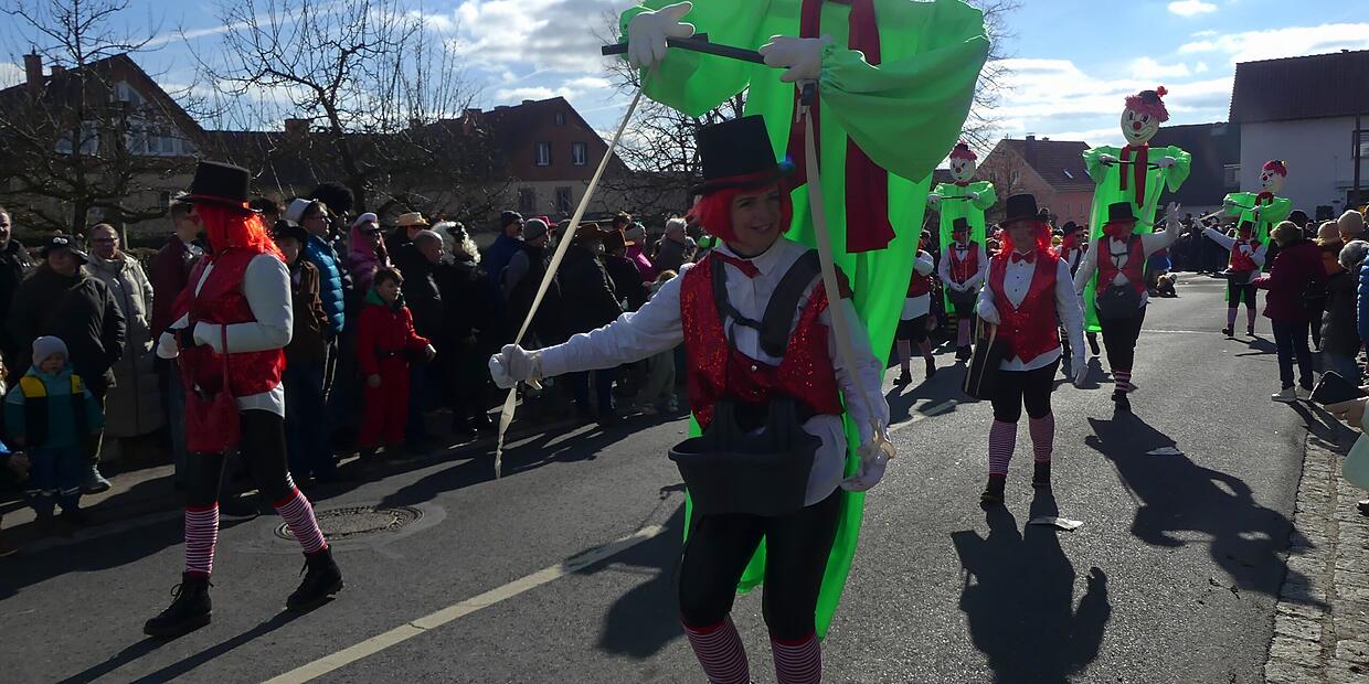 Auch in diesem Jahr waren neben den „Einheimischen“ zahlreiche Gäste aus den Nachbarorten und der nahen Rhön im Zug vertreten. Sie präsentierten sich meist in aufwendig geschmückten Partywagen. Die Fußgruppen kamen unter anderem als Marionetten und Gärtnerinnen.
