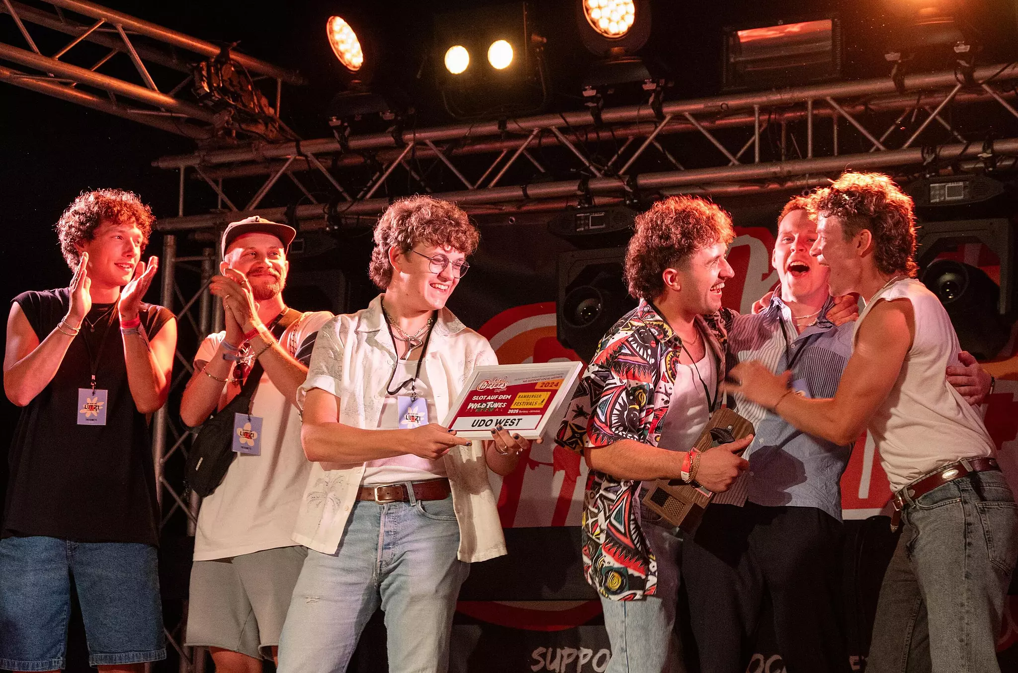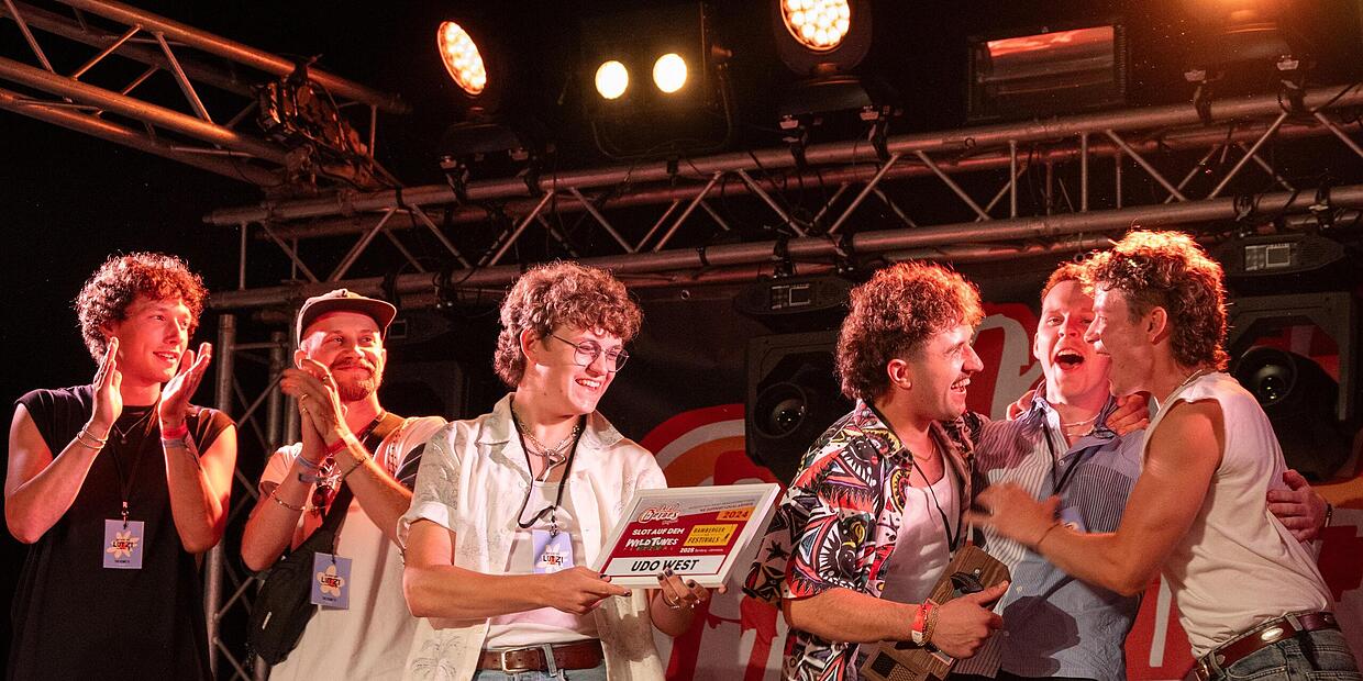 Local heroes „Udo West“ hat es ins Bundesfinale geschafft „Udo West“ konnten ihr Glück über den Sieg im bayerischen Landesfinale kaum fassen. // Martin Schöffel von Redaktion TEILEN  10.07.2024 Rottershausen – Beim Landesfinale von Local heroes auf dem Lutzi-Festival machte eine Band ganz besonders von sich Reden. Das „ab geht die Lutzi 2024“ ist Geschichte und damit auch das Local-heroes- Landesfinale. Zum vierten Mal trug der bayerische Ableger von Deutschlands größtem und ältestem Non-Profit-Musikpreis seine Veranstaltung auf der Zeltbühne des fränkischen Festivals aus. Die Gewinner des Abends: Udo West aus Würzburg. Sie sind nun offiziell Bayerns beste Newcomer-Band und ziehen im kommenden September ins Bundesfinale ein. Gemeinsam mit dem Local-heroes-Bayernteam geht es dann auf Schloss Hundisburg bei Magdeburg. Dort dreht die Band mit allen anderen Landessiegern eine professionelle Musik-Dokumentation. Und hier fällt natürlich auch die Entscheidung, wer die Local heroes 2024 werden. „Wir sind alle gut gelaunt, wir haben Lust auf Party“, lautete ihr Fazit kurz nach der Verkündung. Es sei immer wieder schön zu sehen, wie viele Leute wegen ihnen als Band kämen, textsicher mitsingen und mit ihnen feiern würden. Das berühre sie jedes Mal wieder.Noch ist das Bundesfinale für sie als Band in weiter Ferne. Überraschungen sind jedoch auch bei dieser Gelegenheit nicht ausgeschlossen. Immerhin gingen „Udo West“ bereits anlässlich des Landesfinales einen ungewöhnlichen Weg und präsentierten ausschließlich neue Songs. „Ich schreibe immer viel Musik, weil es mir einfach sehr viel Spaß macht und ich release auch viel, weil ich durch das Studium ein bisschen mehr Zeit dazu habe“, erklärt Frontmann Ludwig. „Ich glaube, gerade wenn Fans bei mehreren Auftritten im Jahr kommen, sollte man auch denen, die öfters da sind, immer was Neues bieten.“ Die eigene Aufregung, die dieser Umstand mit sich bringe, sei zudem ein besonders schönes Gefühl. Wie etwa bei „Mama Leone“. Dieser Song sei erst am Landesfinaltag erschienen. Erst am Abend zuvor wurde er das erste Mal gemeinsam gespielt. Ein Wagnis, welches sie durchaus eingehen können, denn sie können sich blind aufeinander verlassen. „Ich glaube, das ist sowohl darauf zurückzuführen, dass wir uns menschlich gut verstehen. Auf der anderen Seite spielt unter anderem auch eine Rolle, dass der Gitarrist, der Bassist und ich, mein Bruder und mein Cousin, schon mehr als zehn Jahre zusammen spielen. Da weiß man auch musikalisch irgendwann, was der andere meint.“Das sah auch die Jury so. „Udo West, für mich ist es so ein bisschen 80er Jahre, Falco, Wiener Schmäh mit Funky und Entertainment“, so Juror Jojo Schulz. „Sie haben drei neue Lieder gespielt, die sie noch nie live gespielt haben, und zwei Lieder, die sie vor zehn Tagen komponiert haben, noch dazu. Mutig.“ Begeistert habe er beobachtet, dass dennoch das halbe Zelt mitgesungen habe. „Das liegt einfach daran, dass sie schon so komplett sind und schon so viele Fans regional haben. Also nicht nur hier in Würzburg und in Nürnberg, sondern auch andernorts. Das ist echt phänomenal.“ Keine Zweifel gab es auch für Jurorin Janina Ruopp. „Das waren die Besten an diesem Abend. Sie sind so geil eingespielt und können sich so toll aufeinander verlassen. Da können Fehler passieren. Jeder fängt sich gegenseitig auf. Das ist wirklich bemerkenswert. Diese Band könnte sich einfach in eine warme Badewanne setzen und es einfach laufen lassen.“ „Udo West“ begeisterten nicht nur Publikum und die Jury, sondern auch eine echte Größe im Musikgeschäft. Bosse, Headliner am Lutzi-Freitag, sah sich ihren Auftritt an und war sichtlich beeindruckt. „Ich bin über das Festivalgelände geschlendert und habe dann diese Musik gehört und bin dann einfach ins Zelt gegangen“, erzählt er kurz nach deren Auftritt. „Es war total heiß, ich fand es krass, wie viele Leute da schon mitziehen konnten.“. Begeistert war er vor allem von ihrem Mix aus verschiedenen Musikrichtungen.Juror Jojo Schulz zog insgesamt ein positives Fazit des Abends. „Das Niveau war nicht immer so stark wie heute. Letztes Jahr war es auch sehr stark. Aber dieses Jahr waren wir alle doch ziemlich überrascht.“„Udo West“ möchten das Erlebnis local heroes Bayern nicht mehr missen. Insgesamt sei der Landesfinaltag für sie entspannt gewesen. Das habe aber auch daran gelegen, dass sie von Profis unterstützt worden seien. Insgesamt sei das Ganze eine sehr schöne Möglichkeit, gehört zu werden, sich mit den anderen Künstlerinnen und Künstlern auszutauschen und neue Fans zu gewinnen. „Der Austausch hier untereinander ist definitiv wichtig“, werden sie nicht müde zu betonen.