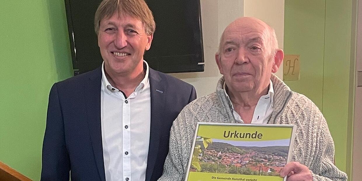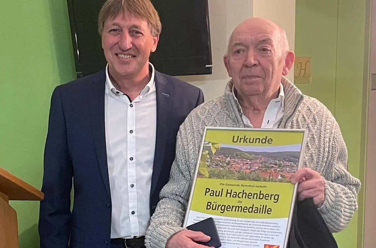 Neujahrsempfang Bürgermedaille für Paul Hachenberg Paul Hachenberg bei der Verleihung der Ramsthaler Bürgermedaille, links neben ihm Bürgermeister Rainer Morper. // Andreas Lomb von Andreas Lomb TEILEN  10.02.2025 Ramsthal – Ob in den Vereinen, im Dorf bei Veranstaltungen oder einfach nur, wenn es gilt, ein Problem technischer Art zu lösen: Paul Hachenberg ist immer da und hat eine Lösung. Der in diesem Jahr relativ spät stattfindende Neujahrsempfang der Gemeinde Ramsthal im Haus Erlebenskunst war wie immer gut besucht. Bürgermeister Rainer Morper konnte neben den Ehrenbürgern und Trägern der Bürgermedaille der Gemeinde auch den Pastoralreferenten Dirk Rudolph als Vertreter der Pfarreiengemeinschaft Saalethal begrüßen. Seit einigen Jahren sind auch die Neubürger zum Empfang geladen und können hier in ungezwungener Atmosphäre Kontakte zu den Vertretern von Gemeinderat, Vereinen und Kirche knüpfen. Aus der Unterkunft für Geflüchtete im Ort waren zwei Frauen von der Elfenbeinküste und Somalia sowie ein Mann der Einladung gefolgt.Rainer Morper ging in seiner Ansprache auf die aktuelle weltpolitische Lage und die anstehende Bundestagswahl ein und forderte alle Bürgerinnen und Bürger auf, zur Wahl zu gehen und ihre Stimme abzugeben. Die wirtschaftliche Situation in der Gemeinde sieht er als noch nicht so dramatisch an. Steigende Kosten und stagnierende Einnahmen seien aber auch hier zu verzeichnen, wie der Bürgermeister erklärte. Personalkosten, die VG-Umlage und die Kreisumlage würden die freie Finanzspanne der Gemeinde einschränken.Trotz allem wies er darauf hin, dass es uns hierzulande relativ gut gehe. Kürzlich von einer Indienreise mit seiner Frau zurückgekehrt, meint er, dass man nach einem Aufenthalt in einem solchen Land sich wieder auf vieles freut, was man vorher für selbstverständlich gehalten hat. Er forderte dazu auf, nicht pessimistisch in die Zukunft zu schauen, sondern mit dem Willen, die anstehenden Veränderungen positiv zu gestalten. „Lassen Sie uns nicht Probleme suchen – sondern Lösungen“, sagte Rainer Morper.Anschließend gab er einen Überblick zu laufenden Projekten in der Gemeinde Ramsthal. Der Bau der Mischwasserbehandlungsanlage sei weit fortgeschritten. Hier wies er auf die erforderliche Finanzierung durch Beiträge und Gebühren hin. Ein weiteres Projekt, das gemeinsam mit anderen VG-Gemeinden angegangen wird, sei das Sturzflutrisikomanagement, bei dem es um die Ermittlung von Gefahrenstellen bei Starkregenfällen geht. Auch die Erstellung einer kommunalen Wärmeplanung beschäftige die Verantwortlichen in der Gemeinde. „Wir werden uns 2025 öfter sehen“, meint er im Hinblick auf die dafür erforderlichen Informationsversammlungen für die Bürgerinnen und Bürger zu diesen Projekten.Schließlich gratulierte Rainer Morper dem Ramsthaler Kindergarten zu dessen 75-jährigem Bestehen. Im Jahr 1950 erfolgte der Bau einer „Mädchen-Sonntagschule mit Erntekindergarten“, die von den Schwestern des Elisabethen-Vereins geführt wurde. Die Gemeinde baute 1957 dann das heutige Gebäude. In dessen oberen Geschossen waren Mietwohnungen untergebracht. Im Erdgeschoss wurden in der „Kinderbewahranstalt“ mehr als 50 Kinder betreut. Morper gab dann einen Überblick über die personelle Entwicklung des Kindergartens, der 1990 umfassend renoviert wurde. Die Mietwohnungen wurden dabei aufgelöst. Claudia Kolb leitet seit 35 Jahren den Kindergarten. Tradition beim Neujahrsempfang ist auch die Ehrung von Sportlern und Mannschaften aus der Gemeinde. In diesem Jahr ehrte der Bürgermeister den Leichtathleten Ewald Brand. Brand ist Jahrgang 1972 und vertritt den SV Ramsthal seit Jahrzehnten bei den verschiedensten Wettbewerben, wie der Deutschen Meisterschaft, der Bayerischen Meisterschaft und der Bayerischen Seniorenmeisterschaft. Er tritt in den Disziplinen Hochsprung, Diskus, Kugel, Speer, Gewichtwurf und Hammerwurf an. In der Bestenliste des Bayerischen Leichtathletikverbands belegte der mit 1,65 Metern im Hochsprung Platz eins. In der Bestenliste des Deutschen Leichtathletikverbands liegt er an 4. Stelle. Hervorragende erste Plätze bei den Seniorenkreismeisterschaften 2024 in Rottershausen runden die Leistungsbreite des Athleten in seiner Altersklasse M50 ab. Für seinen Einsatz im Interesse der Allgemeinheit hat der Gemeinderat beschlossen, Paul Hachenberg die Bürgermedaille zu verleihen. Ob in den Vereinen, im Dorf bei Veranstaltungen oder einfach nur, wenn es gilt, ein Problem technischer Art zu lösen: Paul Hachenberg ist für viele der erste Ansprechpartner. Er hat schon unzählige Maschinen wieder in Gang gesetzt, heißt es in der Laudatio. Der Bürgermeister überreichte die Medaille mit der zugehörigen Urkunde und bezeichnete Hachenberg als Vorbild in der Gemeinde.