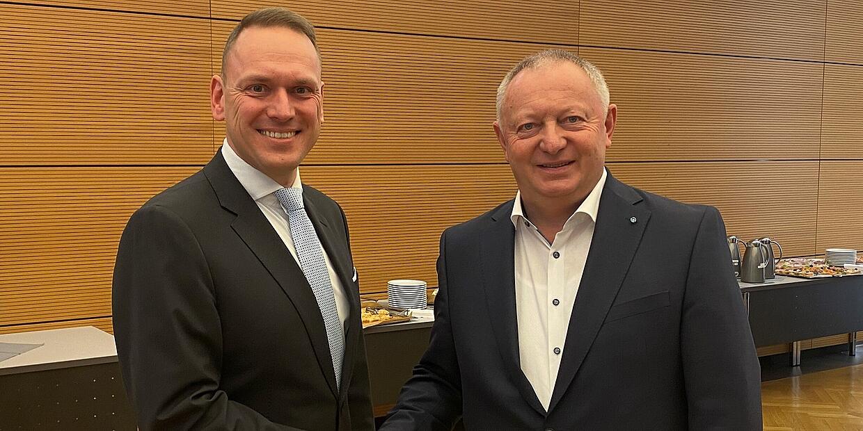 Mario Götz (CSU,links) ist neuer Landrat im Kreis Bad Kissingen. Rechts: Landrat Thomas Bold (CSU).