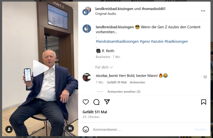 Insta-Reel von Thomas Bold Wenn der Landrat auf Instagram seine "Hood" vorstellt Screenshot von Instagram von Jana Schiener TEILEN  23.12.2024 Landkreis Bad Kissingen – Der Bad Kissinger Landrat Thomas Bold (CSU) spricht Jugendsprache. Das wirkt erstmal etwas unnatürlich, erntet aber viele positive Kommentare. Warum das Landratsamt das Video produziert hat. Artikel anhören Sie können uns nicht hören? Diese Funktion können Sie exklusiv mit PLUS nutzen. Erhalten Sie uneingeschränkten Zugriff auf alle Audioinhalte, Artikel und vieles mehr. Vorlesefunktion freischalten Bereits -Zugriff? Jetzt Anmelden Na, erwischt! Du bist wohl ein bisschen zu neugierig, was?