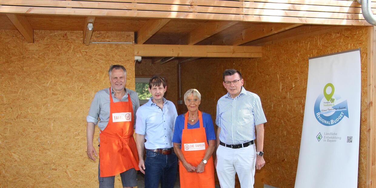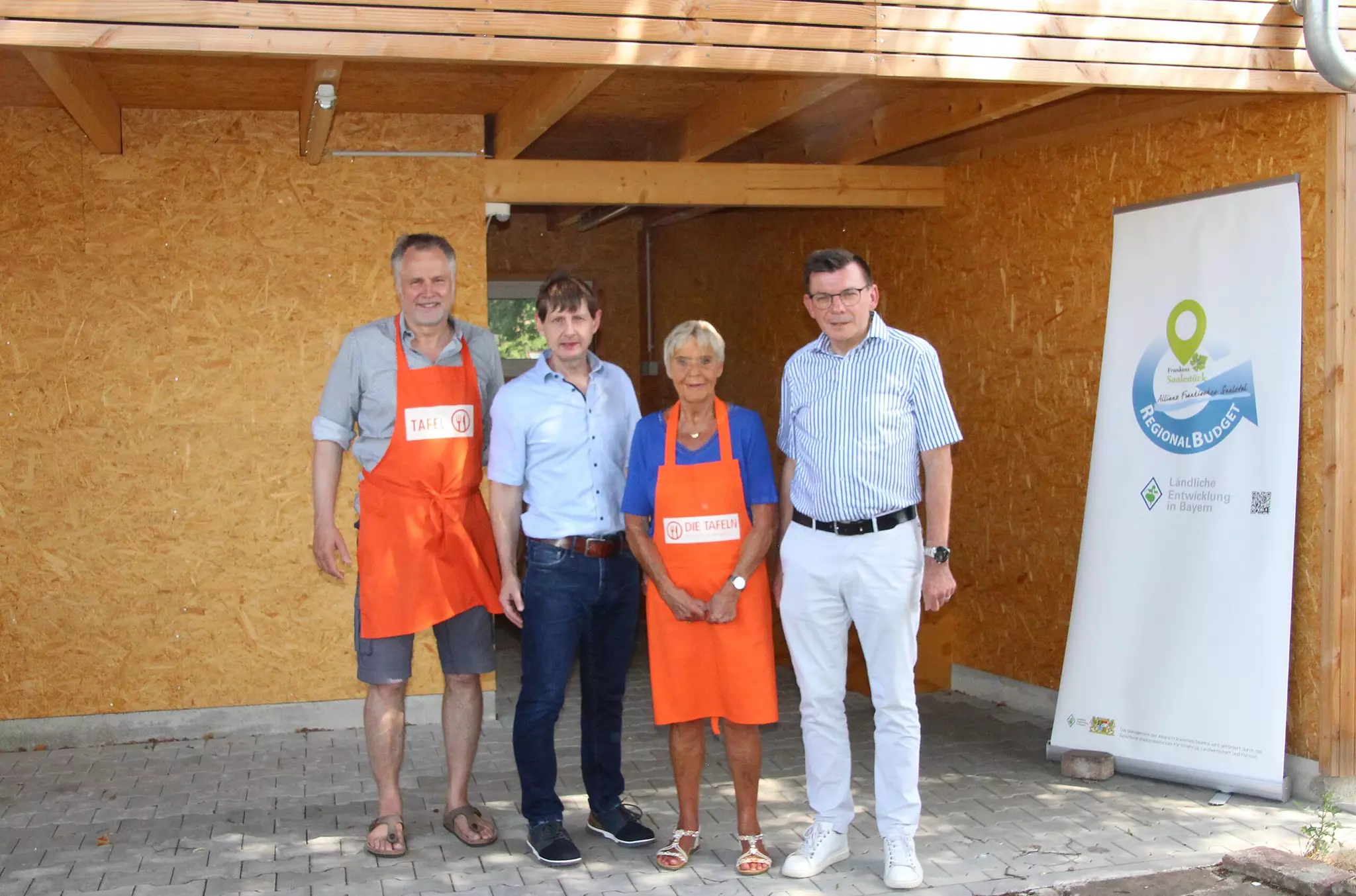 Förderung Nachhaltiges Häuschen für die Tafel -Kunden Der neue Unterstand der Hammelburger Tafel wurde offiziell seiner Bestimmung übergeben (von links) Patrick Bindrum, Holger Becker, Luise Smolik und Armin Warmuth // Winfried Ehling von Winfried Ehling TEILEN  28.06.2025 Hammelburg – Gleich mehrere Vorteile bietet das kleine Holzhäuschen bei der Hammelburger Tafel. Seit einiger Zeit steht ein Holzhäuschen im Umgriff des Tafel-Gebäudes neben dem Bahnhofsgelände in Hammelburg. Zunächst rätselhaft, entpuppte sich die schmucke Hütte jetzt als moderner und nachhaltiger Unterstand im Wartebereich der Tafel, der im Rahmen des Förderprogramms „Regionalbudget“ errichtet wurde. Jetzt offiziell übergeben, dient das Novum der Verbesserung der Aufenthaltsbedingungen für Kunden der Tafel und trägt gleichzeitig zur umweltfreundlichen Energieversorgung bei. Denn das Häuschen mit dem Grün-Dach ist mit Photovoltaik ausgestattet und kann 95 Prozent des erzeugten Stroms für den Eigenbedarf zur Verfügung stellen. Bei Hitze, Regen oder Schneefall ist der Unterstand ideal für Personen, die sich bei der Tafel mit gespendeten Lebensmitteln versorgen, so Tafelvorsitzender Patrick Bindrum. Der Hammelburger Baufirmeninhaber brachte in einem Joint venture-Projekt mit dem Regionalbudget der Allianz Fränkisches Saaletal diese sinnvolle Aufwertung zustande. Platz für einen kleinen PlauschNatürlich dient der Unterstand auch der Kommunikation und dem Austausch der Abholer. „Das Projekt ist ein Gewinn für die Tafel, zumal die umweltfreundlichen Aspekte beachtet und eingearbeitet wurden“, so der Allianzvorsitzende, Bürgermeister Armin Warmuth.Allianzmanager Holger Becker schilderte den Bauablauf. So wurde das Baufeld von Sträuchern und Hecken befreit, um eine ordentliche Baufläche zu schaffen. Für die Außen- und Zwischenwände wurden die Fundamentarbeiten durchgeführt, die eine stabile Basis für den Baukörper und die Langlebigkeit der Konstruktion gewährleisten. Die Außenwände sind in Holzrahmen-Bauweise errichtet, was eine umwelt-freundliche und effiziente Lösung bietet. Die Holzfassade fügt sich gut in die Umgebung ein, befand Becker. Balkonkraftwer als nachhaltige EnergiequelleDie Dachbegrünung verbessert das Mikroklima und sorgt für natürliche Wärmedämmung. Auf dem Dach befindet sich ein Balkonkraftwerk, das als nachhaltige Energiequelle genutzt wird. Die erzeugte Energie ist für das Laden von Mobiltelefonen und E-Bikes nutzbar, insbesondere aber für ein Lasten-Fahrrad mit einem Fassungsvermögen von einem Kubikmeter. Dieses Fahrzeug kann von den Fahrern im Stadtbereich zum Abholen von Lebensmitteln genutzt werden. In der Zwischenwand des Wartebereichs befindet sich ein moderner Monitor. Über diesen können sich Besucher über die Öffnungszeiten sowie über aktuelle Vorhaben informieren. „Durch den Bau wurde ein funktionaler, umweltfreundlicher Raum geschaffen, der nicht nur den Besucherinnen und Besuchern der Tafel dient, sondern auch die nachhaltige Energienutzung in den Vordergrund stellt“, waren sich die Anwesenden einig. Ein eventuelles Werbebanner in Richtung des Schrankenübergangs steht noch zur Disposition.