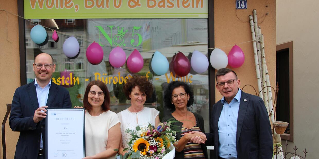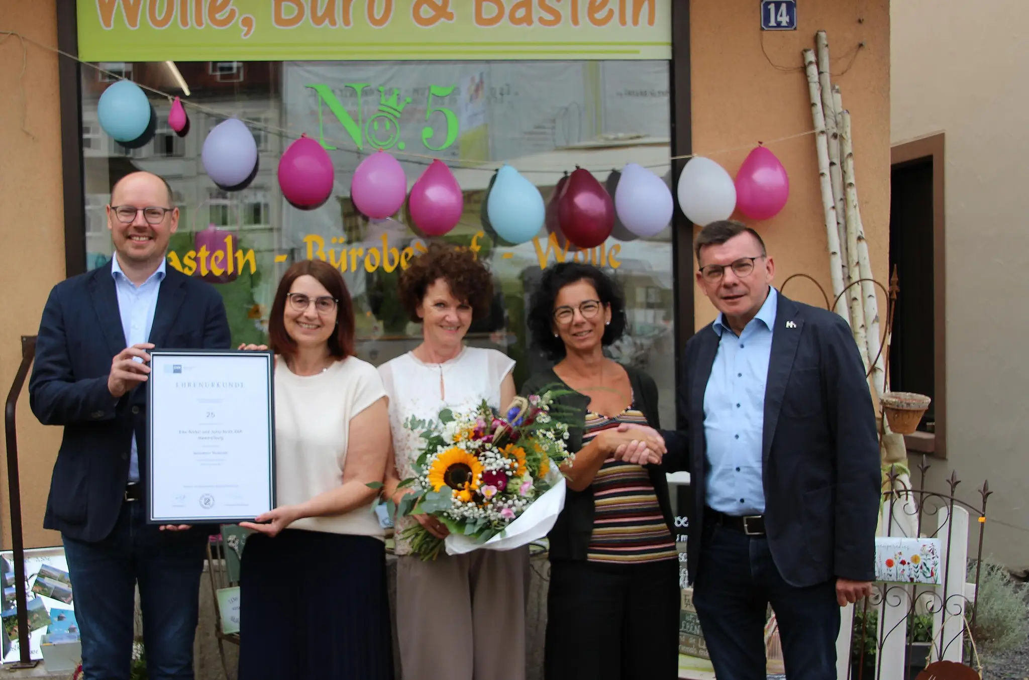 Geschäftsjubiläum 25 Jahre am Hammelburger Marktplatz Zum 25. Jubiläum des Geschäfts „No. 5“ am Marktplatz gratulierten IHK-Repräsentant Mathias Plath (links) und Bürgermeister Armin Warmuth (rechts) dem Geschäftsteam (von links) Elke Nickel, Gabi Wolf und Jutta Reith. // Winfried Ehhling von Winfried Ehling TEILEN  07.08.2024 Hammelburg – Vor 25 Jahren eröffnete das „No. 5“ am Marktplatz in Hammelburg. Vor 25 Jahren eröffnete das „No. 5“ am Marktplatz und darf heuer daher sein Geschäftsjubiläum feiern. Elke Nickel und Jutta Reith waren am 5. August 1999 die Initiatorinnen, die sich mit ihrer Idee durchsetzten und mit einem Fachgeschäft die Lücke in Hammelburgs „guter Stube“ füllten. Hier ist für jeden etwas dabei Dem inzwischen breitgefächerten Sortiment an Schreib- und Schulbedarf, Bastelartikeln, Geschenkideen, Deko-Artikeln sowie Wolle und Garnen wurden nach und nach weitere Varianten beigefügt, wie zum Beispiel Garten- und Hausschmuck – auch handmade und mit Reimen versehen – und in jüngerer Zeit die Erweiterung durch einen Buchservice, der vom „Bunten Buchladen“ übernommen wurde. Eine Auswahl von Glückwunschkarten rundet das Angebot ab. Ein gutes Team Die Inhaberinnen legen Wert auf guten Service und Kundenfreundlichkeit und brachten mehreren Praktikantinnen sowie einer Auszubildenden das Rüstzeug zum Einzelhandelskaufmann bei. Zum Personal zählen auch Gabi Wolf und Ruth Neder, die am Geschäftsbetrieb und bei Engpässen unterstützend mitwirkten. Gabi Wolf, der bei der kleinen Jubiläumsfeier ein besonderes Lob galt, praktiziert dies schon seit zwei Jahrzehnten. Auch „Blumenfrau“ Annette Günther gehört dem Team an. Vor zehn Jahren entstand die Woll-, Strick- und Häkelabteilung, die „Woll-Oase“ die nahezu alles bietet, was Strick-und Häkelbegeisterte für ihr Hobby benötigen. Dazu gibt es fachkundige Beratung und Arbeitsanleitungen. Eine schwere Zeit, man denke an die Pandemie und den Bau des nebenstehenden „Bürgerhauses“, meisterten die beiden Geschäftsfrauen und ihre Mitarbeiter mit Bravour. Eine Bereicherung für Hammelburg Bürgermeister Armin Warmuth sah in dem Geschäft „No. 5 “ „eine absolute Bereicherung für die Stadt“. Das Fachgeschäft, das auch Mitglied im Verein für Wirtschaft und Stadtmarketing (VWS) ist, nannte er eine „Marktplatzattraktion“. Zur Feierstunde traf Mathias Plath von der Industrie- und Handelskammer Würzburg-Schweinfurt (IHK) ein, der eine Ehrenurkunde überbrachte. „Wir freuen uns über einen starken Einzelhandel, der Kreativität, Warenauswahl und zufriedene Kunden mit sich bringt“, betonte er.
