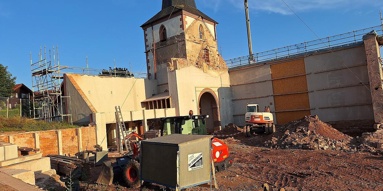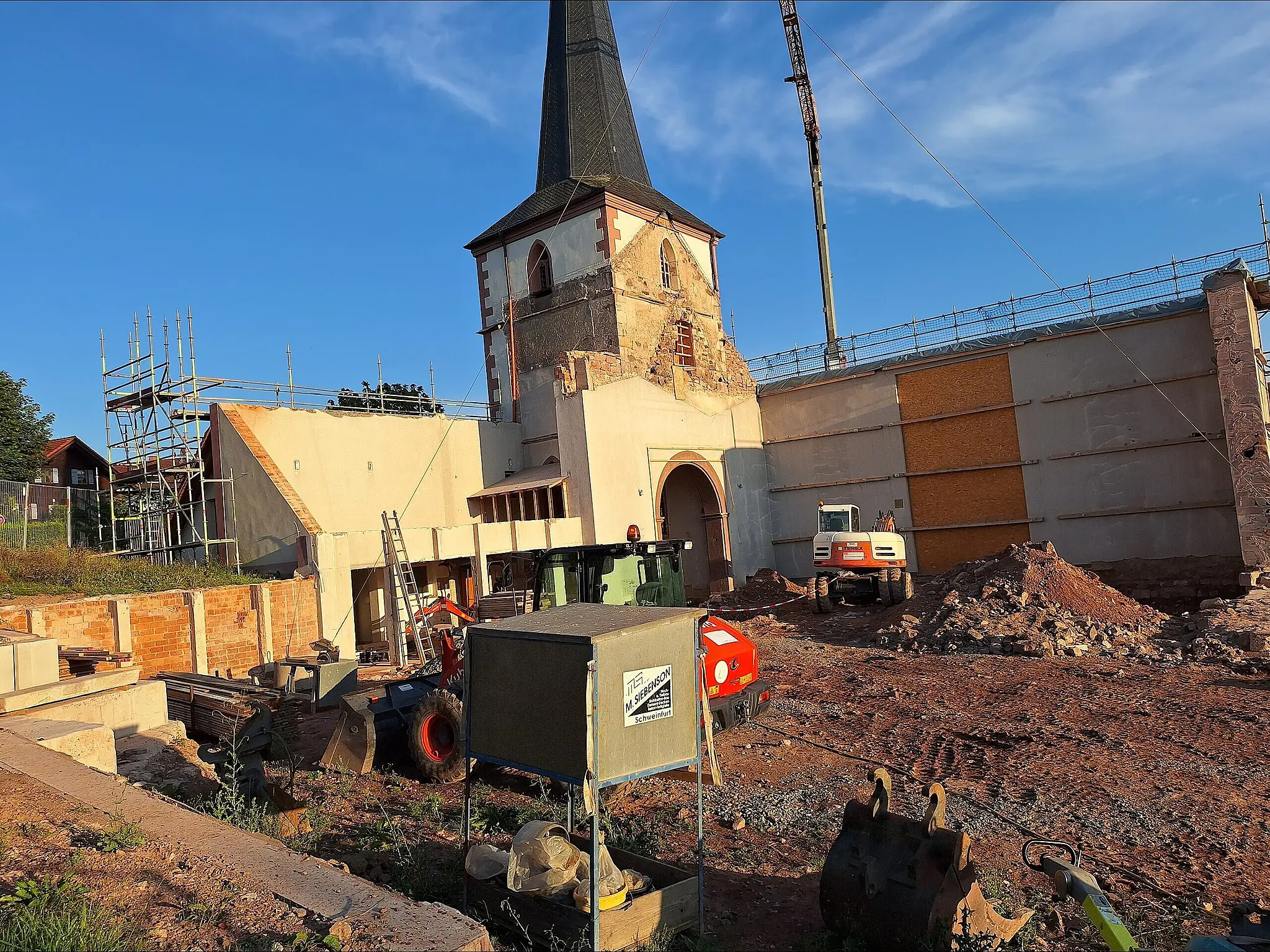 Pfarrkirche in Motten St. Bartholomäus: Wiederaufbau kommt endlich in Gang An der Mottener Kirche St. Bartholomäus hat etwas verzögert der Wiederaufbau begonnen. // Steffen Standke von Steffen Standke TEILEN  26.08.2024 Motten – An der Baustelle der Motten Pfarrkirche geht es wieder voran. Und zwar so, dass bald Neues zu sehen ist. Friedrich Staib als federführender Architekt hat mit Verzögerungen zu kämpfen. Viel steht nicht mehr vom einstigen Kirchenensemble von St. Bartholomäus in Motten: der wohl mittelalterliche Turm mit sogenannter Echterspitze, vom Friedhof aus gesehen links davon eine Außenwand der Sakristei, rechts die Süd- und Teile der Westwand des Kirchenschiffs aus dem 19. Jahrhundert. Seit einigen Wochen ist der große hallenartige Überbau aus den 1960er-Jahren verschwunden. Lediglich das Fenster „Blutendes Herz Mariens“ aus dem Jahr 1966 blieb - gut geschützt in der Südwand des Kirchenschiffes verpackt - erhalten. Seit der Rückbau vor rund sechs Wochen abgeschlossen wurde, besteht dieser Anblick schon. Und einige Mottener fragen sich, wann es weitergeht, wann endlich die Wände der neuen Kirche in den Himmel wachsen. Wiederaufbau sollte längst laufen Friedrich Staib, federführender Architekt aus Sommerhausen (Landkreis Würzburg), mag den aktuellen Zustand nicht. Er wollte viel weiter sein. Bis Ende 2023 sollte der Abbruch des für heutige Ansprüche viel zu großen und maroden Kirchenteils abgeschlossen sein, inklusive Entsorgung des Bauschutts. Im Frühjahr sollte der Wiederaufbau des dann viel kleineren Gotteshauses für nur noch 100 bis 130 statt 300 Gläubige ins Rollen kommen. Es war mal die Rede von einem Spatenstich im Mai (wir berichteten). Doch dann kam vieles anders. Es begann damit, dass der vorsichtige Rückbau sich insgesamt problematischer gestaltete als erhofft. „Das war eine ganz aufwendige Geschichte. Die große Dachlandschaft war kompliziert abzubauen. Wir mussten möglichst alle Schadstoffe entdecken, entfernen und vor allem: entsorgen“, sagt Staib. Schadstoff schwierig zu entsorgen Asbest und viele Mineralfasern fanden sich in Dach und Boden. Es war gar nicht so einfach, diesen „Sondermüll“ loszuwerden. Manches Material lag wochenlang „auf Halde“, ehe es fachgerecht entsorgt werden konnte. Insgesamt war der zum Jahreswechsel begonnene Rückbauprozess erst vor rund sechs Wochen abgeschlossen. Parallel plante Staibs Architekturbüro soweit, dass eine Firma für den neuen Rohbau gesucht werden konnte. Den Zuschlag erhielt die Firma Siebenson aus Schweinfurt. Kirchturm bekommt stabileres Fundament Seit einigen Tagen sorgt diese wieder für Bewegung auf der Baustelle. Laut dem Architekten nimmt sie „Untergrundstabilisierungen für das Fundament“ vor. Aufseiten der Sakristei wurde festgestellt, dass der historische Turm zu wenig Stabilität aufweist. Also wird er „unterfangen“, das heißt in mehreren Abschnitten mit Beton unterbaut. Auf der Südseite werden dann die Fundamente für das neue Kirchenschiff gegossen. Es soll einmal die Ausmaße des Gotteshauses aus dem 19. Jahrhundert abbilden. Dieses wurde in den 1960er-Jahren zugunsten einer modernen, den Ort noch mehr dominierenden Erweiterung weitgehend entfernt. Probleme mit Änderungen beim Dach Friedrich Staib ist zuversichtlich und „froh, dass es jetzt wieder richtig vorangeht, weil die nächsten Schritte klar sind“. Auf die Fundamente folge die Bodenplatte, darauf Wände mit Gerüsten. Im Herbst werden die Mottener davon auf jeden Fall etwas sehen können, verspricht der Architekt. Die Kirche wird wieder „geostet“ sein, Das heißt, der etwas verkleinerte Altar von 1966 wird am Chorbogen stehen. Die bisherige Ausrichtung nach Norden wird dsnn Geschichte sein. Dass das Dach bis zum Winter draufkommt, hält Friedrich Staib aber für utopisch. Denn genau mit diesem Gebäudeteil gab und gibt es Probleme. Denn die Blicke der Mottener sollen künftig nicht von einer waagerechten Decke begrenzt werden. Stattdessen soll eine dreieckige Dachkonstruktion, verkleidet mit Holz und mit heller Lasur versehen, einen räumlich weiteren, höheren Eindruck von St. Bartholomäus erwecken. Prüfstatik und Genehmigung vom Landratsamt fehlten Dafür hatte Staibs Büro bereits im September 2023 einen Änderungsantrag (Tektur) beim Landratsamt Bad Kissingen eingereicht - der laut dem Planer aber bis vor kurzem unbeschieden blieb. Außerdem stehe seit längerem die Prüfstatik - eine Bewertung, ob der Statiker seine Arbeit richtig gemacht hat - von der zuständigen Ingenieurgesellschaft aus Salz (Landkreis Rhön-Grabfeld) aus. Eigentlich sollte die zum Jahresbeginn vorliegen, so Staib. Ohne die Prüfstatik könne er die Ausschreibung für die Zimmererarbeiten nicht fertigmachen. Immerhin: Auf Anfrage teilt das Landratsamt dieser Redaktion mit, dass Staibs Tekturantrag zeitnah genehmigt wird. Kirche soll nächstes Jahr fertig sein Trotz aller Schwierigkeiten bleibt der Sommerhäuser Architekt ehrgeizig, will, dass die Kirchenbaustelle St. Bartholomäus im nächsten Jahr auf jeden Fall fertig wird. Zuversichtlich stimmt ihn, dass bei den Kosten bisher alles im grünen Bereich geblieben ist. Auch der Rückbau habe trotz der aufwendig zu entsorgenden Materialen nicht mehr gekostet als vorausberechnet. Mehr zu St Bartholomäus in Motten lesen Sie hier: Projekt Für den Altar braucht es den Autokran Der Rückbau der entweihten Kirche St. Bartholomäus ist in vollem Gange. Mit schwerem Gerät werden die Figuren der Heiligen abtransportiert. Umstrukturierung Sanierung möglich: Zwei weitere Kirchen in Kategorie B Neben der Stadtkirche von Bad Brückenau sind künftig auch in Wildflecken und Oberleichtersbach Sanierungen möglich. Bei anderen kirchlichen Immobilien bleibt die Zukunft ungeklärt.