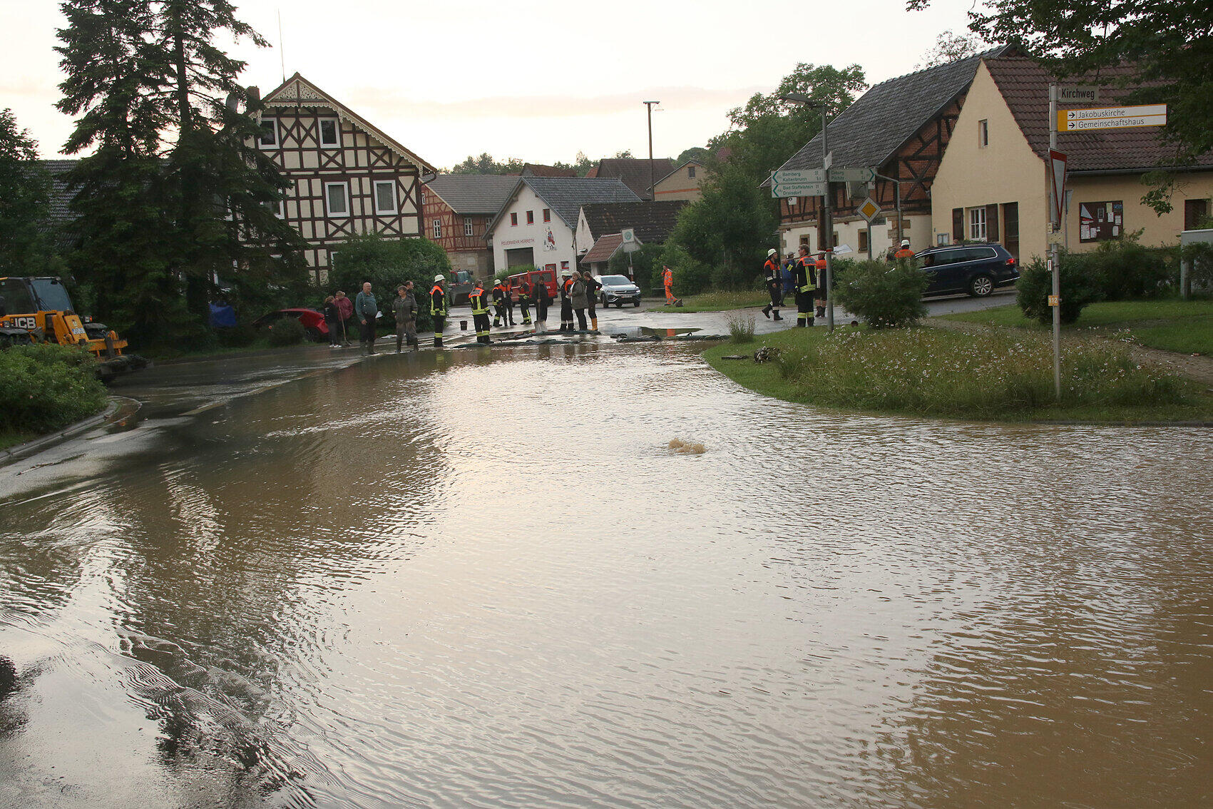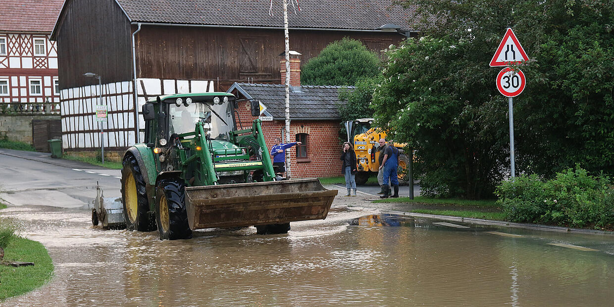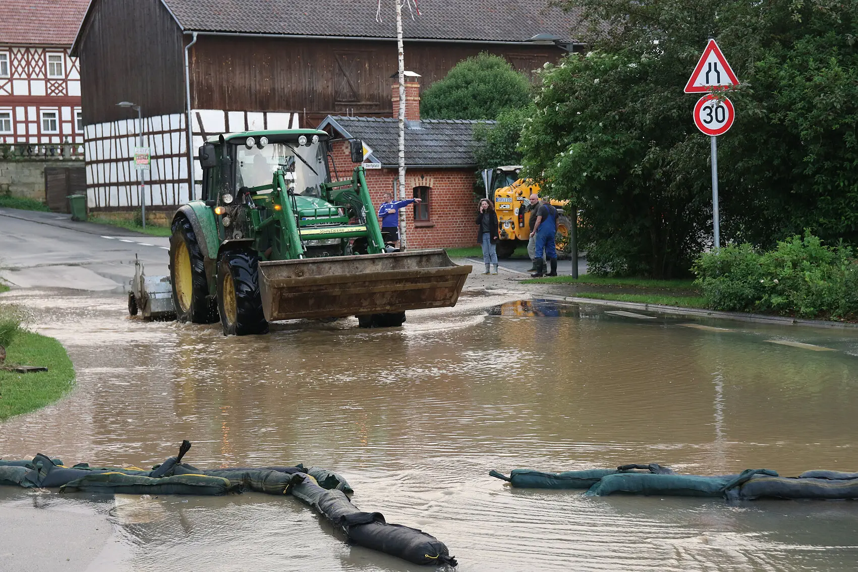 Starkregen Überschwemmungen in Rossach und Herreth Die Ortsdurchfahrt Herreth war überflutet. // Michael Stelzner Die Ortsdurchfahrt Herreth war überflutet. // Michael Stelzner In Rossach war die Waldstraße betroffen. // Michael Stelzner Auch auf Feldern gab es Überschwemmungen. // Michael Stelzner In Rossach war die Waldstraße betroffen. // Michael Stelzner In Rossach war die Waldstraße betroffen. // Michael Stelzner Auch auf Wiesen gab es Überschwemmungen. // Michael Stelzner von Michael Stelzner TEILEN  03.06.2024 Coburg – Der Starkregen sorgte am Wochenende für Einsätze in Rossach und Herreth. Die Feuerwehren aus Großheirath und Itzgrund sowie das THW waren am Wochenende im Dauereinsatz. Schon am Samstag in den Abendstunden rückten die Wehren aus und haben Keller und Gullys, die die Wassermassen nicht mehr schafften, leer gepumpt. Überall an den Hauseingängen lagen Sandsäcke. Die Ortsdurchfahrt Herreth war überflutet. // Michael Stelzner Am Sonntagabend wieder das gleiche Spiel. „Wir hatten die Schlammmassen vom Samstag beseitigt, am Sonntagabend nach 10 Minuten Starkregen waren die Schlammmassen wieder da“, sagt eine Anwohnerin in der Waldstraße in Rossach, wo die Feuerwehr auch am Sonntag in den Abendstunden einige Keller auspumpen musste. In Herreth, einem Ortsteil der Gemeinde Itzgrund, war die Ortsdurchfahrt überflutet und wurde deshalb durch die Feuerwehr gesperrt. +++ Bleiben Sie mit dem Coburger Tageblatt auf dem Laufenden und holen Sie sich jetzt unsere kostenlosen Newsletter. +++ Lesen Sie auch: Heftiger Regen am Wochenende Feuerwehren im Dauereinsatz: Unwetter-Bilanz für die Region Von Freitag bis Sonntag regnet es vielerorts heftig. Örtlich kommt es zu überschwemmten Straßen, und Keller laufen voll Wasser. Die Feuerwehren hatten vielerorts alle Hände voll zu tun.
