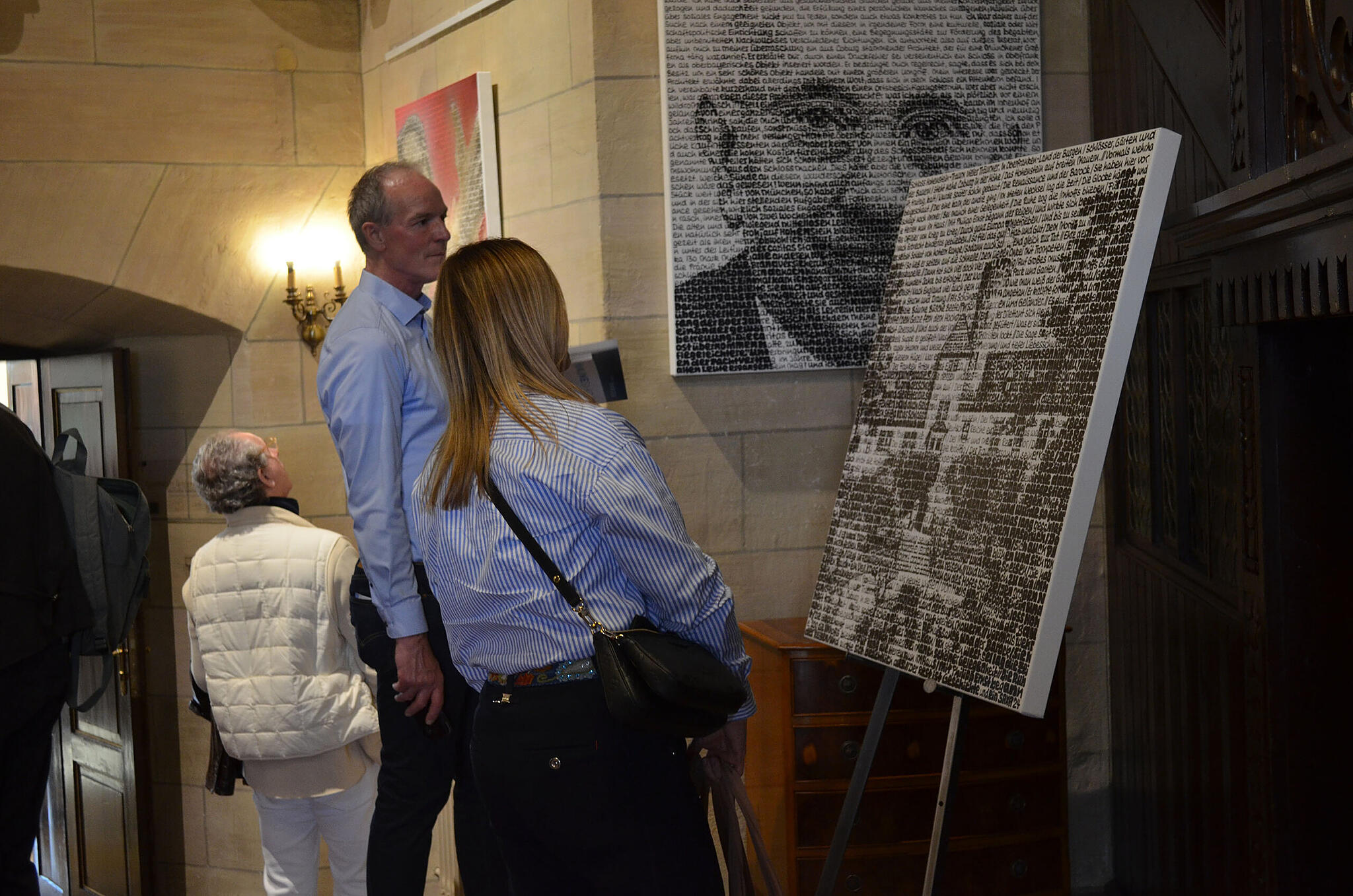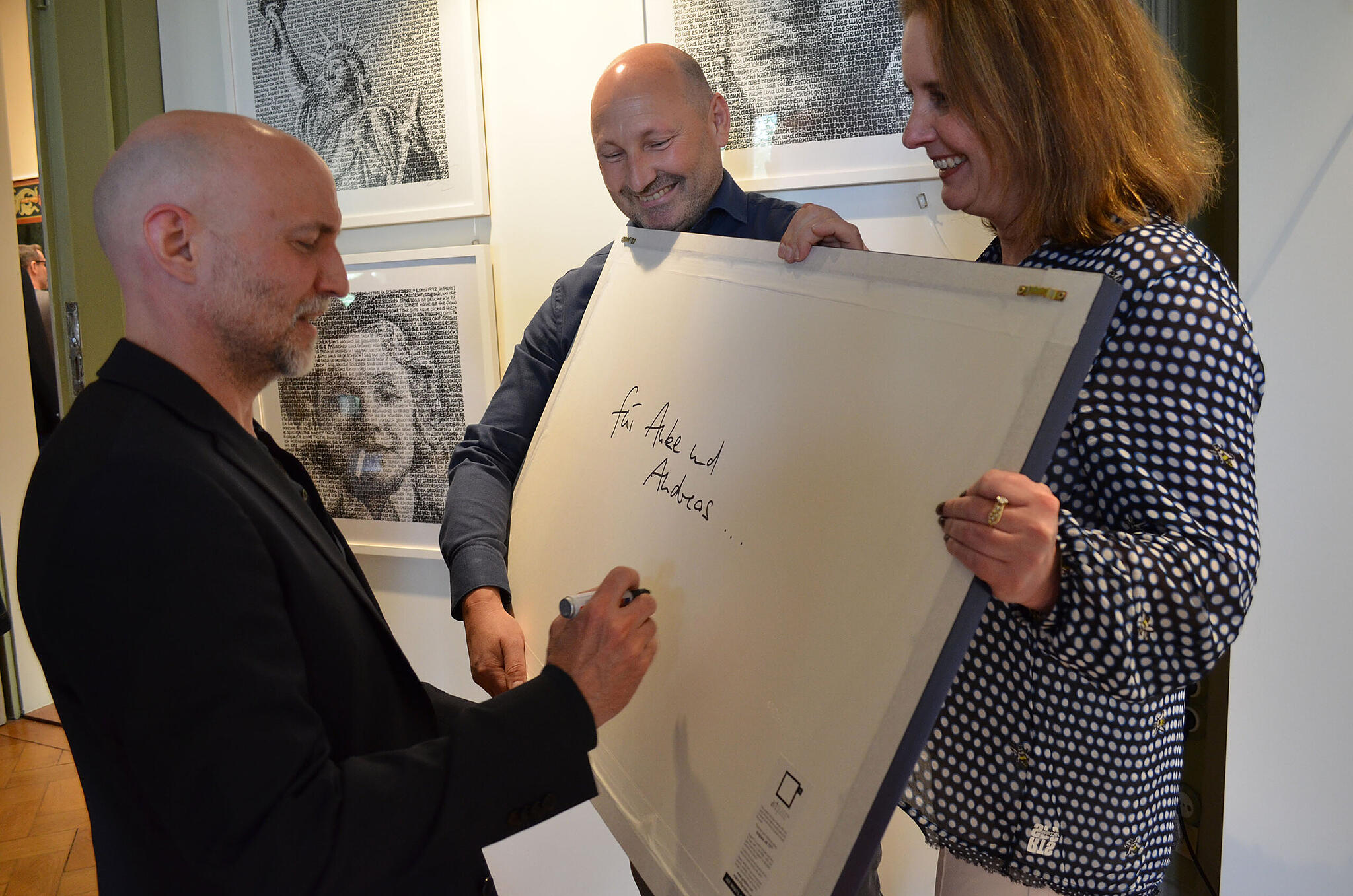 Ausstellung auf Hohenstein Künstler "Saxa" brilliert in Ahorn mit neuem Werk Saxa vor seinem neuen Werk „Schloss Hohenstein“. // Gabi Bertram von Gabi Bertram TEILEN  14.04.2024 Ahorn – Aus Worten formt er Bilder und gibt ihnen so eine ungeheure Tiefe: Sascha Lehmann, alias Saxa. Auf Schloss Hohenstein ist bis Ende Juni seine Ausstellung "Bilder, Bilder, nichts als Worte..." zu sehen. Andreas Kramer ist an diesem Wochenende mit seiner Frau Anke aus Burg bei Magdeburg angereist. Ziel: Schloss Hohenstein und die Ausstellungseröffnung „Saxa – Bilder, Bilder, nichts als Worte…“ Mit des Künstlers Werken sind die beiden bei einer Schiffsreise einer Kunstgalerie nebst Ausstellung in Berührung gekommen. Kunst mit Worten bringt "Tiefe in Bilder" Von Anfang an, schwärmt Andreas Kramer, sei er begeistert gewesen. „Die Kunst mit Worten ist so spannend und bringt eine solche Tiefe in Bilder, und deshalb werde ich heute ein Werk kaufen für mein Büro.“ Der rote Punkt klebt schon auf dem Bild mit den beeindruckend himmelblauen Augen der Romy Schneider. Saxa schreibt „The Rolling Stones“ völlig neu. // Gabi Bertram Saxa schreibt Bilder – mit Geschichte, Autobiografischem und Gedichten, alles aus seiner Feder neu geformt. Er lässt Worte zu Bildern werden. Er schreibt „The Rolling Stones“ neu, legt in die Porträts von Bruce Springsteen und John Lennon erstaunliche räumliche Tiefe, und er hat vor drei Jahren im Auftrag der Oskar-Hacker-Stiftung Schloss Hohenstein das Porträt des Stiftungsgründers geschrieben, das im Eingangsbereich zum Gartensalon des Schlosses zu bewundern ist. Saxa brilliert in Ahorn mit neuem Werk Nun brilliert Saxa mit einem neuen Werk, das zur Ausstellungseröffnung am Samstag enthüllt wird: Schloss Hohenstein – zauberhaft bis ins Detail gearbeitet, natürlich mit Worten. Grundlage des Textes, erzählt der Künstler, sei der Text von Egon Greipl, Kuratoriumsvorsitzender, über die Geschichte des Schlosses. Andreas Kramer und seine Frau Anke sind begeistert von Saxas Werken und lassen sich die „Augen von Romy Schneider“ signieren. // Gabi Bertram Allerdings habe er aus dem vielseitigen historischen Elaborat eine Quintessenz gezogen. 28 Strophen sind es und über 4500 Zeichen, die sich nun in unterschiedlicher Dicke und verschiedenen Abständen der Buchstaben auf dem Bild zu Schloss Hohenstein formen und dessen Geschichte in Saxas Zeilen lebendig werden lassen. Spiegelsaal auf Schloss Hohenstein voll besetzt Der Spiegelsaal auf Schloss Hohenstein ist komplett gefüllt. „Meet the Artist“ hat die Kunstkenner auf den Plan gelockt, und Saxa ist ein Künstler zum Anfassen, der charmant zu plaudern versteht und die Besucher seine Sphären mitzunehmen versteht. Manuel Moosherr, Geschäftsführer von Modern Art, nennt ihn den Michelangelo seines Fachs, der aus Buchstaben Bilder entstehen lässt, weltweit einmalig und unverkennbar in seiner ganz eigenen Handschrift. Andreas Kramer und seine Frau Anke sind begeistert von Saxas Werken und lassen sich die „Augen von Romy Schneider“ signieren. // Gabi Bertram Er verstehe es mit Brillanz, den Charakter der Personen darzustellen und diesen in einen Kontext zu setzen, der Sprache und Schrift zum Kunstwerk vereint. Worte, die Leidenschaft sind und Bilder sprechen lassen. Wie aus Sascha Saxa wurde, erzählt der Künstler selbst. Irgendwo in Katalonien hatten in die mehrsprachigen Ortsschilder in seiner Affinität zu Worten inspiriert. +++ Bleiben Sie mit dem Coburger Tageblatt auf dem Laufenden und holen Sie sich jetzt unsere kostenlosen Newsletter. +++ Und so wurde Saxa kreiert, der gern malte und Gedichte schrieb und schon frühzeitig – noch vor seinem Medizinstudium - eigene Ausstellungen bestritt. Immer auf der Suche nach Titeln für seine Bilder, denn ohne geht für ihn gar nicht, hat er eines Tages Gedichte dazu geschrieben. Und dann die figurativen Bilder in klarer Form und die dazu verfassten Gedichte auf eine Ebene gebracht. Die Idee der Wortmalerei war geboren. Die Ausstellung des Künstlers Saxa „Bilder, Bilder, nichts als Worte“ findet bereits am Eröffnungstag höchste Anerkennung. // Gabi Bertram Sprache und Handschrift sind für Saxa eins, weil es die Hand-Hirn-Koordination ist, die den Kopf mitnimmt. Wer schon einmal in Schulzeiten einen Spickzettel geschrieben hat, sagt er, wird wissen, dass er diesen am Ende gar nicht gebraucht hat, weil der Text sich eingeprägt hat. „Das kann die ganze Digitalisierung nicht bieten“, meint Saxa. Ralph Veil, der gemeinsam mit Manuel Moosherr das neue Kunstwerk enthüllt, ist sichtlich gerührt. // Gabi Bertram Dann gibt er ein paar Kostproben seiner Lyrik, liest einige der 28 Strophen vor, die das neue Werk Schloss Hohenstein bilden, das zu enthüllen Ralph Veil, Vorstandsvorsitzender der Oskar-Hacker-Stiftung und dessen Neffe, gemeinsam mit Manuel Moosherr die Ehre hatte – mit sichtlicher Rührung und herzlichen Dankesworten an den Künstler. Schloss Hohenstein: Ausstellung läuft bis 30. Juni 2024 Die Ausstellung auf Schloss Hohenstein, die im Gartensalon sowie im grünen und im blauen Salon zu sehen ist, kann noch bis zum 30. Juni zu den Öffnungszeiten Freitag bis Sonntag jeweils von 10 bis 18 Uhr besichtigt werden. Lesen Sie auch: